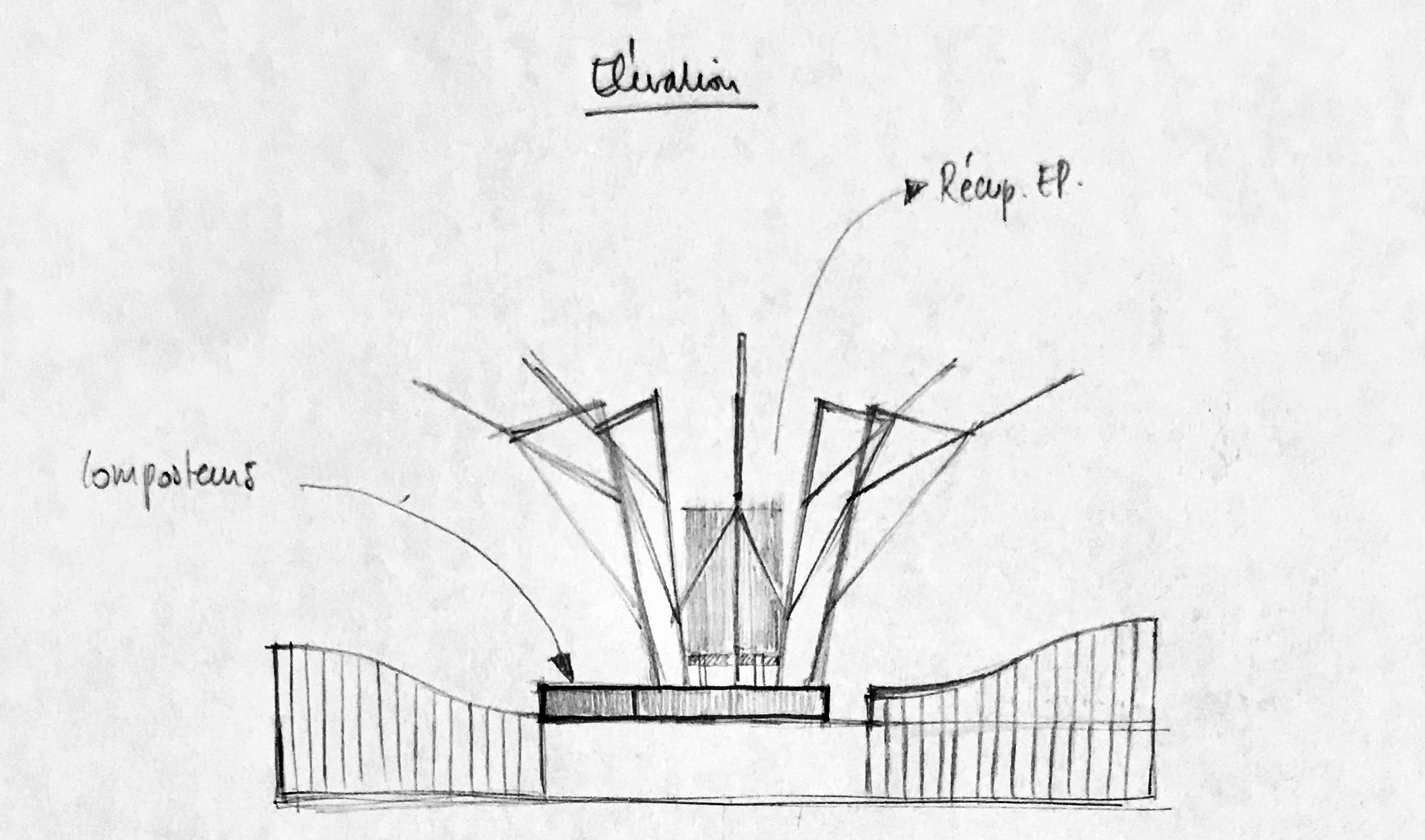 La forme est inspirée d'une fleur en corolle par biomimétisme, tel un entonnoir qui collecte les gouttes de pluie.