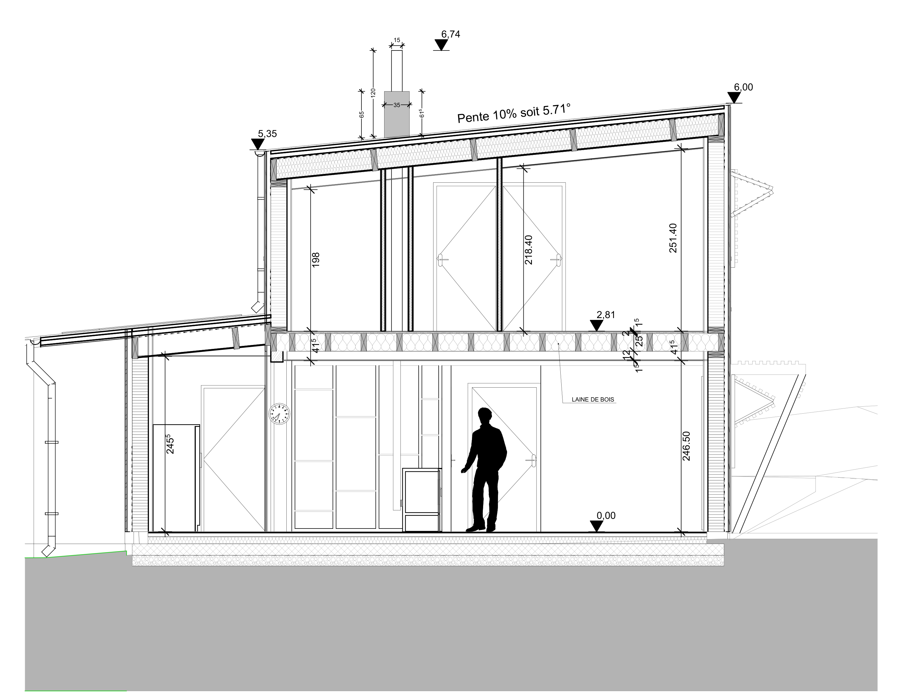 Approche environnementale : Il s'agit d'une maison avec un volume simple, très compact, une toiture monopente. La pente est orientée vers le nord, dans le même sens que la pente naturelle du terrain, apportant ainsi une cohérence par rapport à l'écoulement de l'eau de pluie sur la parcelle. La façade est généreusement ouverte au Sud et protégée au Nord par un cellier. L’enveloppe thermique performante permet de limiter les équipements : un poêle à bois de faible puissance suffit à chauffer les 100m² de surface habitable, tandis qu’un chauffe eau solaire profite de l’orientation plein Sud de la maison.