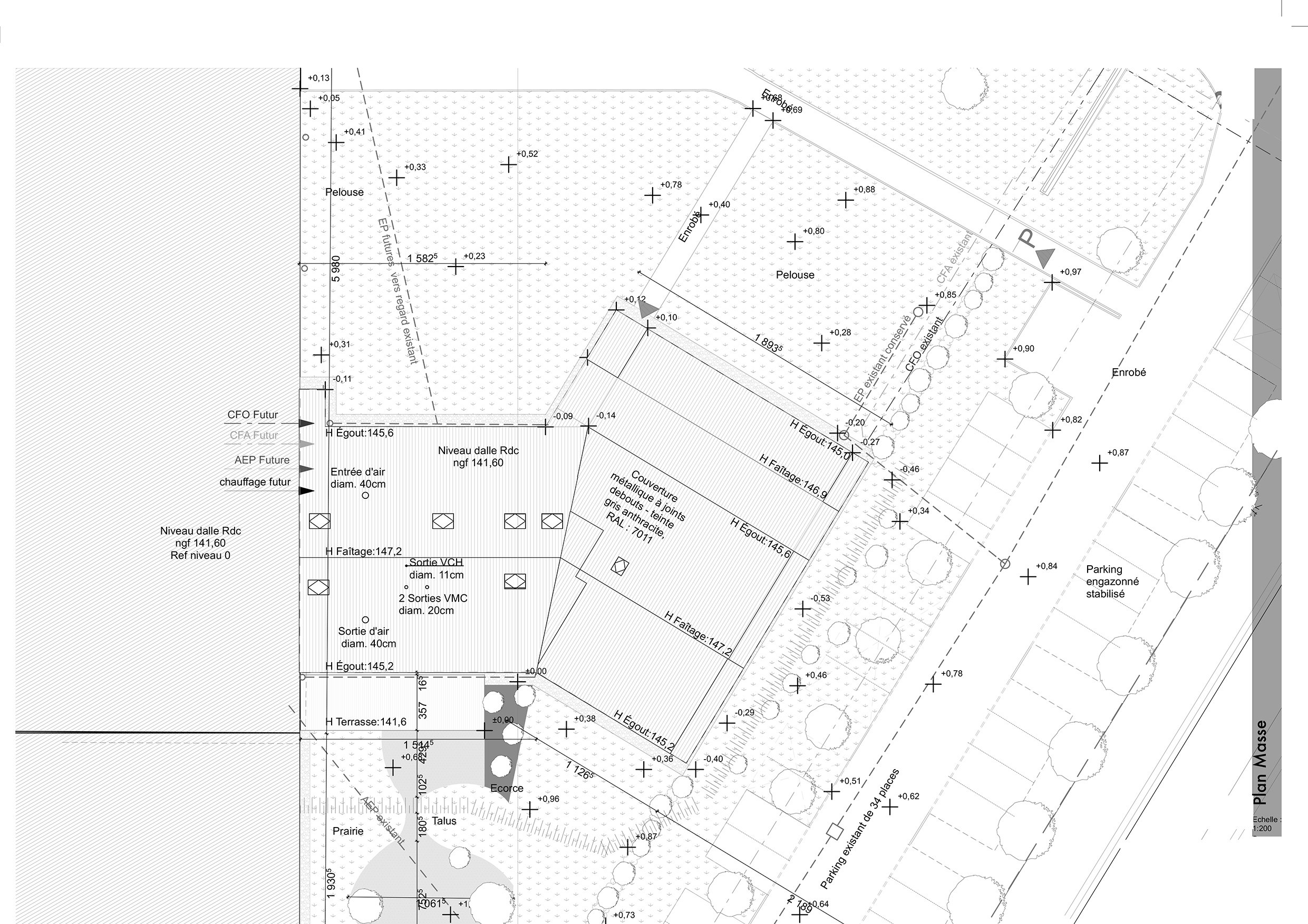 Approche environnementale : Le projet est situé en zone artisanale, un paysage où se mêlent sites industriels et espaces naturels. Notre agence est missionnée pour réaliser une construction neuve, qui doit être juxtaposée à l'usine de production de la société Socomore. Cette usine est une immense construction métallique posée dans le paysage. Très vite, nous avons fait le choix d'une écriture entre nature et industrie. Les matériaux employés en sont le reflet. Les murs à ossature bois préfabriqués en paille offrent un confort à la fois thermique et acoustique. Le bardage est en cèdre breton ou en aluminium à joint debout.