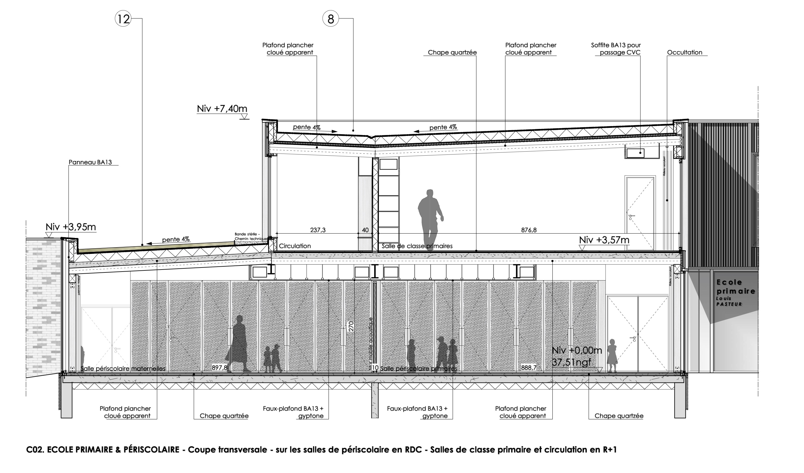 Descriptif technique : Dès la phase de conception nous avons choisi pour les planchers de l’étage de réaliser des planchers collaborant bois/béton, en utilisant le peuplier. Ce choix technique a été guidé par un double objectif : - Architectural : Montrer le bois dans son utilisation en structure, la dalle ainsi constituée formant le plafond du Rez-de-Chaussée - Acoustique : les redents formés par le décalage des planches clouées offrent un piège à son idéal complété par un absorbant acoustique en fond de nervure Ce plancher collaborant a été l’occasion d’un travail de Recherche Développement au travers d’un Atex.