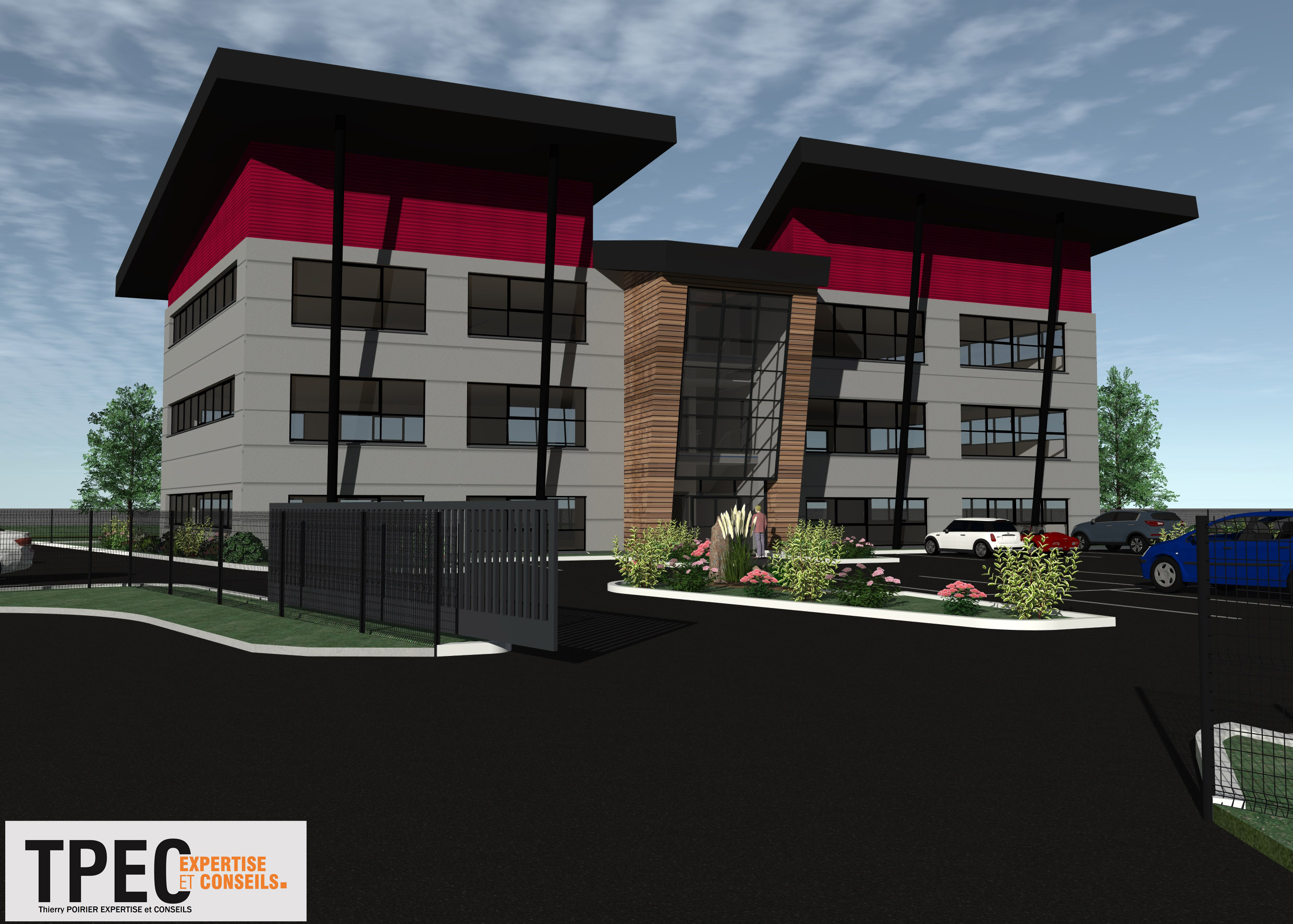Descriptif technique : Bâtiment tertiaire R+2 en charpente lamellée-collée et murs à ossature bois. Fût central cage d'ascenseur et escalier en maçonnerie. Toitures croisées entièrement végétalisées. Menuiseries extérieures en aluminium et verre à traitement thermique. Plancher mixte bois / bac collaborant + béton Climatisation 3 tubes permettant un confort optimum en fonction des bureaux et leurs expositions.