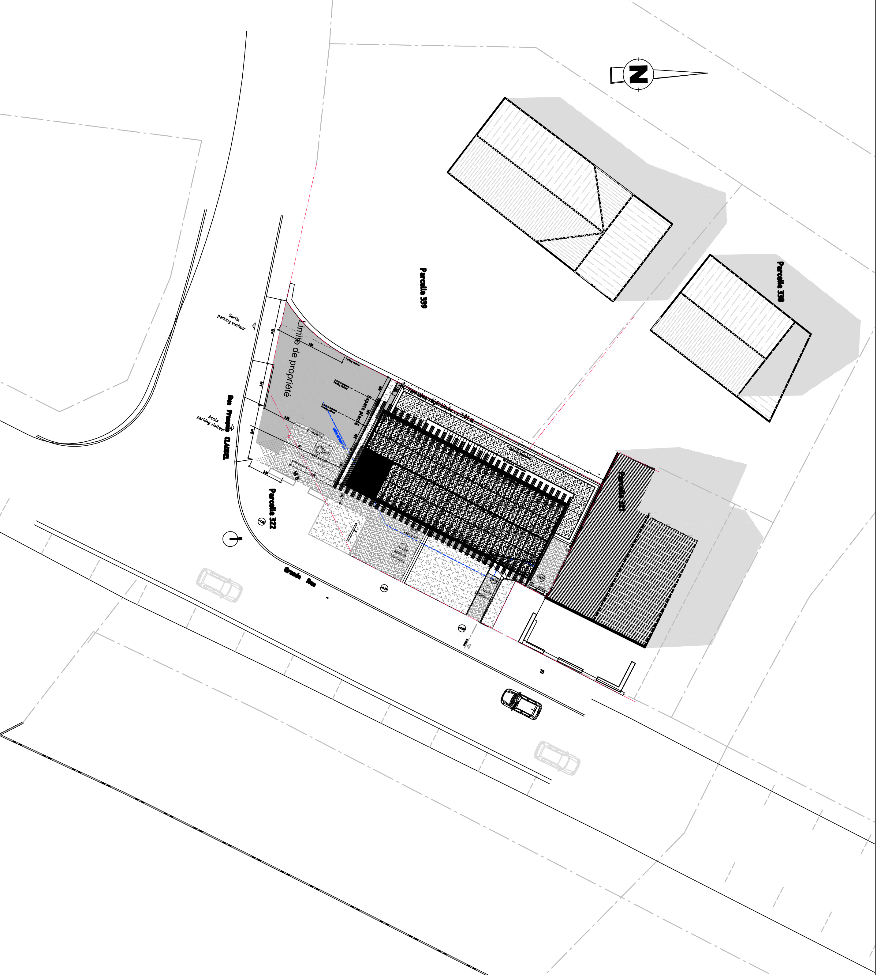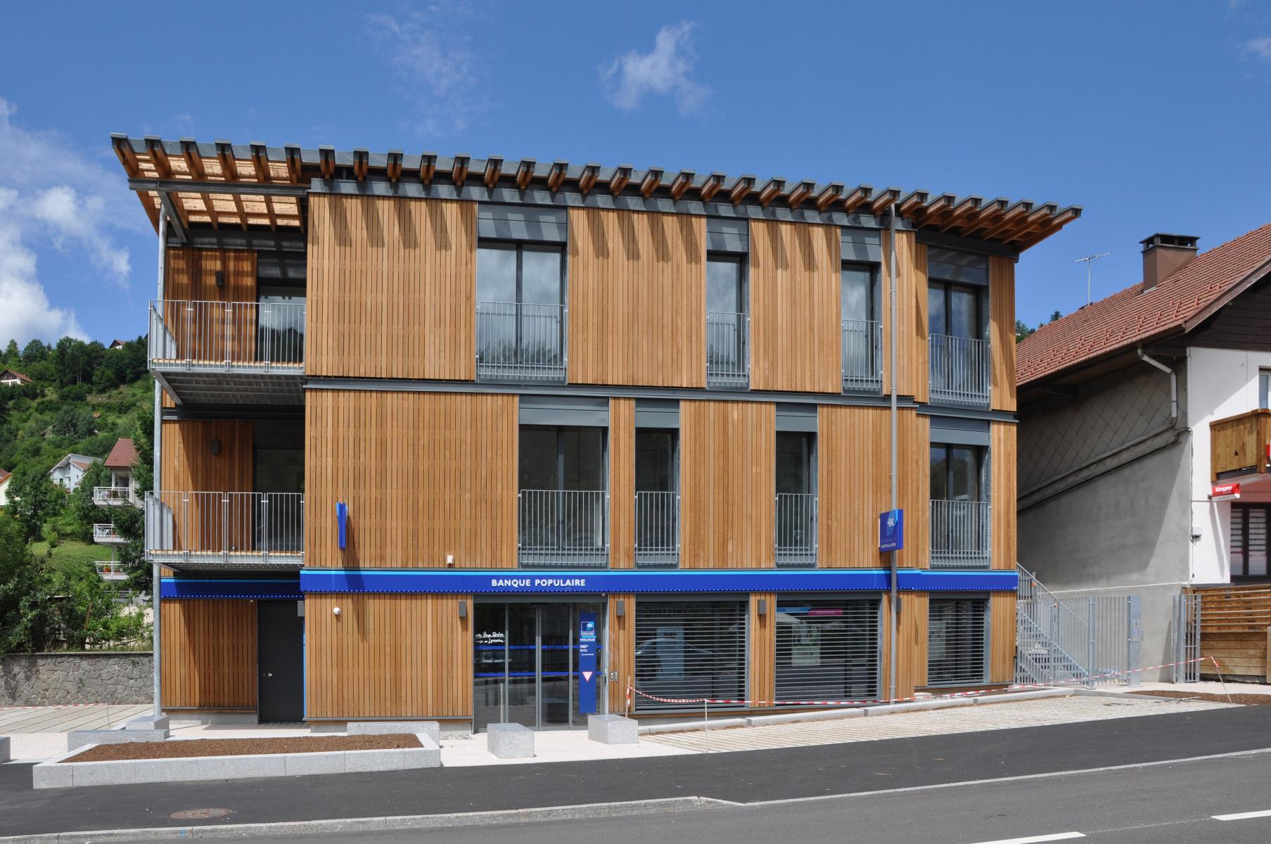 Après démolition du garage existant, le projet prévoit un nouveau bâtiment de 3 niveaux comportant : RDC,une agence bancaire, en R+1, R+2 : 3 logements et un réaménagement des abords extérieurs (matériaux perméables). Le nouveau bâtiment s'implante accolé aux limites N-O et N-E de la parcelle en RDC. Les niveaux supérieurs sont en retrait de ces limites. -Façades en bardage bois vertical à claire-voie en red cedar brossé et sur lequel on a appliqué un saturateur. Des lignes de serrurerie - zinguerie viennent découper le bardage à chaque niveau -Menuiseries en bois-alu Un couronnement chapeaute l'ensemble : -Structure apparente ("doigts de peigne") en mélèze brut, protégé par des éléments de tôles laqués pliés -Couverture angle Sud en polycarbonate transparent