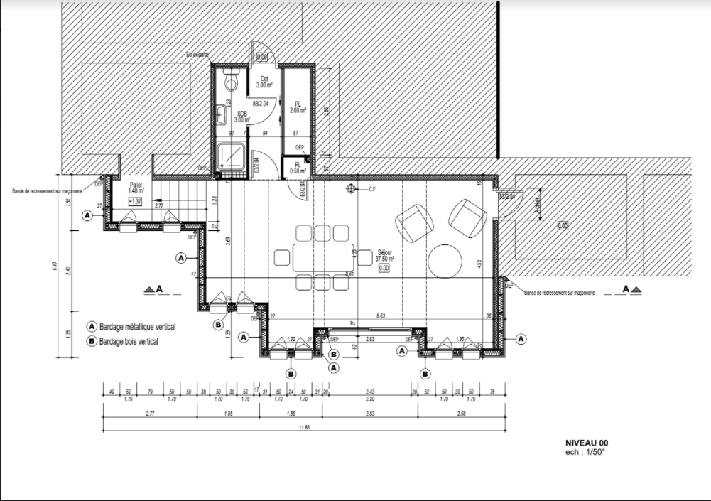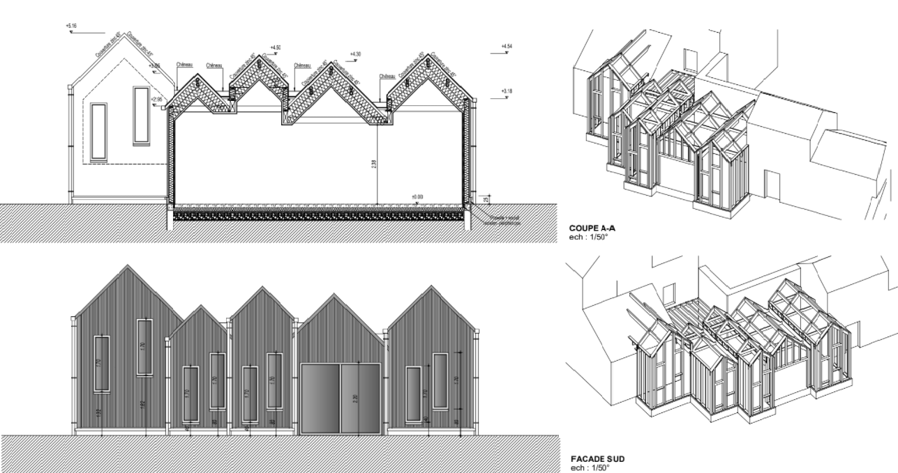 Descriptif technique : Bioclimatisme : Orientation sud de tous les ouvrants (apports solaires passifs) et toit plein (éviter les surchauffes d'été). Murs en ossature bois avec traverses hautes et basses contreventés en OSB, isolés en 145 + 50 mm de laine de bois. Charpente composée de chevrons porteurs en Douglas et épicéa en fond de chéneau. Isolation en toiture de 400mm en laine de bois + 50 en Pavatex (pare-pluie) sous zinc. L'étanchéité à l'air a été traitée avec un film pare-vapeur. Bardage Douglas naturel 45*45 pose verticale avec lattage et contre lattage.