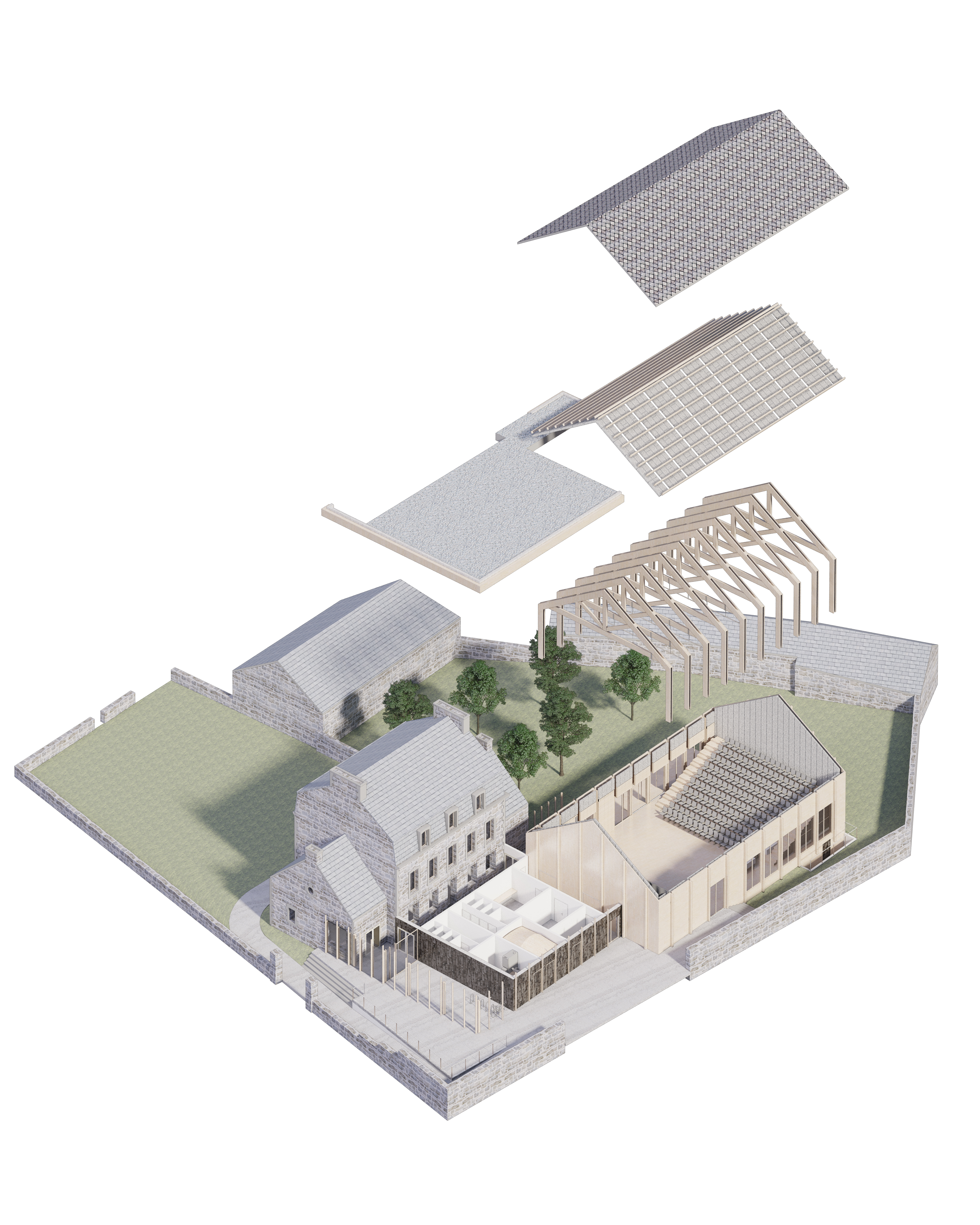 La salle culturelle fait partie d’une démarche globale visant à retendre des liens vers une centralité de bourg archétypale, autour du marché, de l’église et de la mairie. A cela, s’ajoute la complexité d’un programme qui va au-delà d’une simple salle des fêtes : une salle avec gradin télescopique pour 200 personnes assises ou 320 debouts, des salles associatives, un « grand salon », un bar et un office dans le RDC de l’ancien presbytère, des locaux de stockages et des loges. Il s'agit de questionner cette typologie et de sortir de l’objet standard tant retrouvé dans les communes rurales.