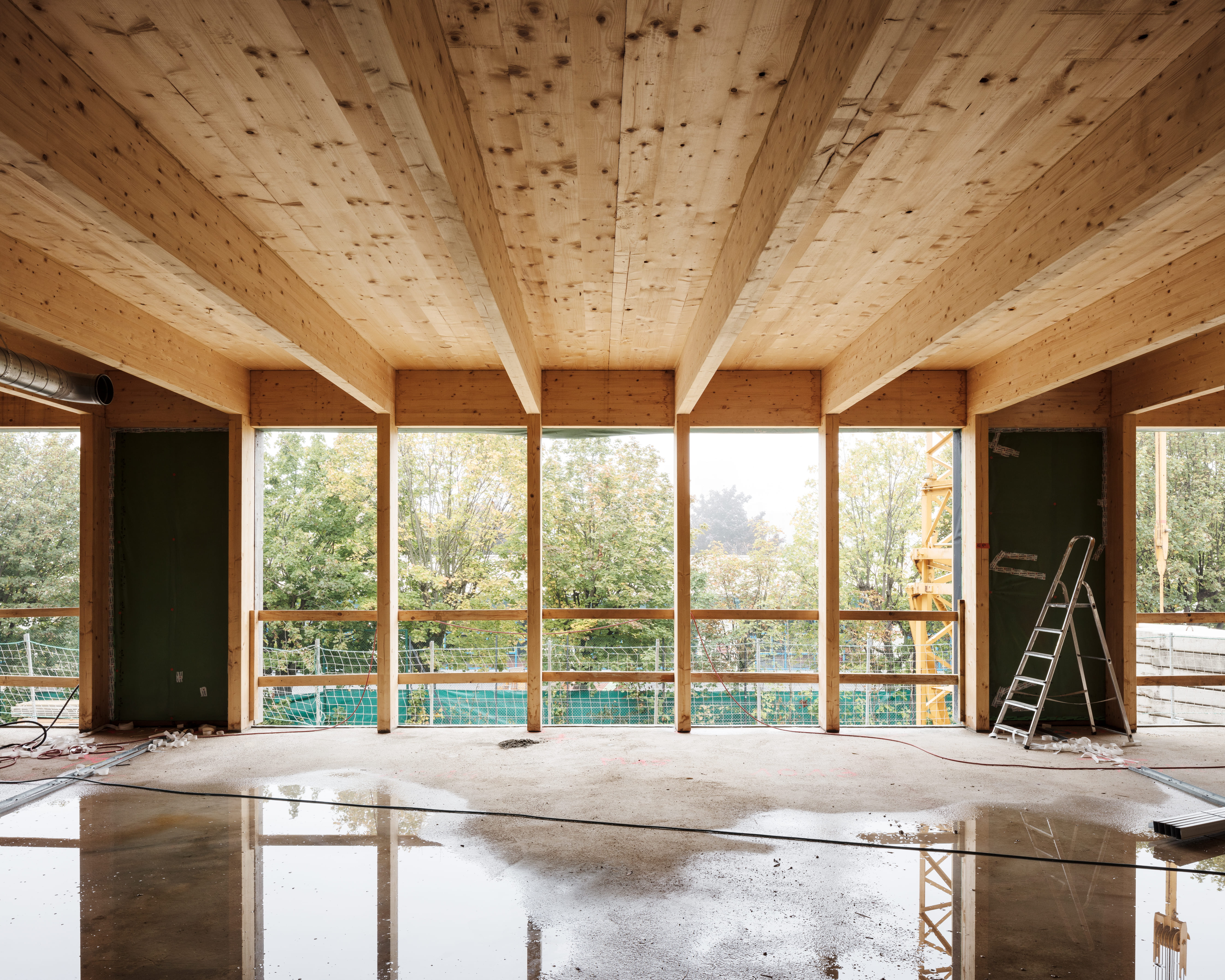 Descriptif technique : Pour les niveaux supérieurs, et dans un souci de maîtrise des temps de chantier et d'engagement écologique, la conception s’est orientée vers une structure bois en caissons de CLT nervurés, les façades sont composées de Murs à Ossatures Bois préfabriqués, la toiture est réalisé en dalle CLT. Les façades sont réalisées en bardage bois vertical. Le rez-de-chaussée accueille les fonctions techniques comme la cuisine, réalisé en structure poteaux-poutres en béton, ses façades sont constituées de pierre autoporteuses calcaires claires extraites à moins de 100 Km du site. PEFC (Gestion forestière durable)