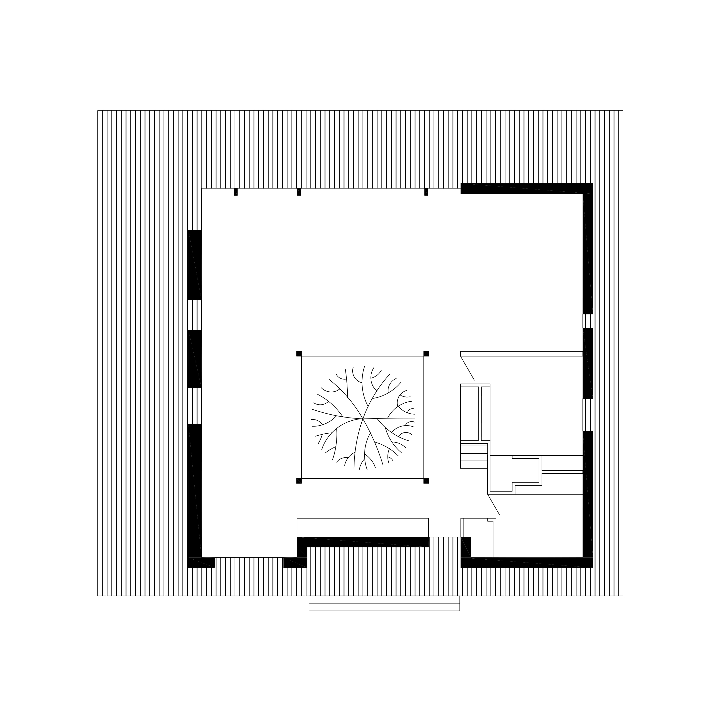 La maison à Patio tire parti du cadre naturel du site en s’ouvrant sur le paysage lacustre du golf. Dans l’idée d’une lecture de lignes horizontales dans le paysage, les deux toitures et la terrasse se superposent en débord du clos bâti. Elles sont ponctuellement évidées pour laisser passer la végétation et la lumière. Pour limiter au maximum l’impact sur le site, le bâtiment en ossature bois se pose sur des pieux vissés, la toiture terrasse est végétalisée, un patio intérieur amène lumière et nature au sein de la maison. Les façades se déclinent entre bardage en tasseaux de bois et vitrage.