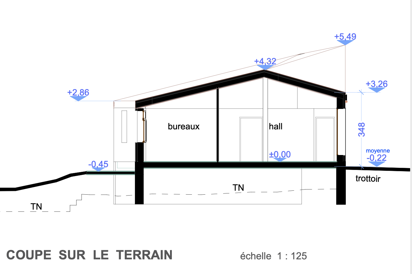 Bâtiment ERP à usage de bureaux, RDC sur vide sanitaire. Panneaux ossature bois. Charpente chaude en bois. Toiture en panneaux Unilin Trilate HPU R=8,85. Bardage vertical bois. Menuiserie extérieure bois en peinture Falun noire.