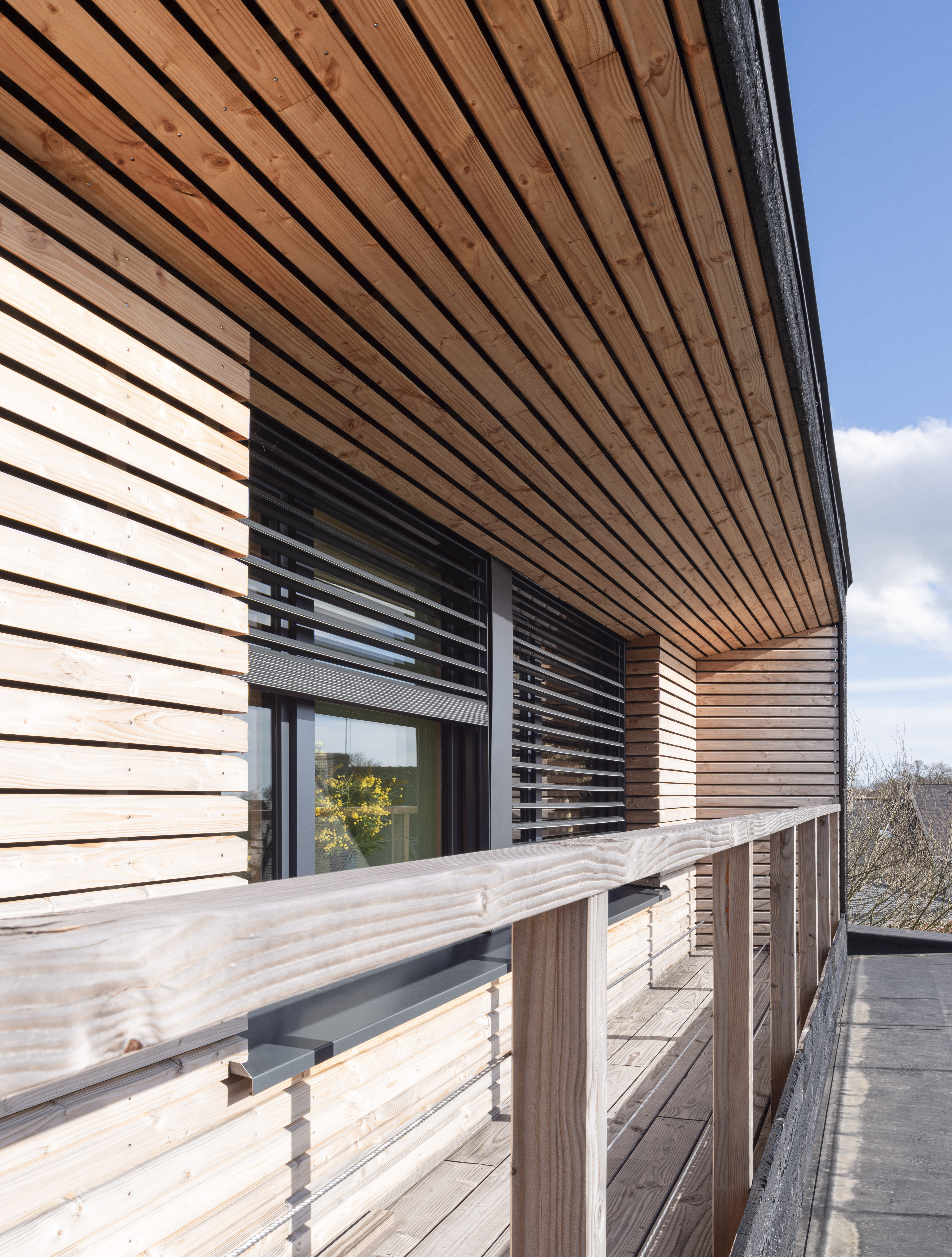 Approche environnementale : Le projet s’inscrit dans une démarche développement durable très affirmée : maison passive, éco-matériaux, circuit-court. De l’implantation jusqu’au mobilier, tout a été pensé en terme de minimisation de l’empreinte environnementale. L'architecture du projet lui permet de s'affranchir totalement de chauffage: l'orientation sud du bâtiment et ses grandes ouvertures permettent de chauffer l'intérieur en hiver, les casquettes protègent de la surchauffe en été. A l’intérieur la chasse à la colle a été faite, les murs et le parquet massif sont cloués. Le bois sublime l'intérieur sain et chaleureux.
