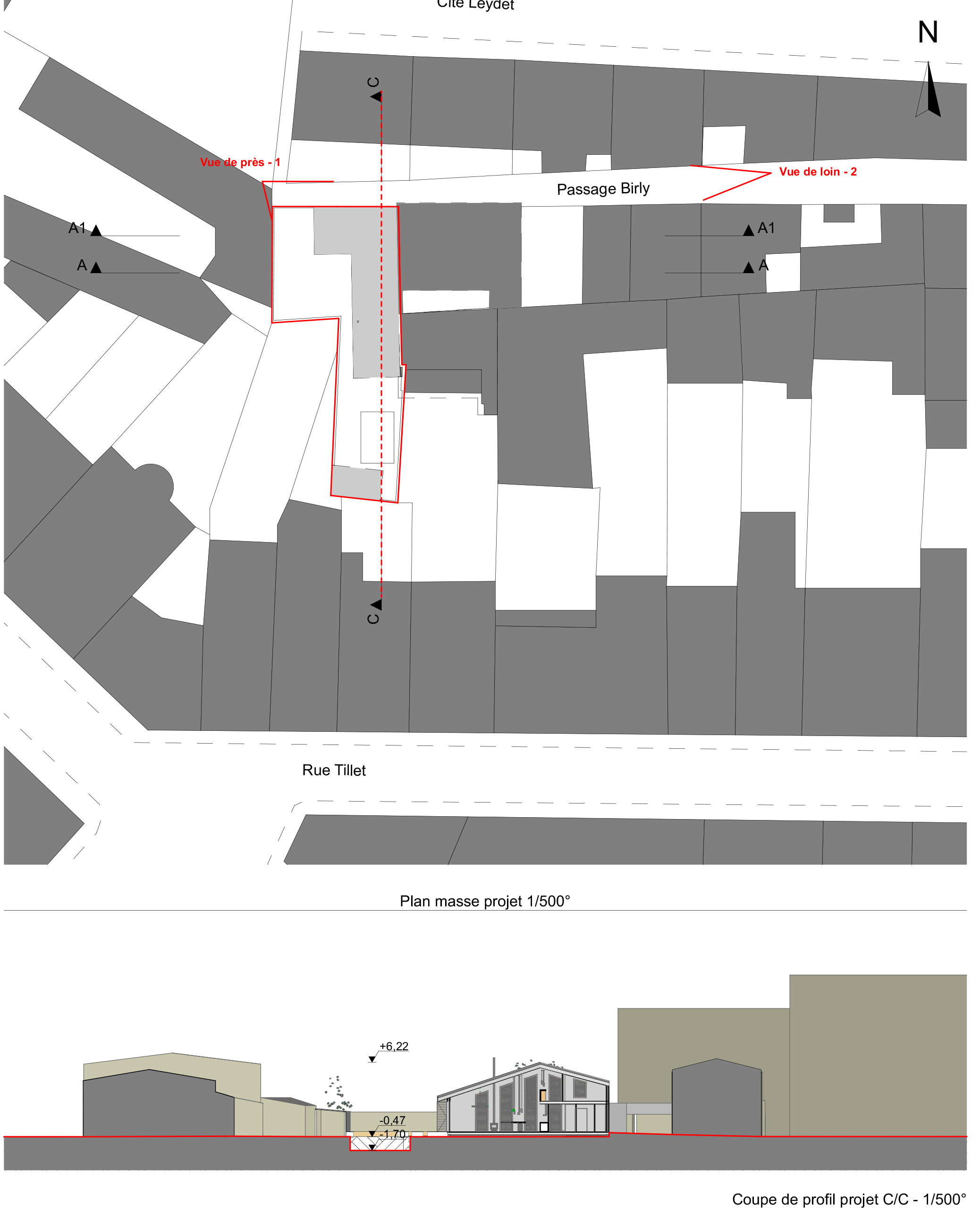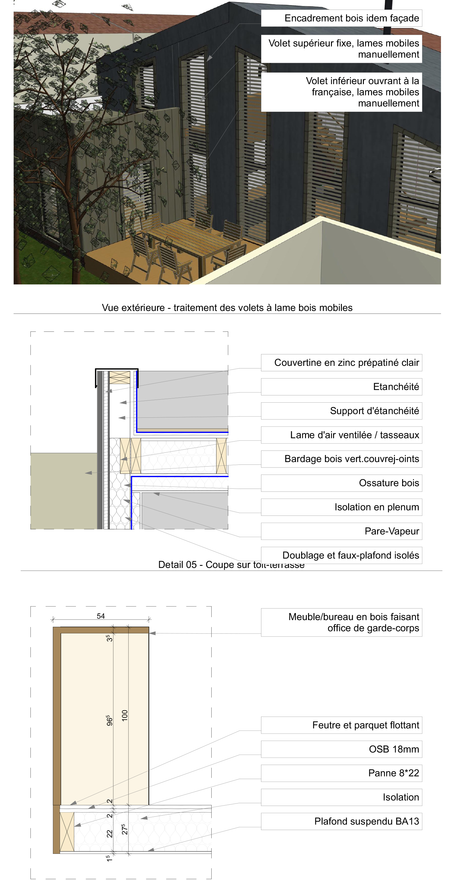 Descriptif technique : La maison est réalisée en ossature bois, avec isolation répartie et doublage intérieur. Le zinc à joint debout, présent en couverture et façade vient en rappel de la zinguerie des échoppes. Le bardage bois adoucit l’aspect du zinc. Les ouvrants de la grande façade plein ouest sont protégés du soleil et des vis à vis par des persiennes en acier et remplissage bois. La façade sud est protégée par une avancée pour les mêmes raisons. Un rail vitré vient ouvrir l'entrée, joue avec les menuiseries verticales des échoppes environnantes, tout en conférant un aspect moderne à la construction.