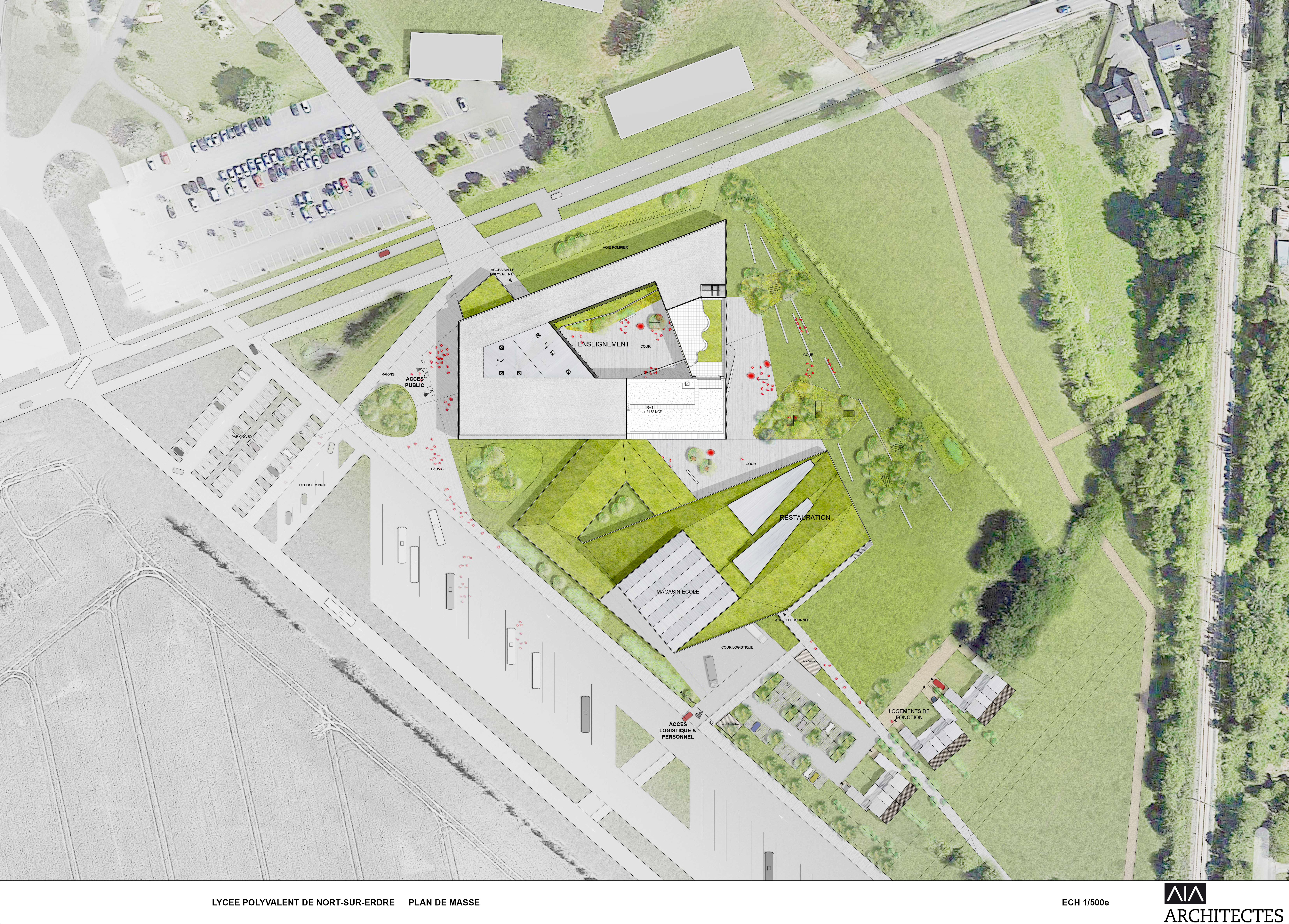 Ce lycée polyvalent, d’une capacité de 1 000 élèves, allie une architecture basée sur l'utilisation de matériaux bruts à une démarche environnementale ambitieuse : • Pensé comme un lieu d’apprentissages, de vie et d’échanges, ce « lycée 4.0 » propose un environnement de travail orienté vers de nouvelles pratiques pédagogiques, par l’intégration du numérique et par de multiples espaces communs conviviaux avec des mobiliers adaptés ; Le hall, agrémenté de son gradin, est l'expression majeure des volontés architecturales : lumière, usages multipliés, dualité des matériaux bois et béton.