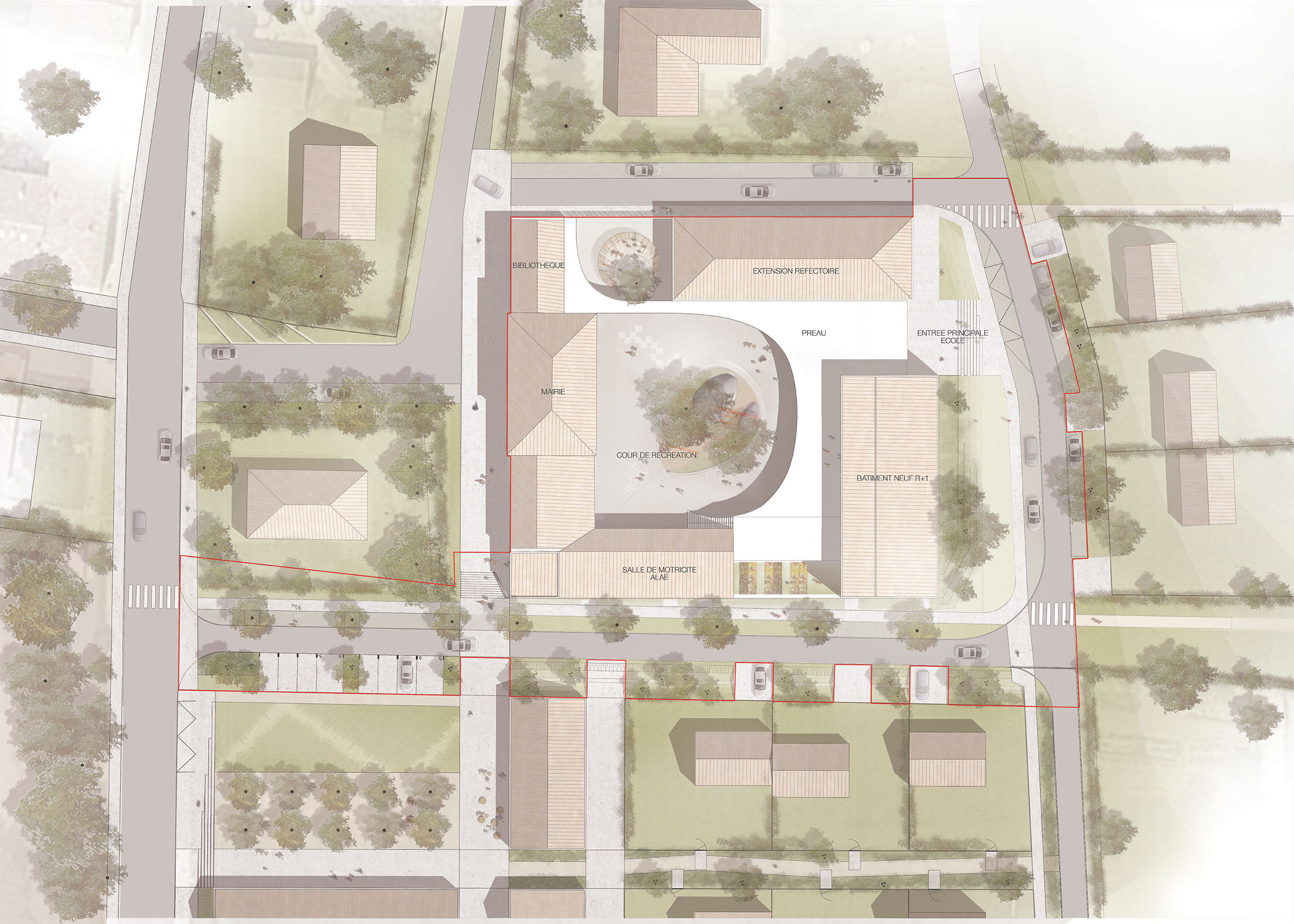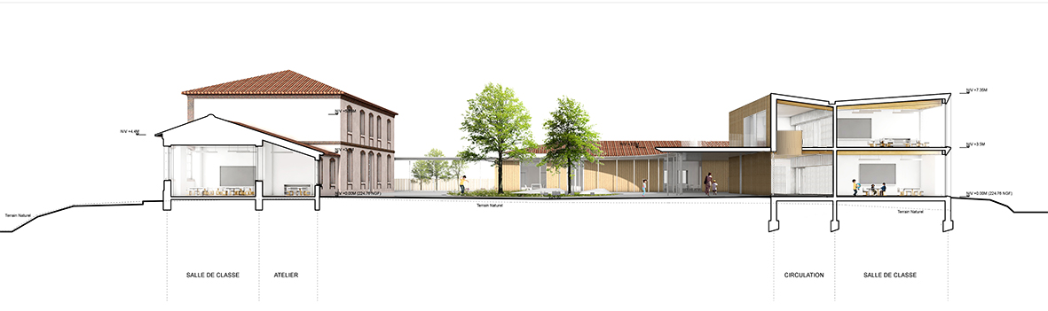 Le projet est la restructuration et l'extension de l'école élémentaire du village. Le projet compose avec la mairie et l’école comme un îlot public à 4 faces enserrant un coeur d’îlot protégé. L’extension de l’école au sud intègre les salles de classes sur 2 niveaux et vient, en terme de gabarit, faire écho à la hauteur de la mairie existante. Organisé autour de la cour tel un collier de perles, les volumétries bâties crées des ouvertures cadrées vers le paysage, reliées par un préau continu. Les entre-deux volumétries créent des espaces extérieurs spécifiques à chaque orientation.