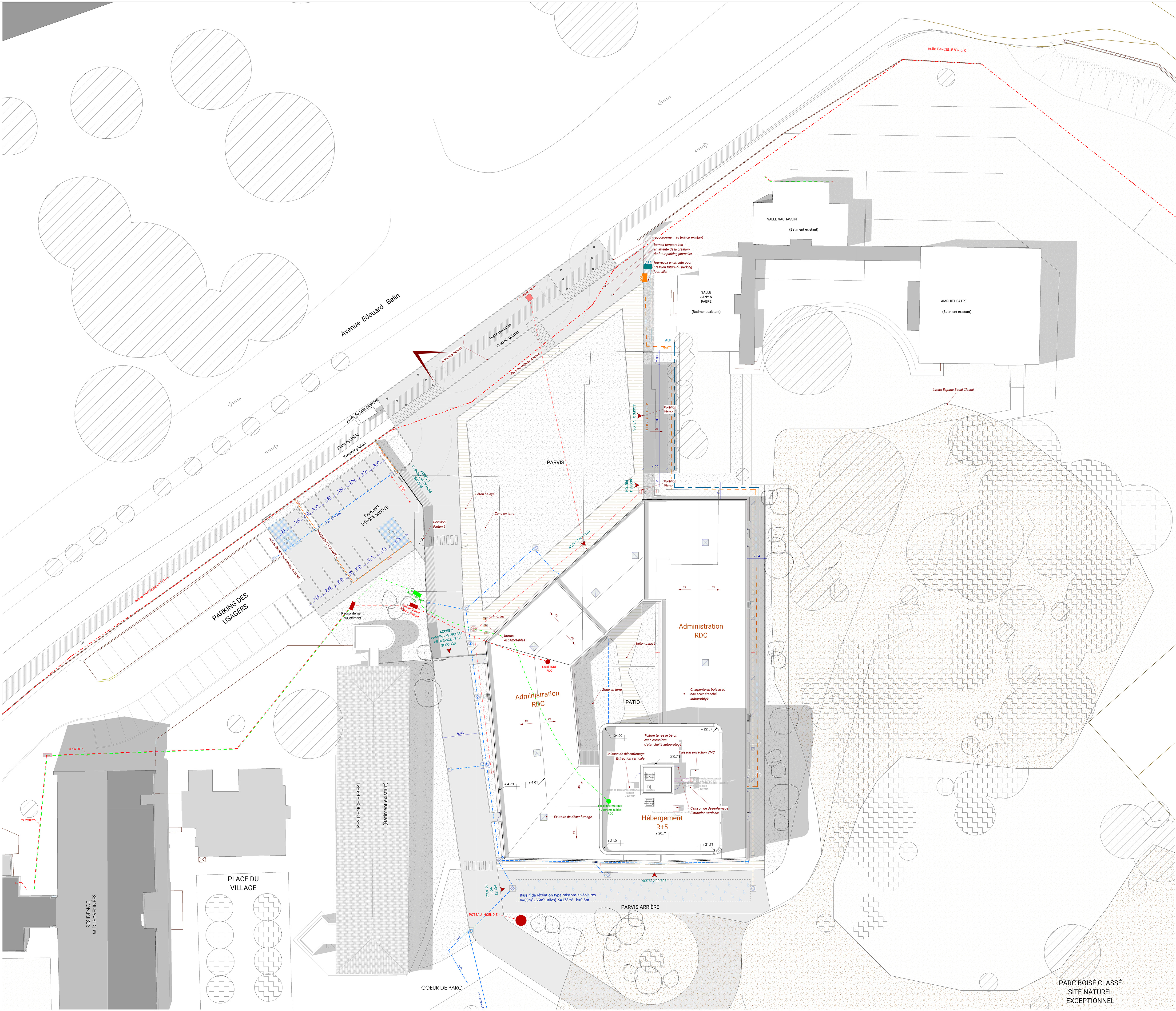 Descriptif technique : Ce bâtiment est conçu avec un principe constructif poteaux-poutres comprenant une isolation de type ossature bois rapportée en façade, et une importante quantité de matériaux bio-sourcés. Le plancher bas sera un plancher chauffant, de type polystyrène expansé. Les toitures seront isolées par l'extérieur. Les menuiseries double vitrage à isolation thermique renforcée, avec remplissage à l'argon, assurerons une excellente isolation thermique et acoustique, favoriserons la lumière naturelle, limitant ainsi l'éclairage artificiel et participant à la réduction des consommations énergétiques.