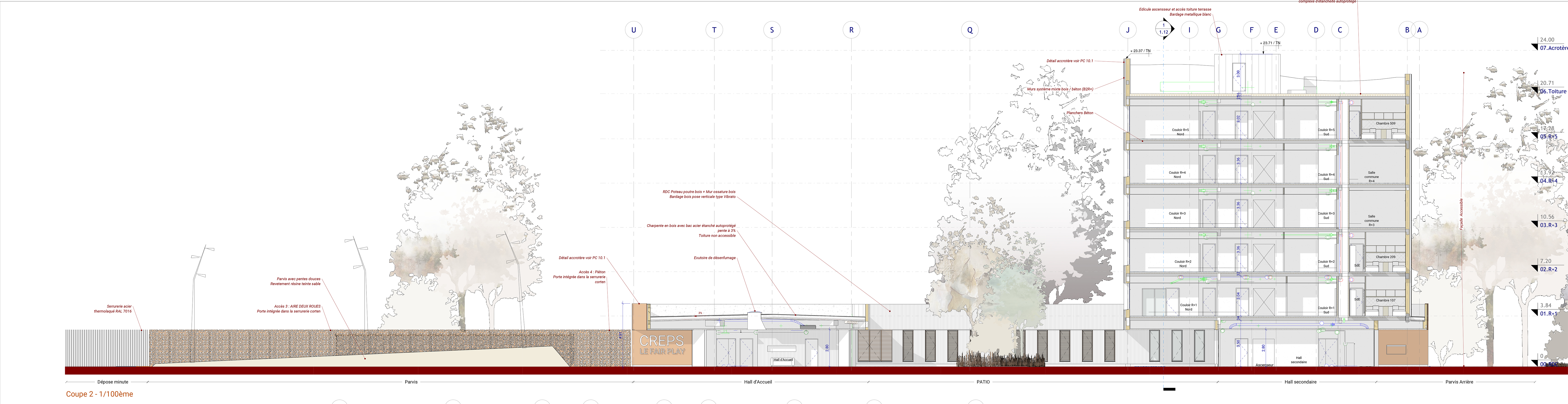 Le projet du CREPS a un double enjeu, qualifier son identité sportive et répondre aux besoins des usagers, par la construction d'une résidence hôtelière et la valorisation d'un pôle administratif regroupant les services. Le parvis et le bâtiment "fair play" constituent un lieu remarquable et convivial avec l'esplanade aménagée sur un sol incliné, qui amène à une découverte progressive du patio en second plan à travers le hall d'accueil. L'édifice est composé d'un socle massif en corten, matière chaude et durable, et d'une émergence revêtue d'une façade miroir qui reflète l'environnement boisé.