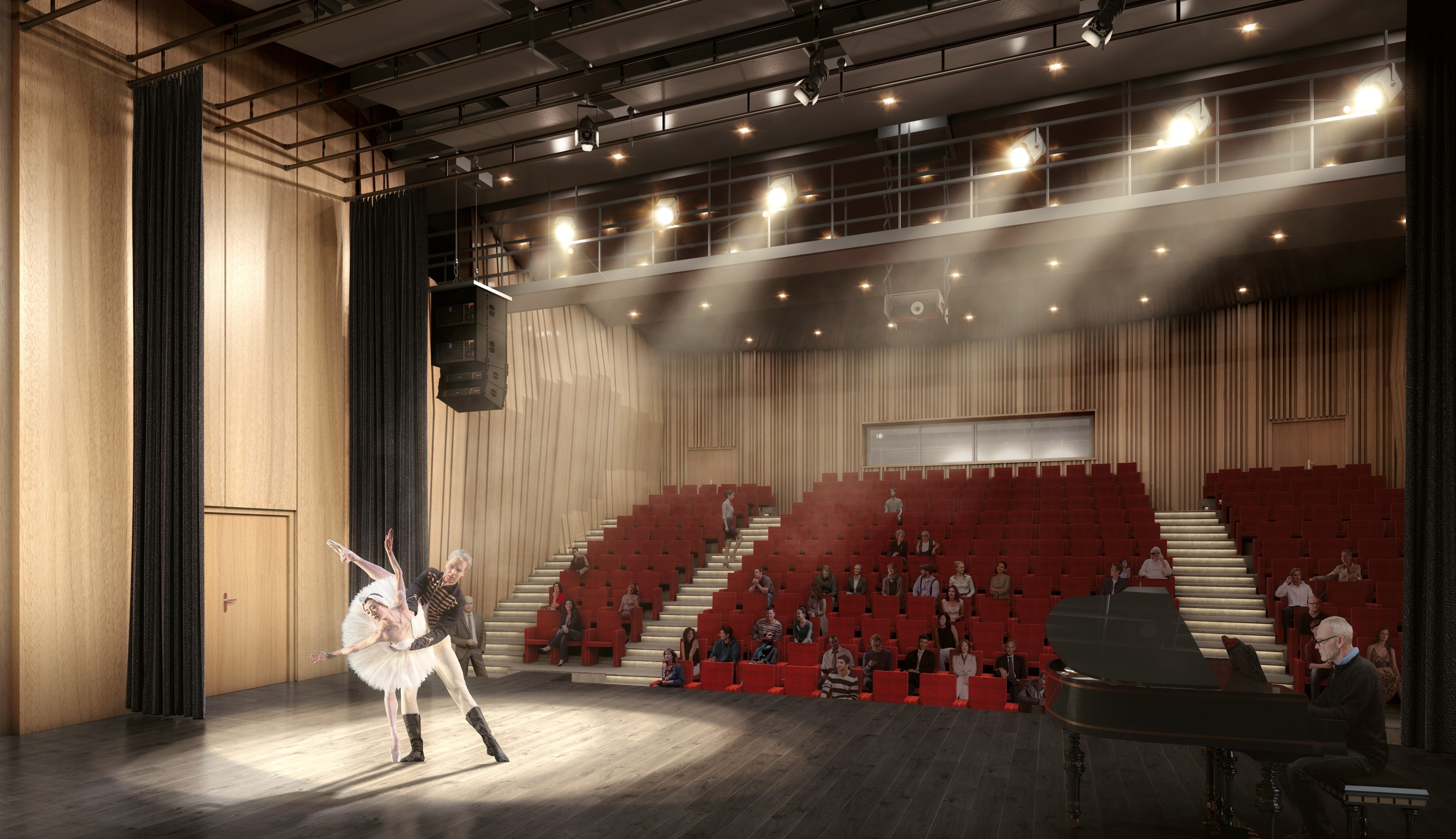 Le nouvel auditorium est revêtu de bois, à la manière des instruments de musique. Utilisé pour ses qualités esthétiques et son aspect chaleureux, le bois se révèle en plus performant pour l’acoustique interne de la salle de spectacles. La conque de la scène est en panneaux lisse bois avec un mur mobile donnant sur les coulisses, offrant ainsi un écrin soigné pour les représentations. Les spectateurs s'installent dans des sièges confortables en tissu dont le carter bois assure la protection et la pérennité des assises dans l'avenir. Le parquet de scène a été totalement réhabilité.