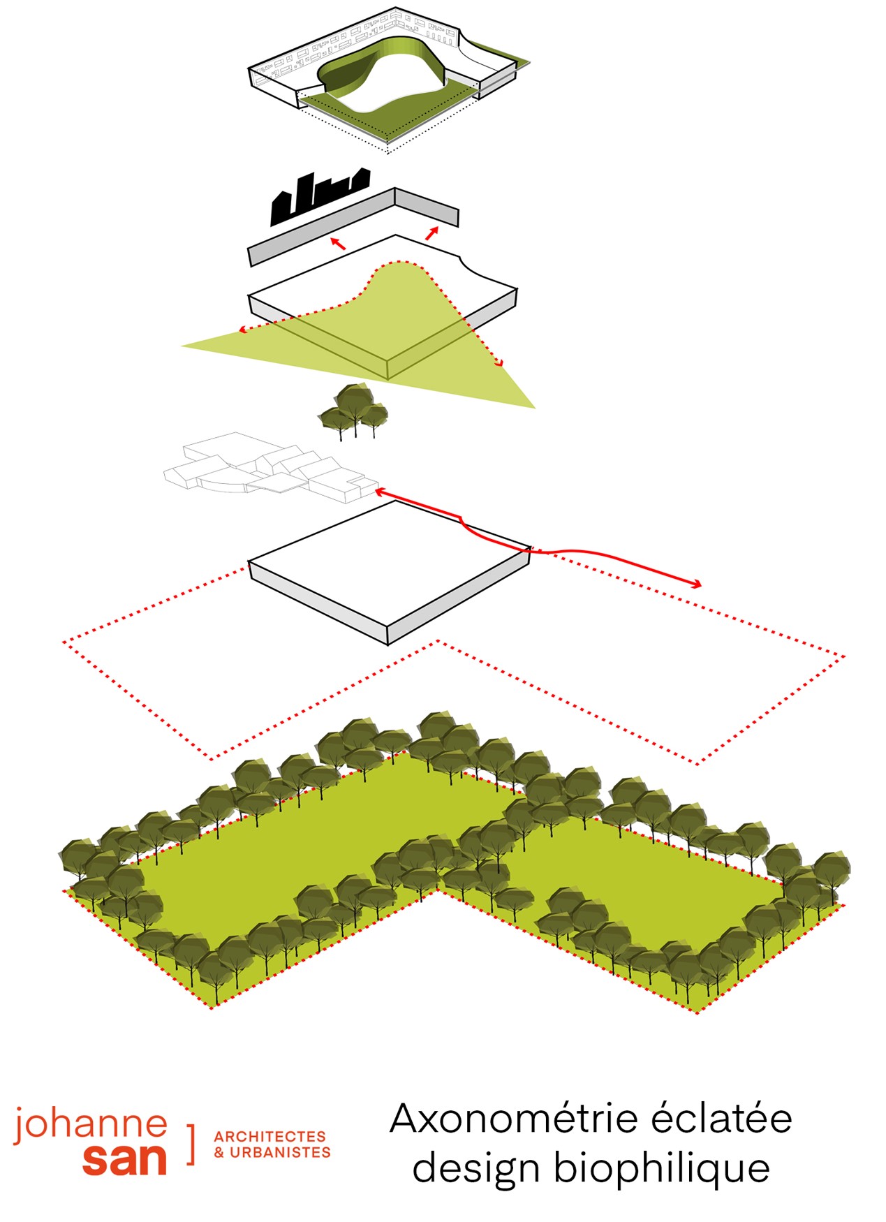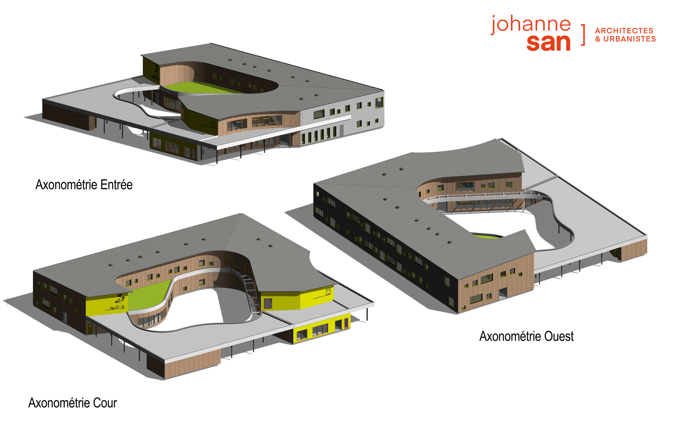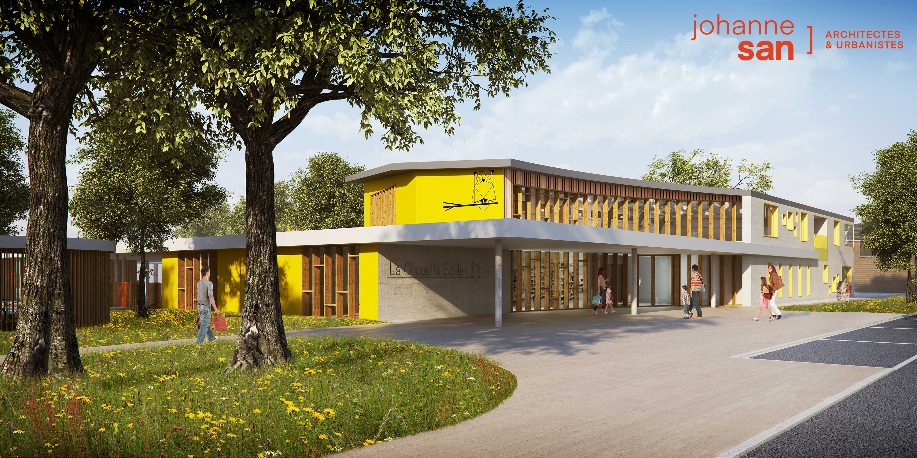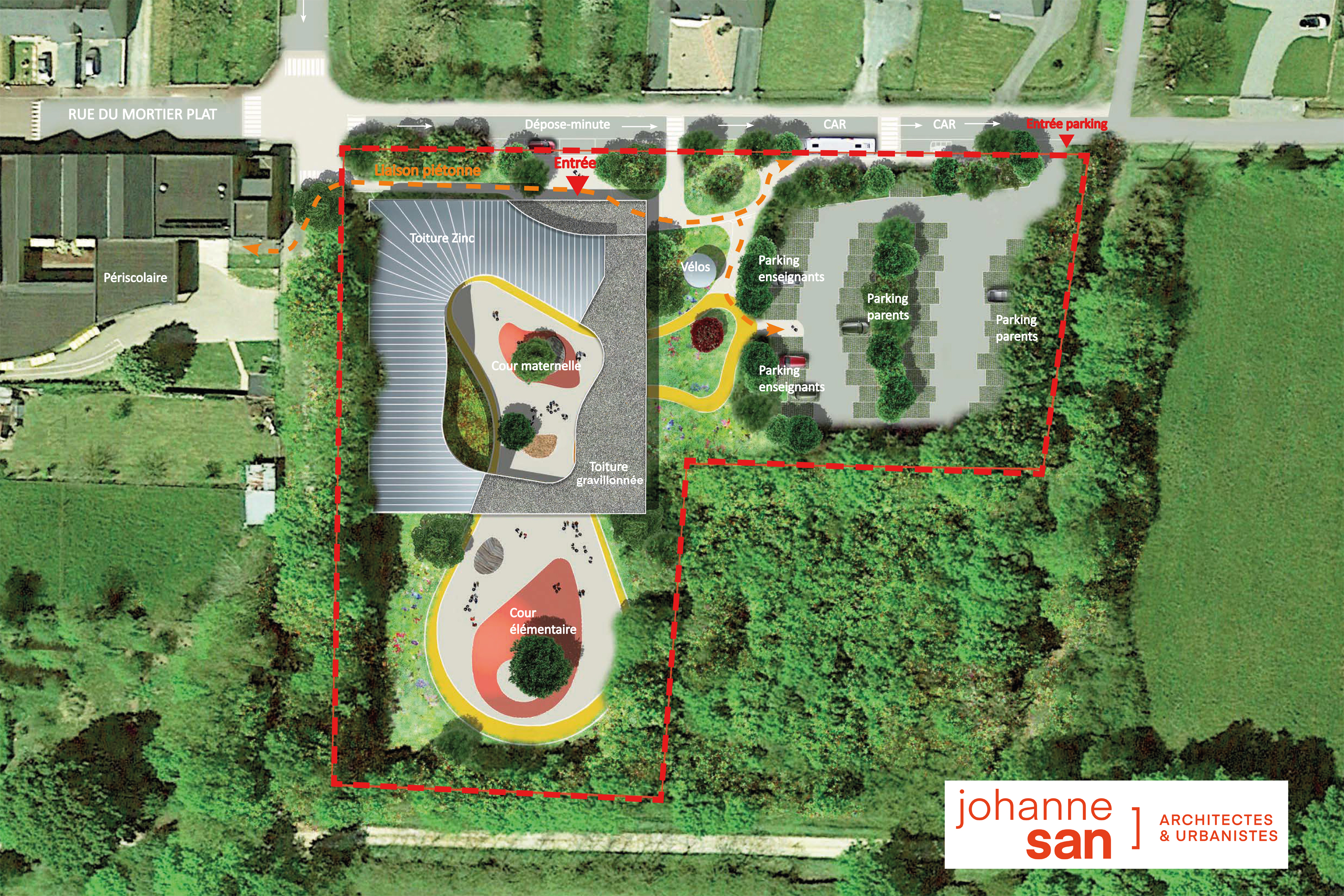 Approche environnementale : Construction HQE sans certification, le bâtiment répond au concept "faire bien et mieux" : réduire l’empreinte énergétique et carbone du bâtiment, privilégier l'utilisation d’essences locales, veiller à la qualité de l'air des salles de classes par la double flux, favoriser l'éclairage naturel des locaux, conserver la porosité des sols et les trames bocagères existantes. Portée à la fois par la démarche biophilique, l'immersion dans le végétal et le parcours du soleil, ce nouvel équipement apporte des expériences sensorielles propices à l’épanouissement et au bien-être des enfants.