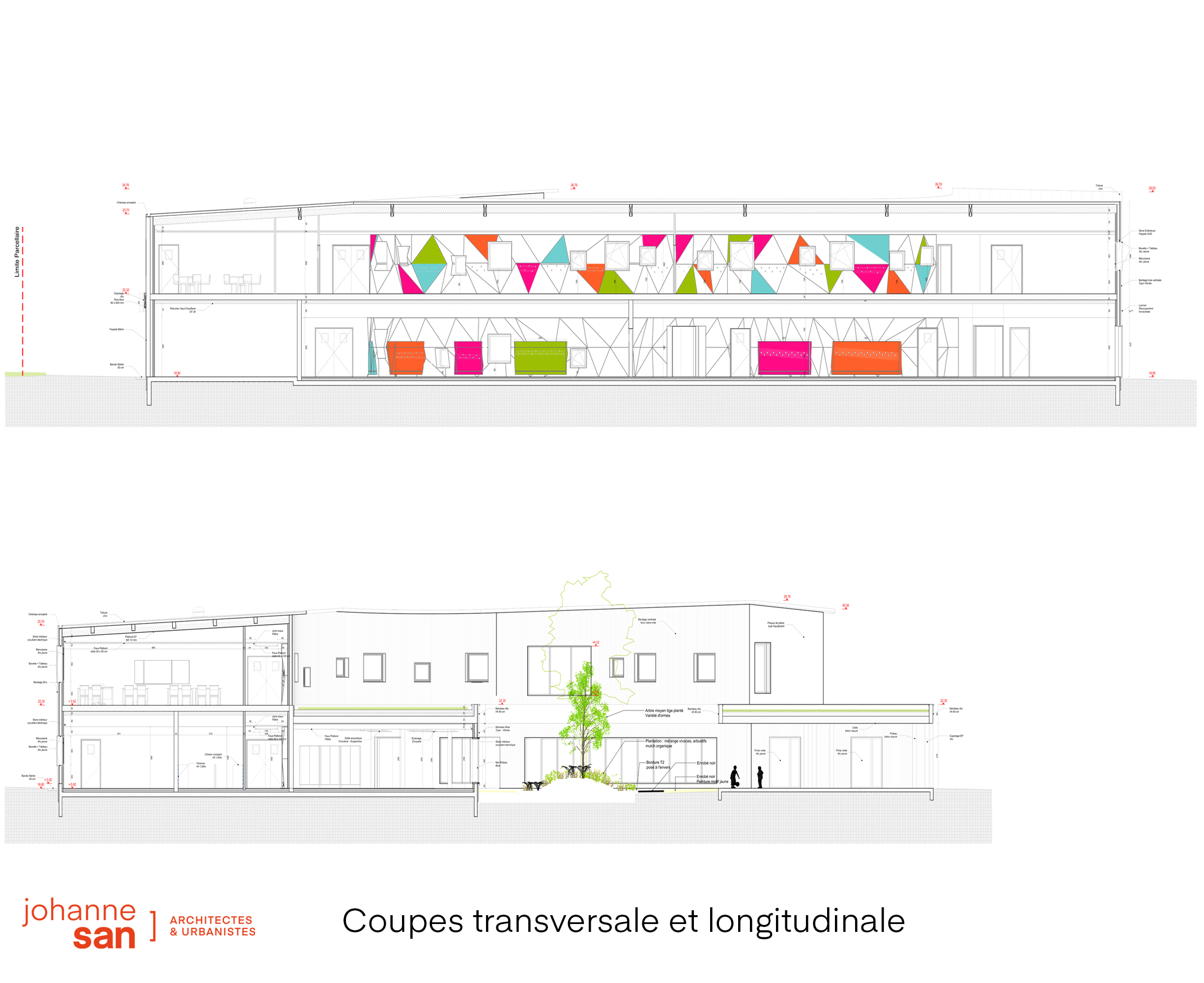 Descriptif technique : Reposant sur un principe constructif mixte, la complémentarité de l’ossature béton (dalles, refends et poteaux structurels des deux plateaux) avec le mur à ossature bois facilite la maîtrise des ambiances hygrothermiques. Cette association génère au bâtiment l'enveloppe d'un mur manteau bois à forte isolation ainsi que l'inertie de la structure intérieure avec le béton. Aussi, afin de créer un cadre de vie pédagogique sain, le bois est très présent au sein même de l'école avec les menuiseries intérieures et les nombreux agencements : couloirs, vestiaires, escalier, hall accueil et rangements. PEFC (Gestion forestière durable)