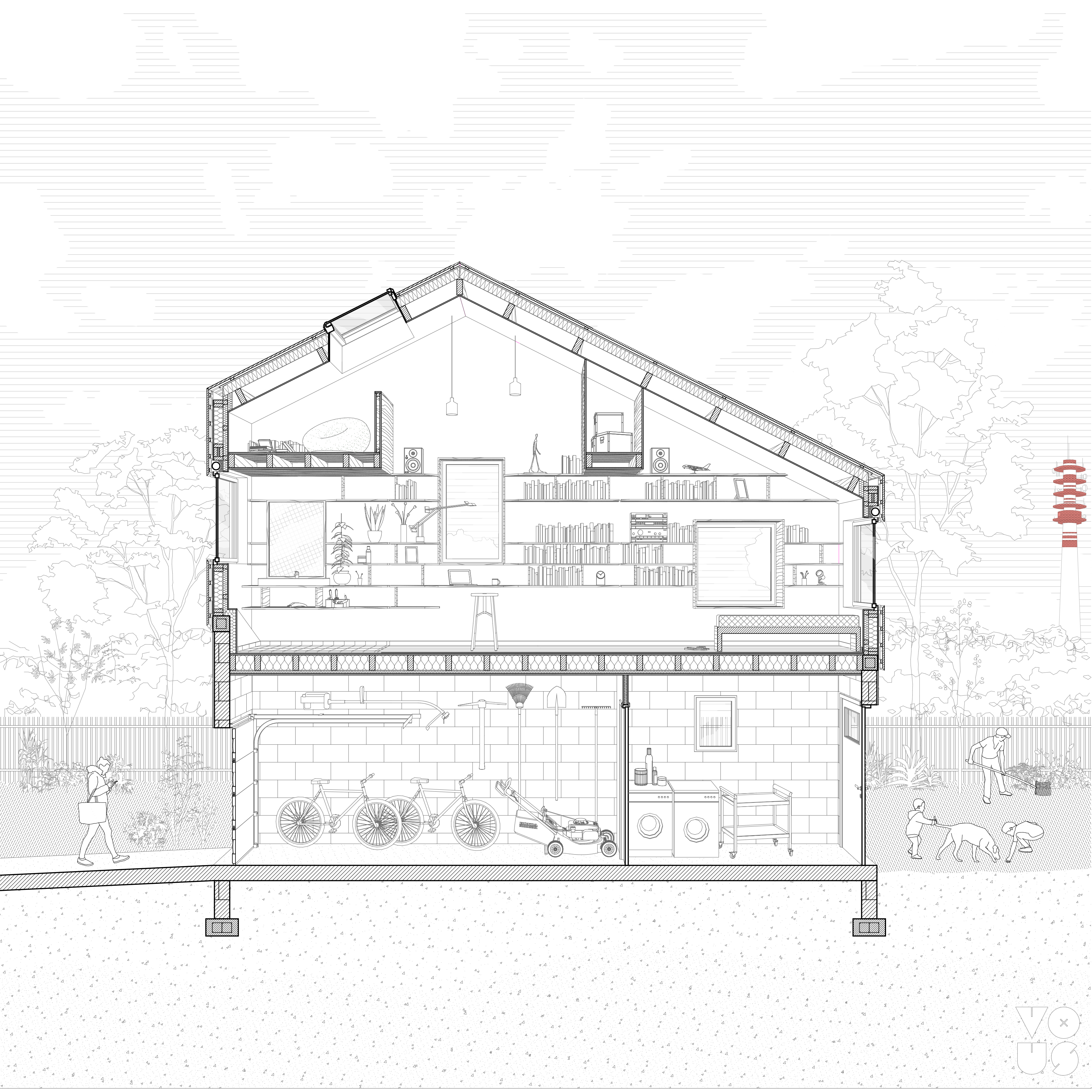 Le volume est simple, monobloc, radicalement enveloppé d’un bardage bois, sur les murs comme sur le toit. Délicatement posée sur le garage d'un pavillon des années 80, la surélévation LRVO contraste par sa matérialité sans effacer pour autant la géométrie particulière du bâti qui la supporte. En étirant la ligne de faîtage et les pentes de toiture existantes, l’extension s’affirme dans le prolongement du pavillon. Son agencement, le dessin de ses percements et la matérialité de son enveloppe continue affirment la greffe prenant position dans l’infinie transformation du quartier, de la ville.