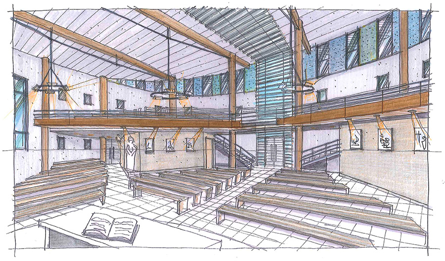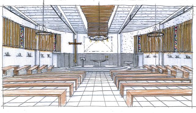 Approche environnementale : La forme elliptique, forme à la fois pure, douce et rayonnante, est perceptible de l’extérieur comme de l’intérieur. Alliée à la mise en oeuvre de matériaux nobles, comme le bois et l'ardoise, elle facilite l'intégration du bâtiment dans son environnement. L’emploi de cette forme et de la courbe correspond bien à la notion d’assemblée et offre à tous une plus grande proximité avec le chœur. La lumière naturelle, contrôlée par un système de brise soleil, est mise à l'honneur, en position centrale, et valorise le chœur. Pour le confort optimal de tous, l'isolation de l'édifice a été renforcée.