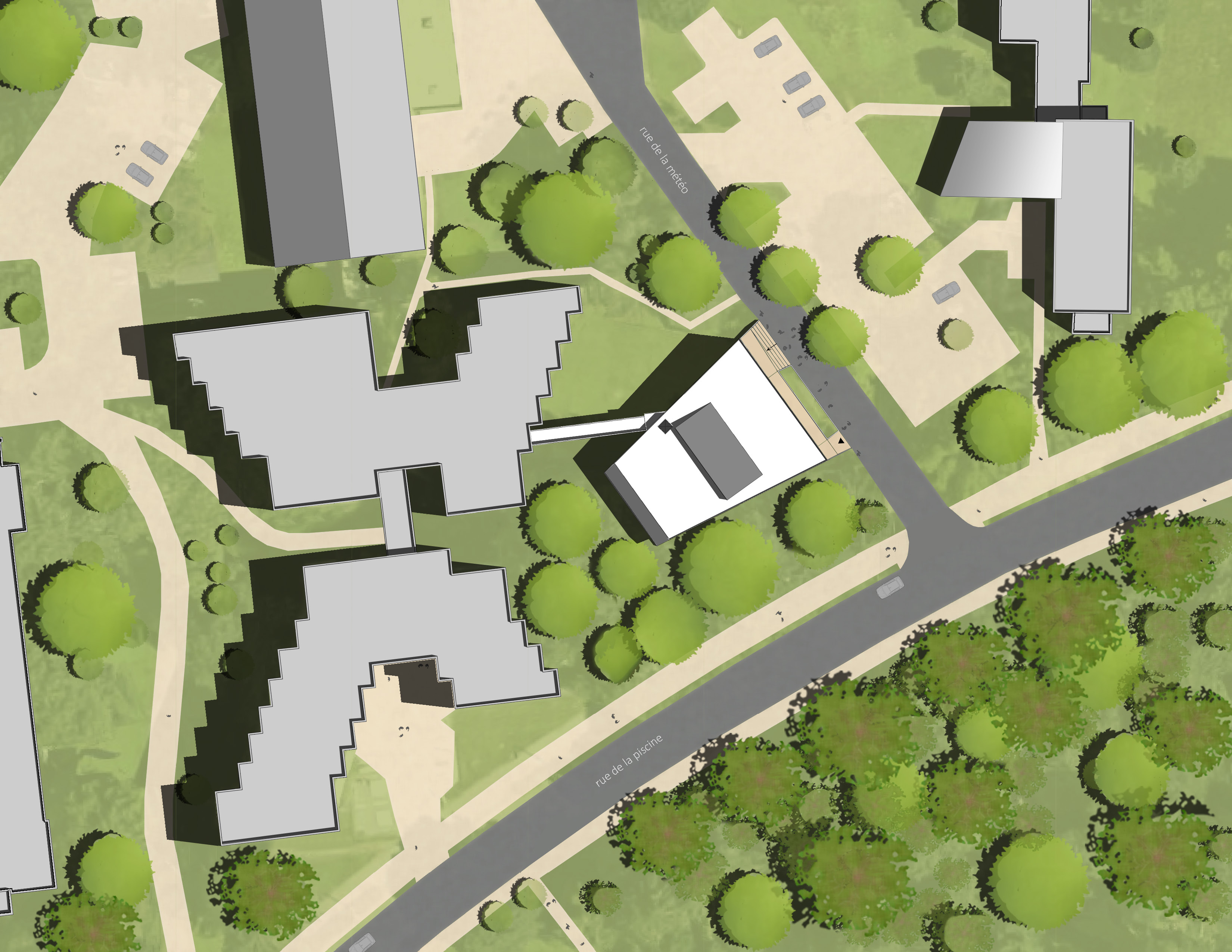 Descriptif technique : La géométrie facettée du bâtiment compose deux porte-à-faux, l'un au dessus de l'entrée principale et l'autre à l'arrière du bâtiment. Ces intentions plastiques sculptent le volume et répondent aux exigences thermiques et de compacités. Le volume sous les gradins est décollé du sol, il participe à l'optimisation des espaces, à la réduction de la matière et de l'emprise du sol. L'amphithéâtre, avec un dessin de plafond générée à la fois par la présence du local technique et par un calcul acoustique permet l'optimisation des vides et le passage des fluides. PEFC (Gestion forestière durable)