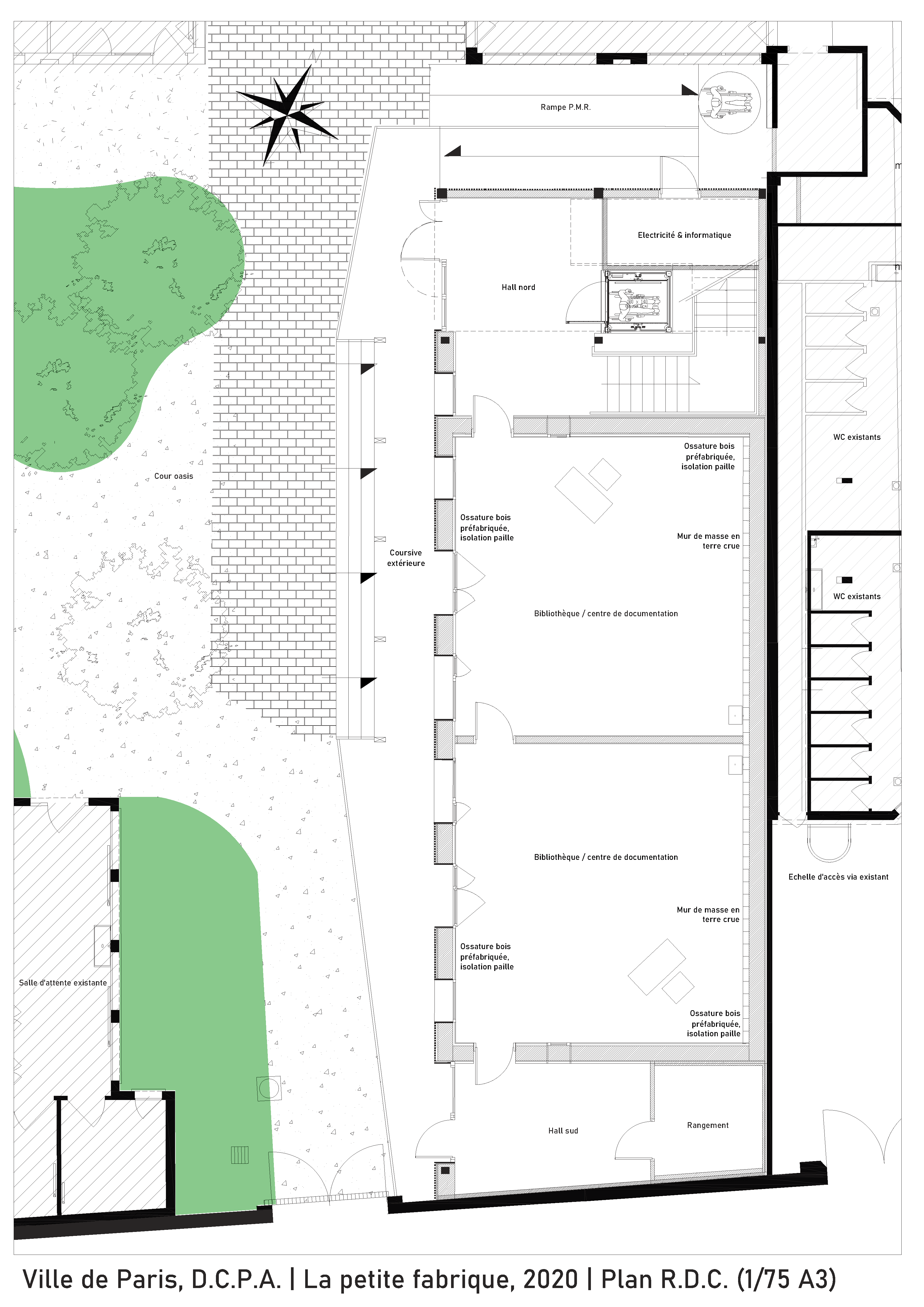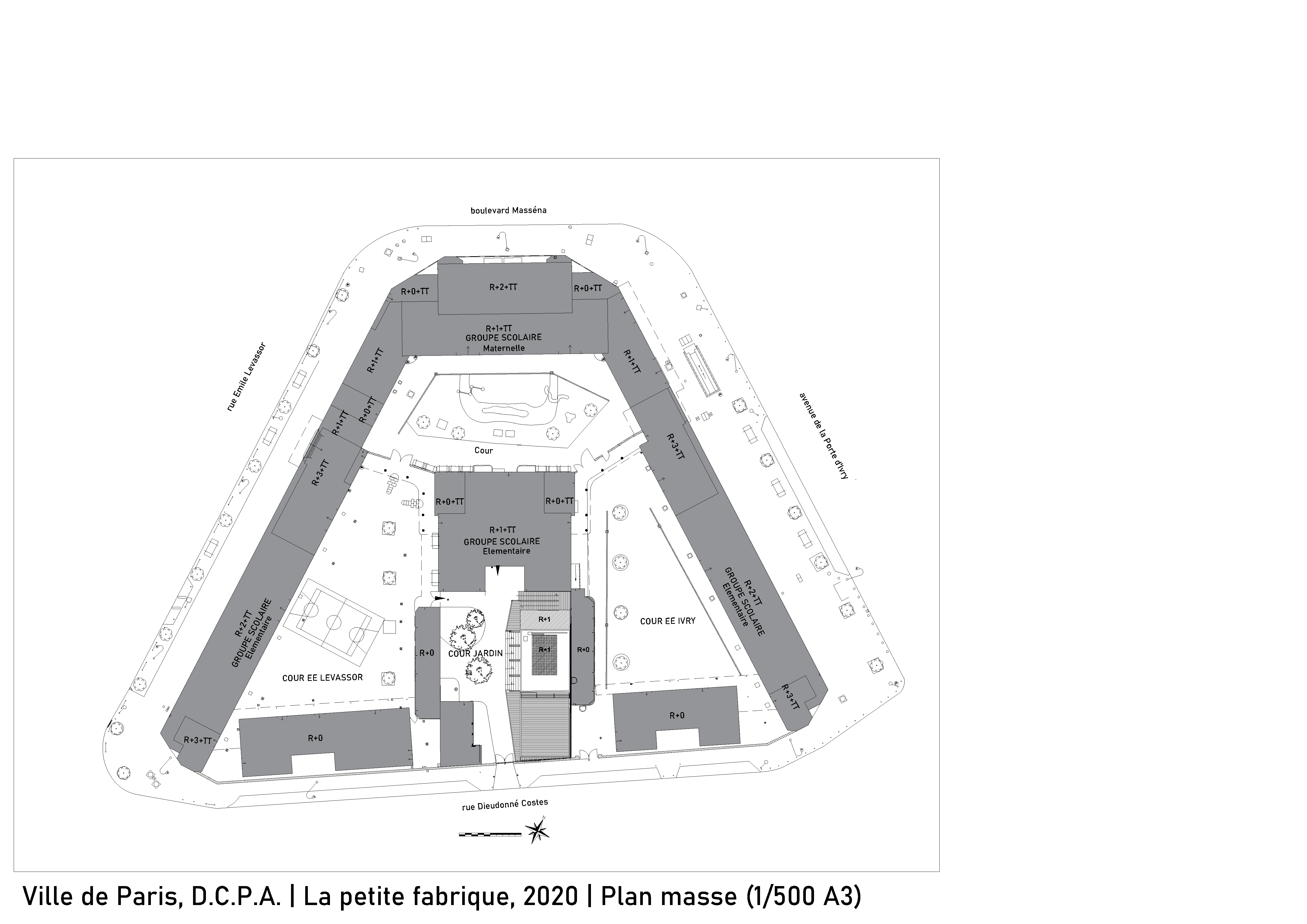 Le bâtiment à construire est une extension (ERP de 2e catégorie) de l’école Ivry-Levassor à vocation pédagogique et dont la démarche doit être reproductible. L’impact environnemental doit être aussi faible que possible. Après une série d’itérations l’équipe a abouti à la définition d’un bâtiment compact, dont la localisation et l’orientation sont guidées par une démarche bioclimatique, dont les équipements techniques s’efforcent de conjuguer performances et sobriété, et dont les éléments constructifs font largement appels aux matériaux biosourcés et/ou recyclés et/ou réemployés.