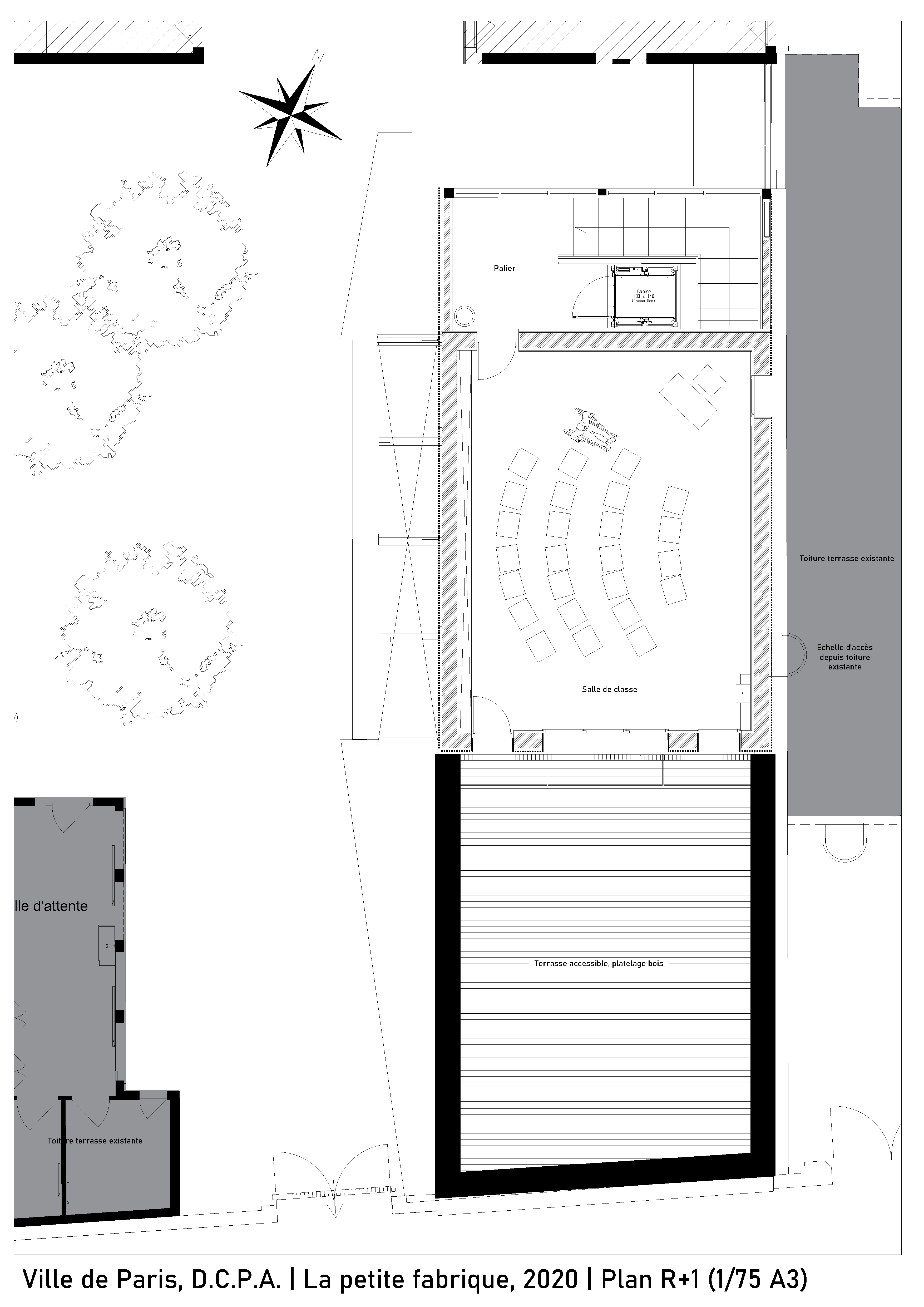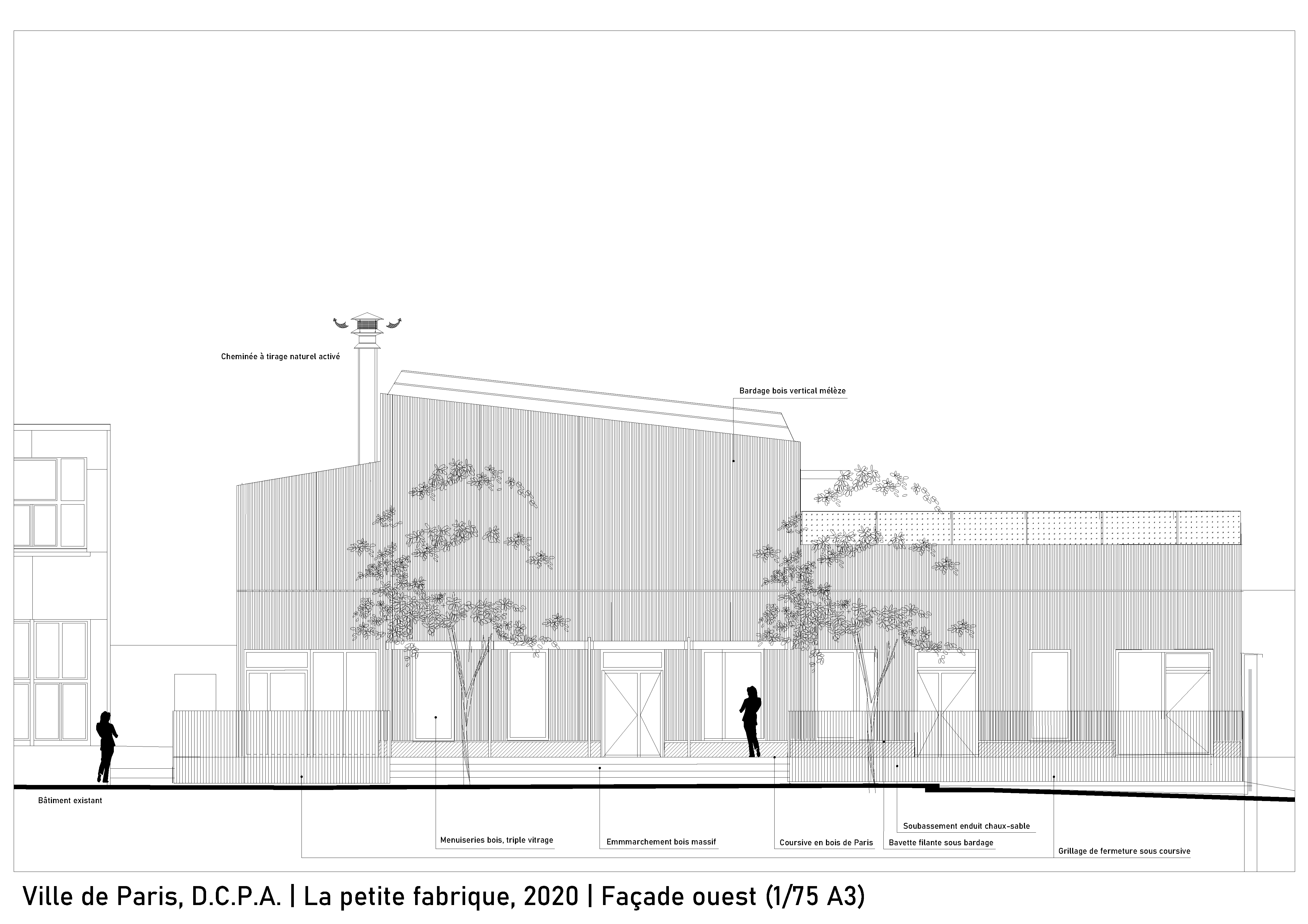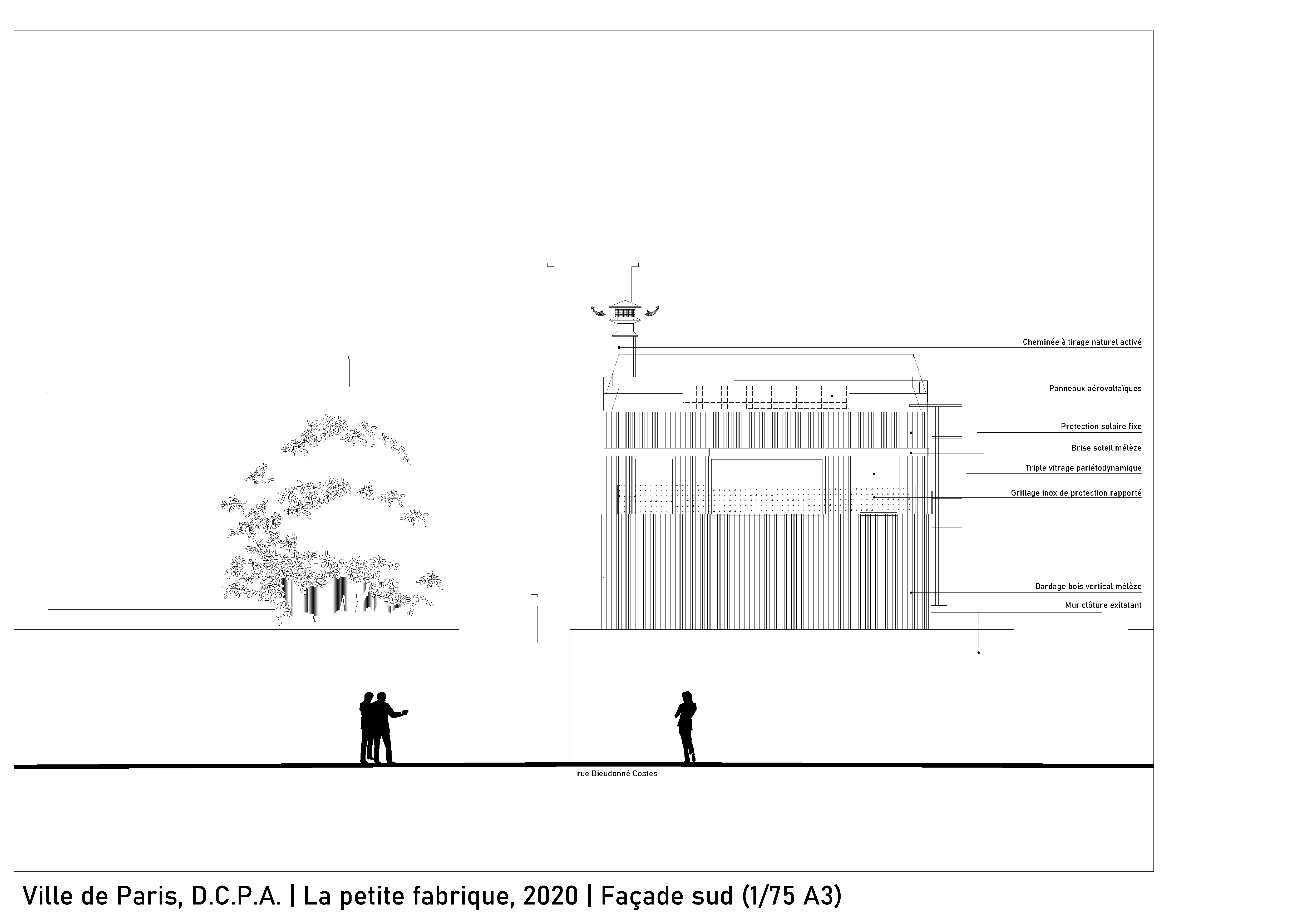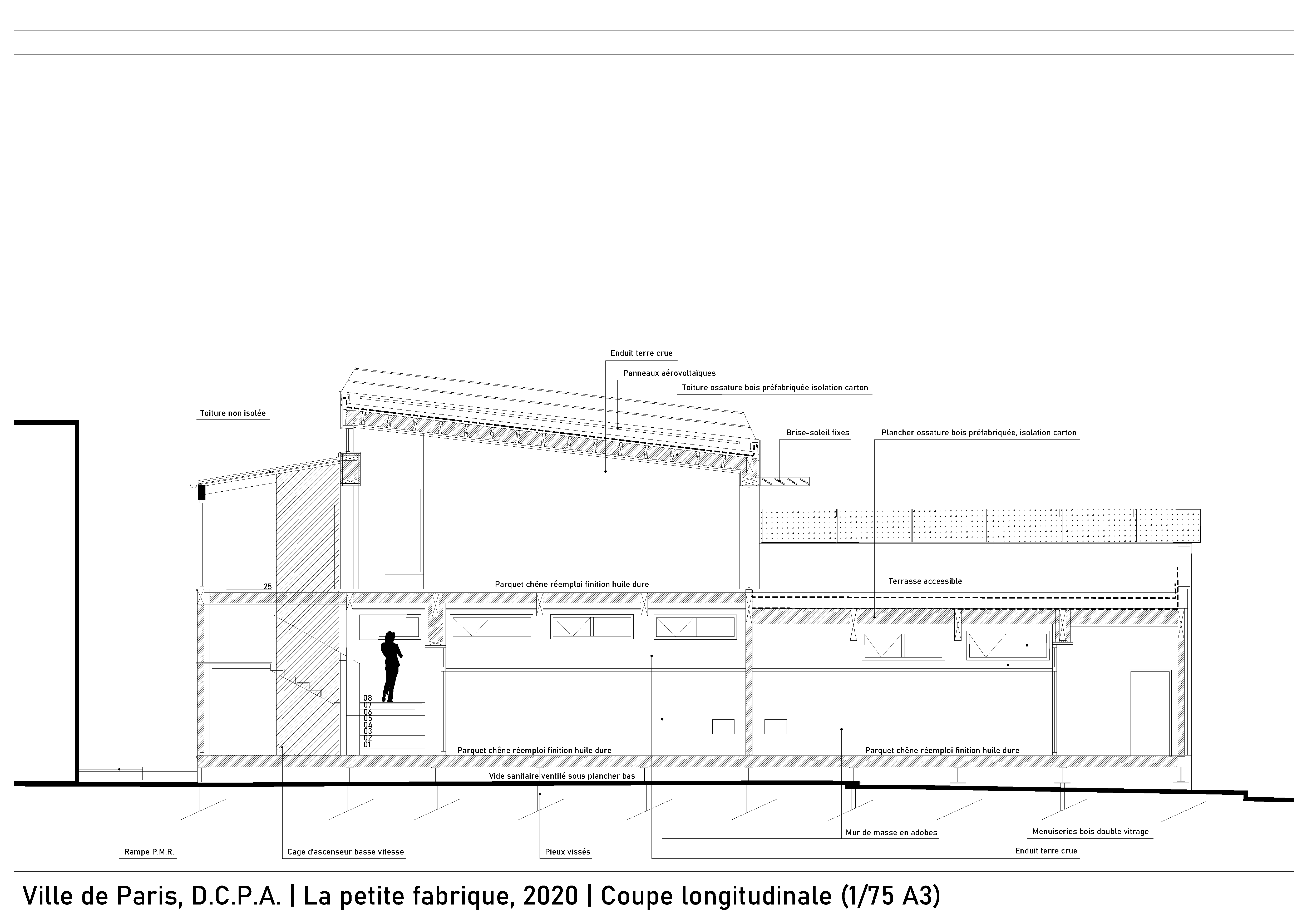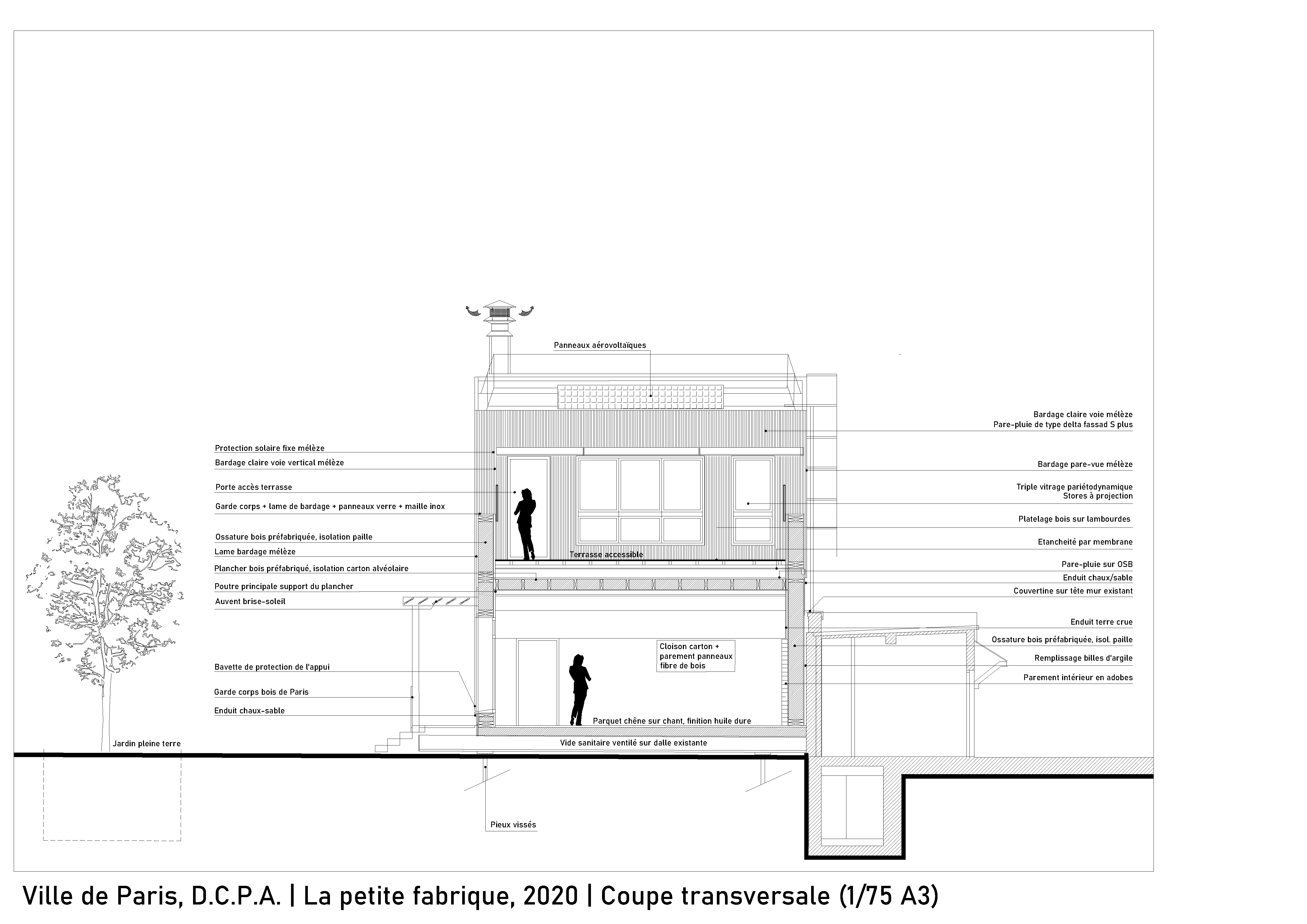 Descriptif technique : Les fondations sont constituées de pieux métalliques vissés et réversibles. La structure porteuse est en caissons bois et remplissage paille, fibre de bois et carton, et préfabriquée en atelier. Le parquet est en chêne français. Les huisseries et menuiseries sont en bois. L'escalier est réalisé en panneaux débités d'anciennes portes en chêne. Le mobilier est fait à partir de menuiseries réemployées. Le platelage et autres revêtements extérieurs en bois parisien. Les dispositifs techniques incluent des panneaux aérovoltaïques, des fenêtres pariétodynamiques, des brasseurs d'air sans pales...