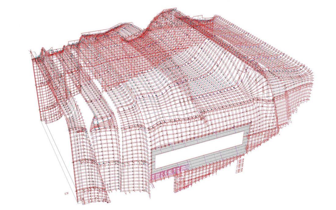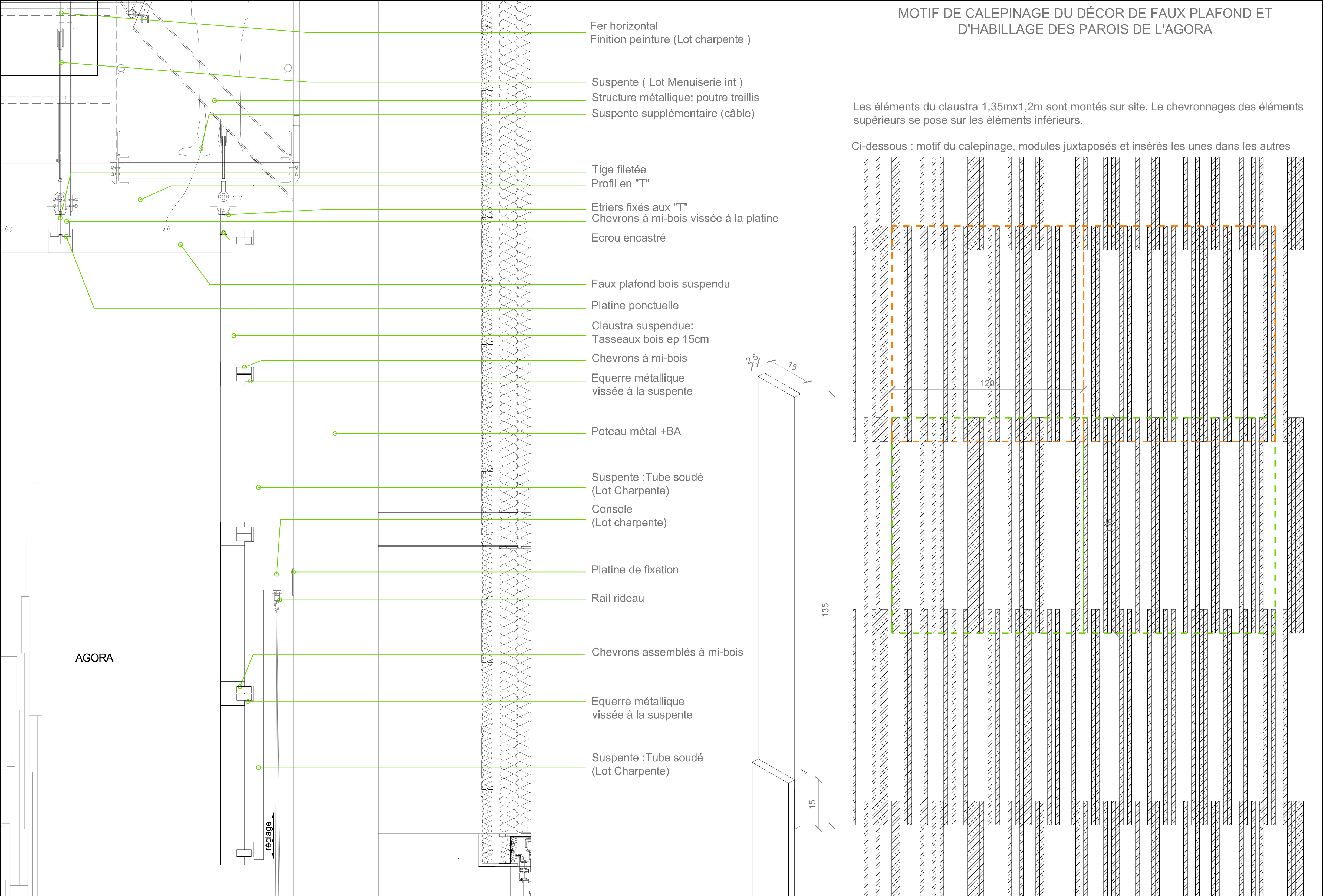 Descriptif technique de l'aménagement : l'auditorium : Les 790m² de surface développée des parois et du plafond de la salle de spectacle, sont modélisés sur le logiciel Rhinocéros 3D en s’appuyant sur le plugin Grasshopper. L’ensemble de l’ouvrage est composé de sept conques divisées en tranches suivant des plans de joints commun. Ces tranches sont ensuite découpées en 235 caissettes unitaires constituées d’une ossature en contreplaqué ignifugé en peuplier assemblé à mi-bois. Le tout représente 3500 éléments uniques sur lesquels viennent se fixer 26000 brins de rotin, également ignifugés.