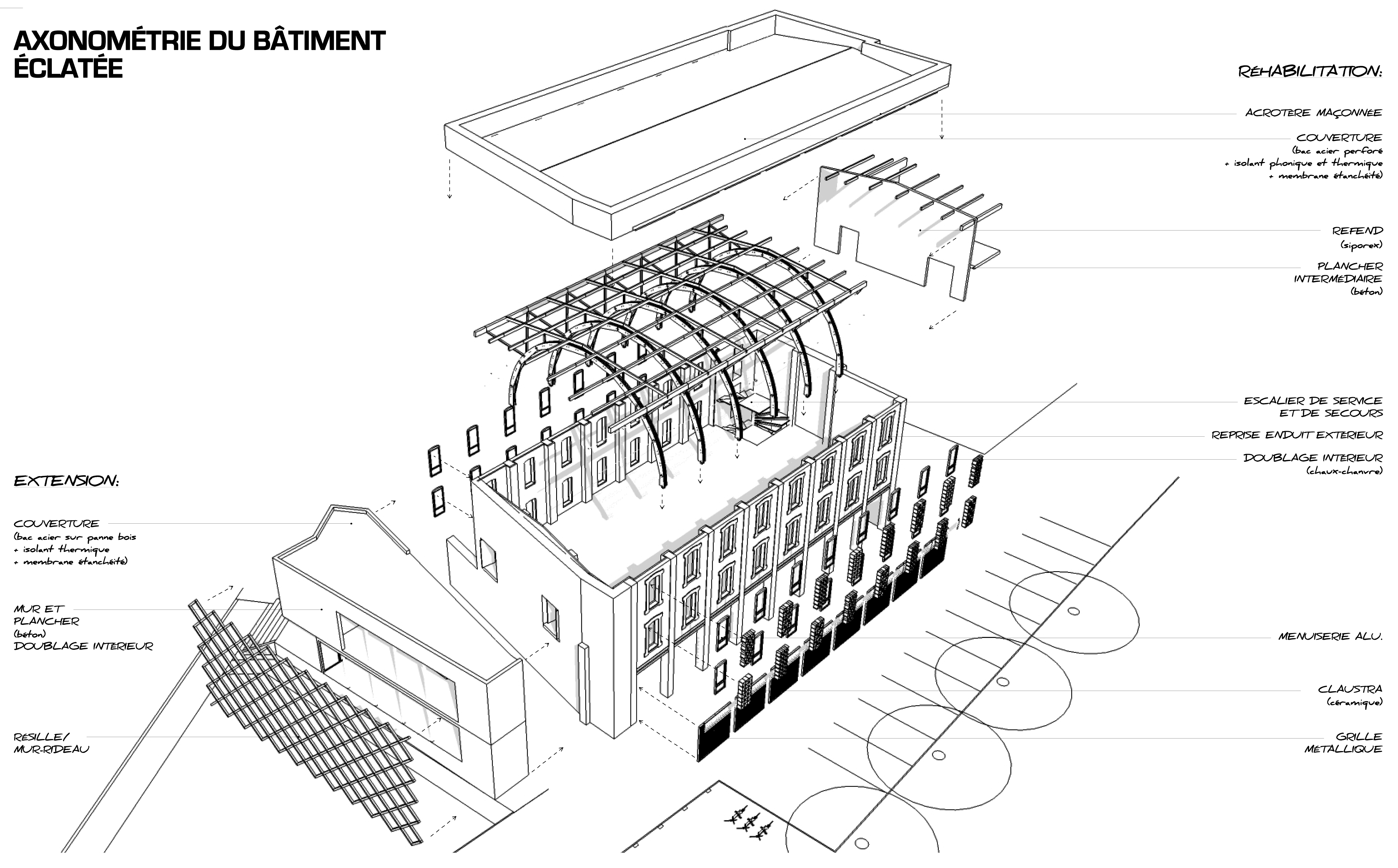 Approche environnementale : Aujourd’hui, dans les réhabilitations, l’attention est à apporter dans les transferts de vapeur d’eau. C’est pourquoi, dans la grande salle, nous utilisons un enduit chaux-chanvre, en doublage intérieur. Ainsi, nous laissons le mur respirer, tout en l’isolant en même temps. A cela s’ajoutent la mise en place de claustra (en céramique, clin d’oeil à l’histoire) en façade Sud pour occulter une partie des rayons du soleil tout en laissant passer la lumière