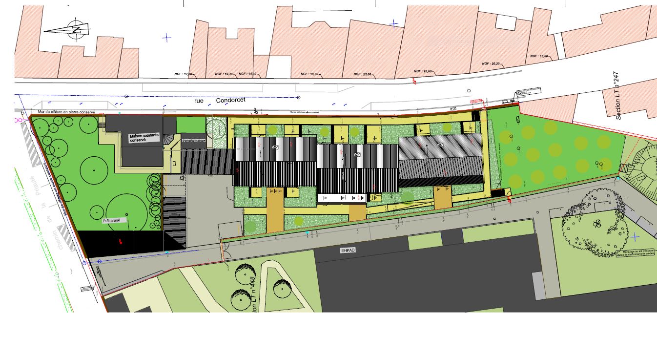 La construction de 33 logements est la dernière possible dans le parc de la congrégation des sœurs missionnaires de l’Evangile. Sur un parcelle exiguë, le bâtiment vient suivre le profil sur rue en conservant le mur d’enceinte en pierre présent depuis le XVIII ème siècle. Un travail fin d’adaptation au sol avec les paysagistes a permis de transformer l’exiguïté de la parcelle en espace intime pour tous les habitants ( jardins privatifs en RDC, cheminement qualitatifs et vergers). Les stationnements sont aériens et couvert à proximité de l’immeuble.