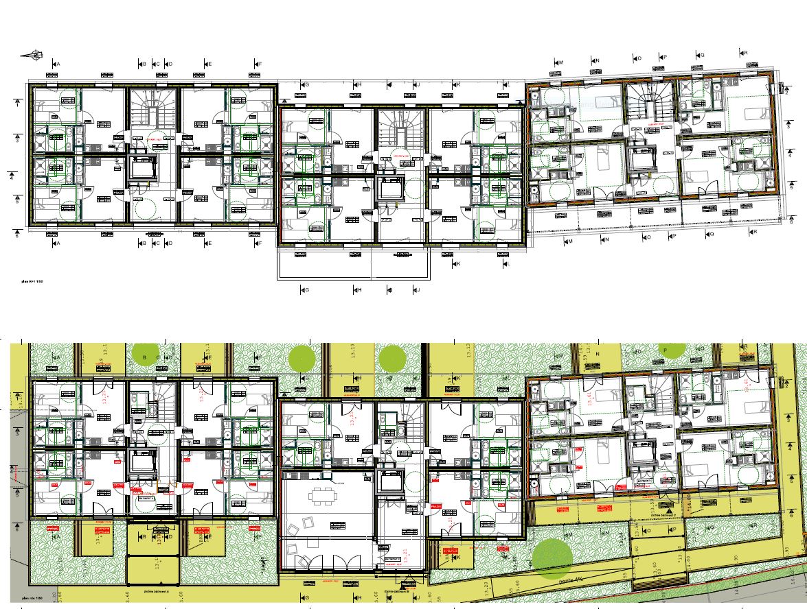 Approche environnementale : Le projet est réalisé 100 % structure Bois ( ossature, plancher, charpente sauf ascenseur) et isolation biosourcée pour les combles. Une isolation renforcée des murs grâce à l'ossature bois propose un système de chauffage à faible investissement. L'ensemble des aménagements extérieurs sont réalisés en châtaigner non traité (soutènement,bancs) et douglas non traité ( pergolas). Ces aménagements apporte la tonalité bois dès l'entrée de l'opération qui se termine par la plantation d'un nouveau verger.