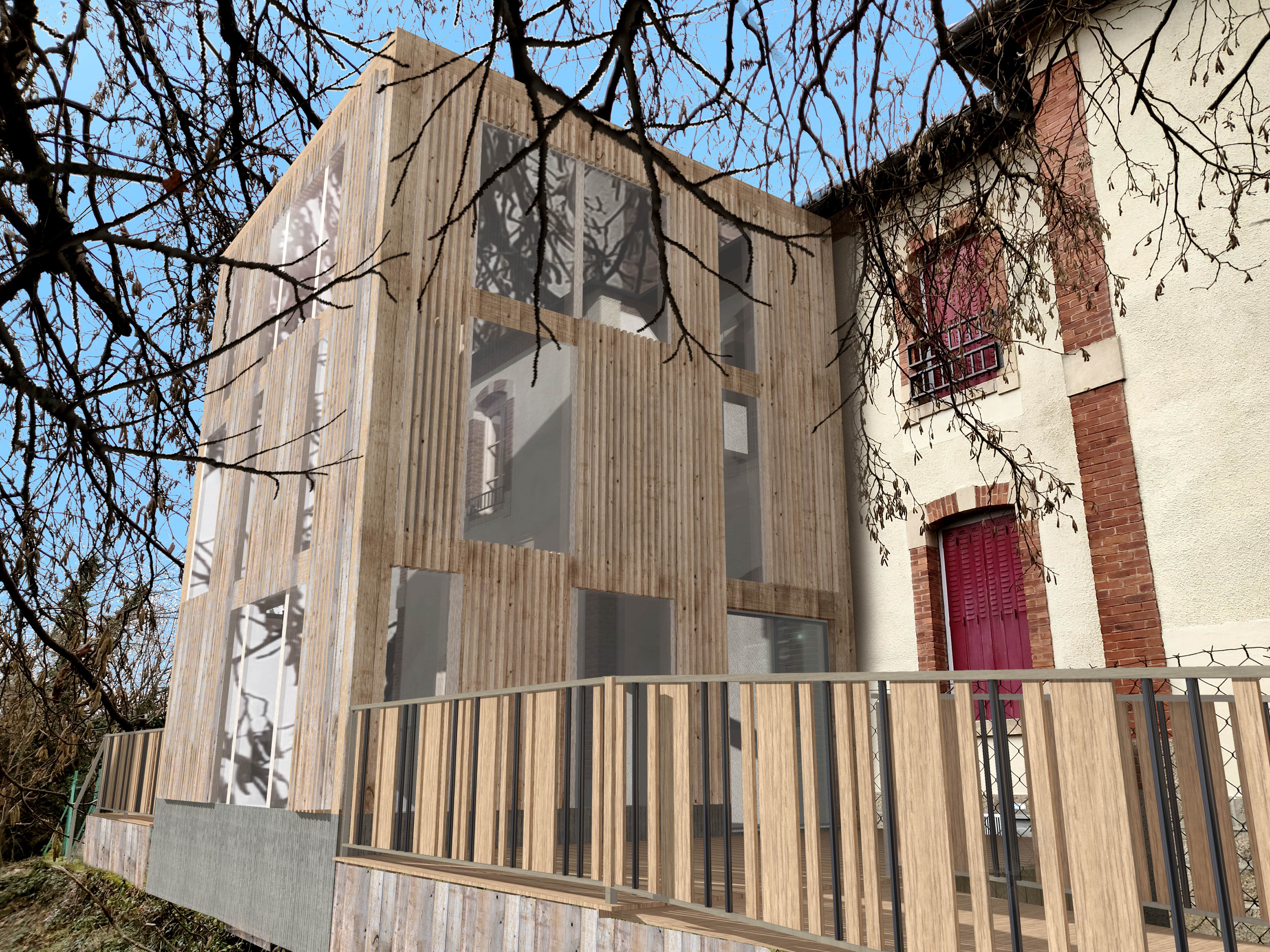 Débuté en 2018, la mairie avait pour projet la rénovation de l’école élémentaire. Le caractère du bâtiment présentait un intérêt architectural que nous avons préservé et mis en valeur par la création d’une extension en bois sur la façade SUD. Ce volume cubique accueille dorénavant l'ensemble des circulations verticales de l'école. (ascenseur et escalier) Un calepinage aléatoire des ouvertures sur l'extérieur permet la découverte du panorama au fil de l'ascension de l'escalier. Des brise-soleil en tasseaux bois extérieurs assurent la protection solaire des utilisateurs.