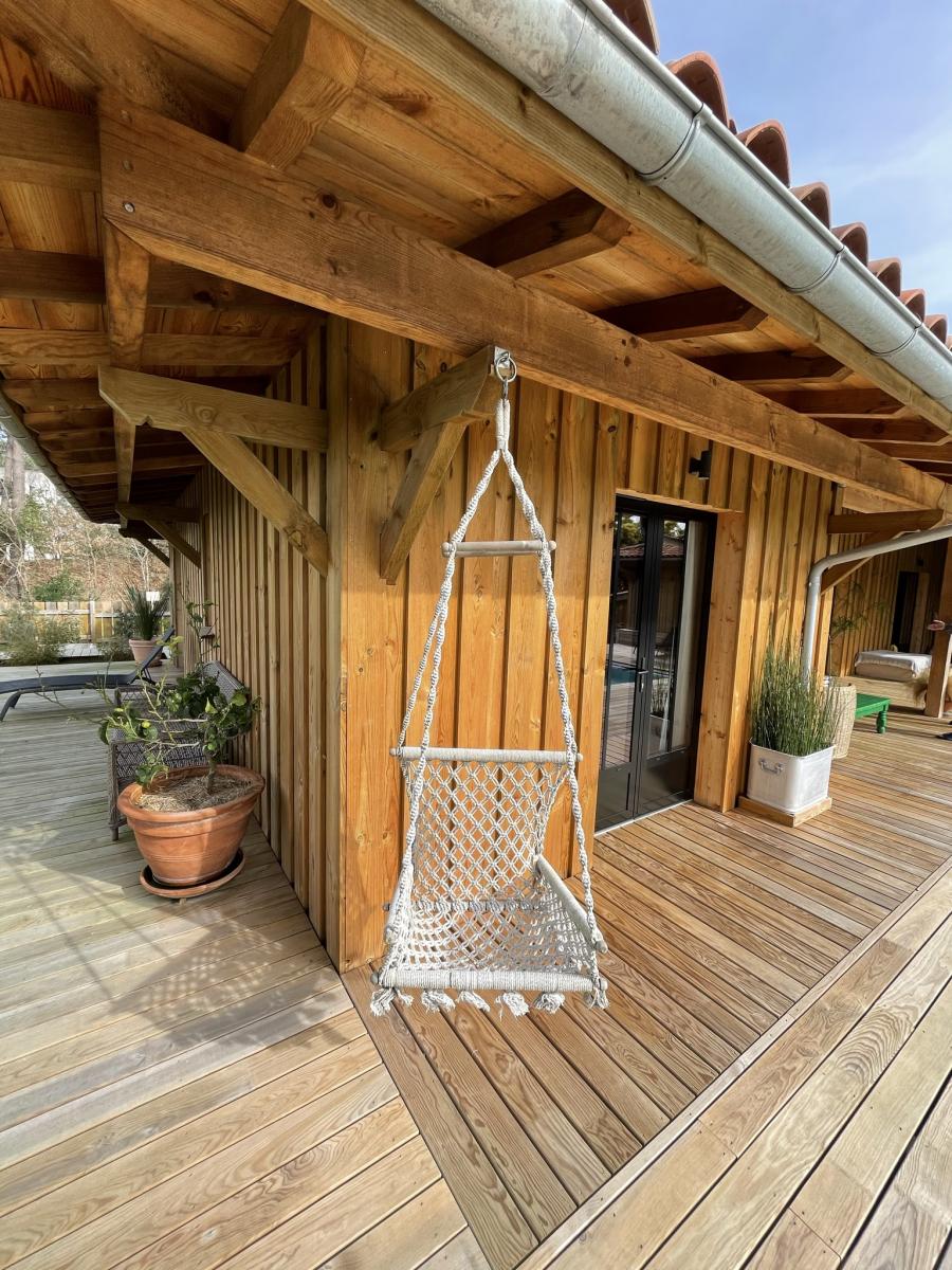 Situé sur la commune de Biscarrosse, le choix architectural de ce projet a été dicté par la tradition des cabanes du bassin d'Arcachon avec de larges avant-toits à coyaux et une pointe d’exotisme asiatique. La maison est ouverte sur une grande terrasse avec cuisine d’été bien abritée pour profiter toute l’année de l’extérieur. Des menuiseries anthracite à barreaux verticaux ont été choisies pour s'accorder avantageusement avec le bardage traditionnel laissé au naturel.