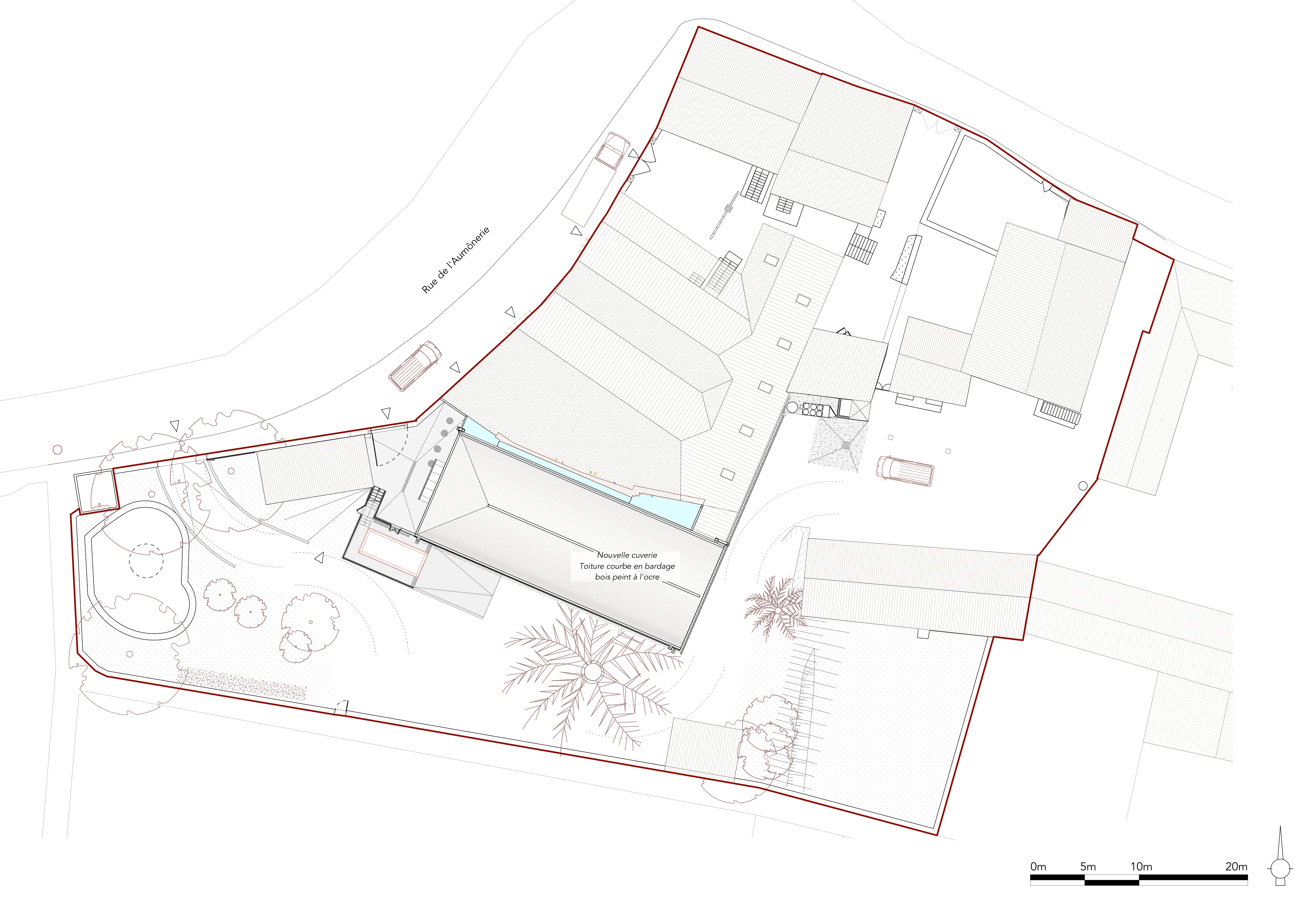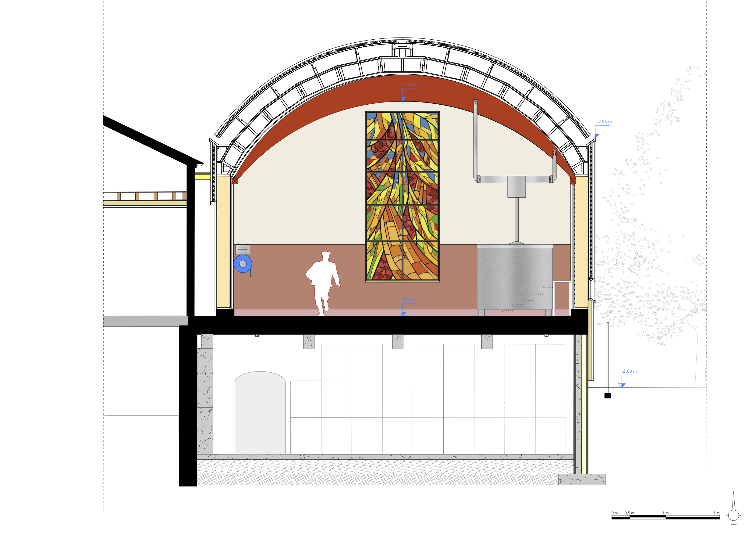 Ce projet est l’extension de la cuverie et des caves d’un Domaine viti-vinicole. La cuverie est une parallélépipède simple fermé par une voute en planche de chêne, facilitant la convection de l’air. La structure porteuse est composée de poutre banane en lamellé-collé permettant de dégager un volume libre de poteaux ou poinçons. L’éclairage naturel est assuré par le vitrail coloré et confère au lieu une atmosphère sereine et noble. La vêture extérieure en douglas peint à l’ocre rouge recouvre l’ensemble du bâtiment toiture comprise pour donner à l’ensemble un caractère uniforme très travaillé.