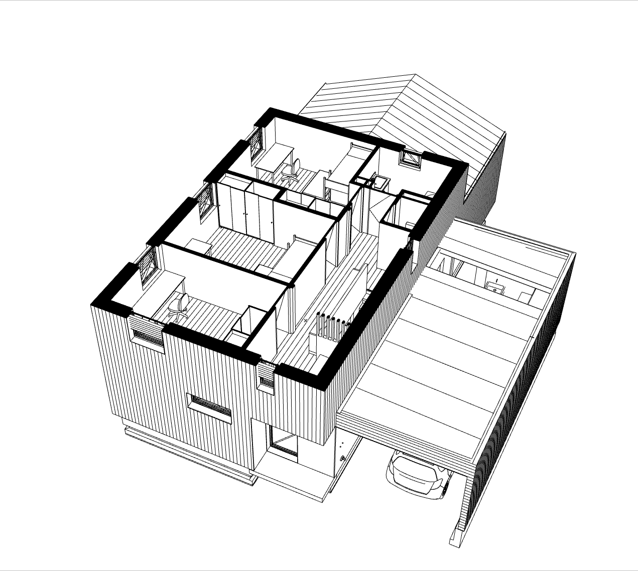 Fonctionnelle et écologique... La maison dispose de beaux volumes habitables sous les doubles rampants couverts de zinc. Au rez-de-chaussée, les pièces de vie s'ouvrent au Sud (apports solaires) et vers une terrasse en bois intégrée au jardin à l'Ouest. A l'étage, les volumes sous rampants permettent des aménagements évolutifs des chambres d'enfant. Le parti architectural met en valeur les caractéristiques du mode constructif: la dalle de béton quartzé du RdC, les panneaux de bois massif contre-collé (CLT) et le réseau de VMC en acier galvanisés sont laissés apparents.