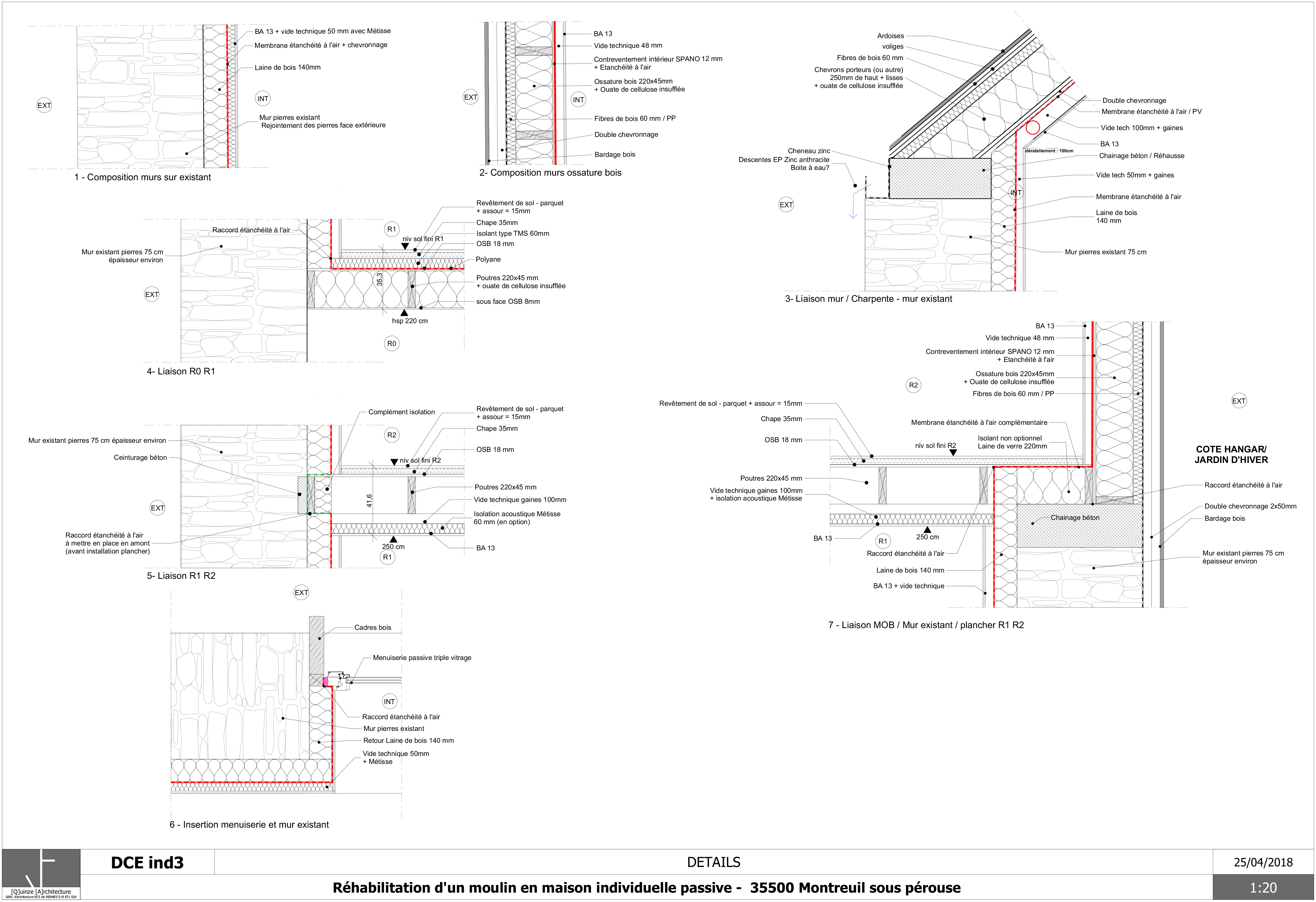 Approche environnementale : Matériaux utilisés biosourcés. Trois murs en pierre existants conservés, sauf en façade Sud où le mur est en ossature bois. Charpente bois neuve. Plancher intermédiaire neuf. Plancher RdC bois conservé. La peinture utilisée est une peinture ALGO, 100% à base d'algues et locale. Parquet massif au sol et plinthes en bois. Cadre en chêne soulignant les menuiseries. - Isolation murs pierres : Laine de bois 140mm + Métisse 50mm - Isolation murs ossature bois : Fibre de bois Dense 60mm + Ouate de cellulose insufflée 220mm. -Isolation du plancher : Ouate de cellulose insufflée 220mm + TMS 60mm