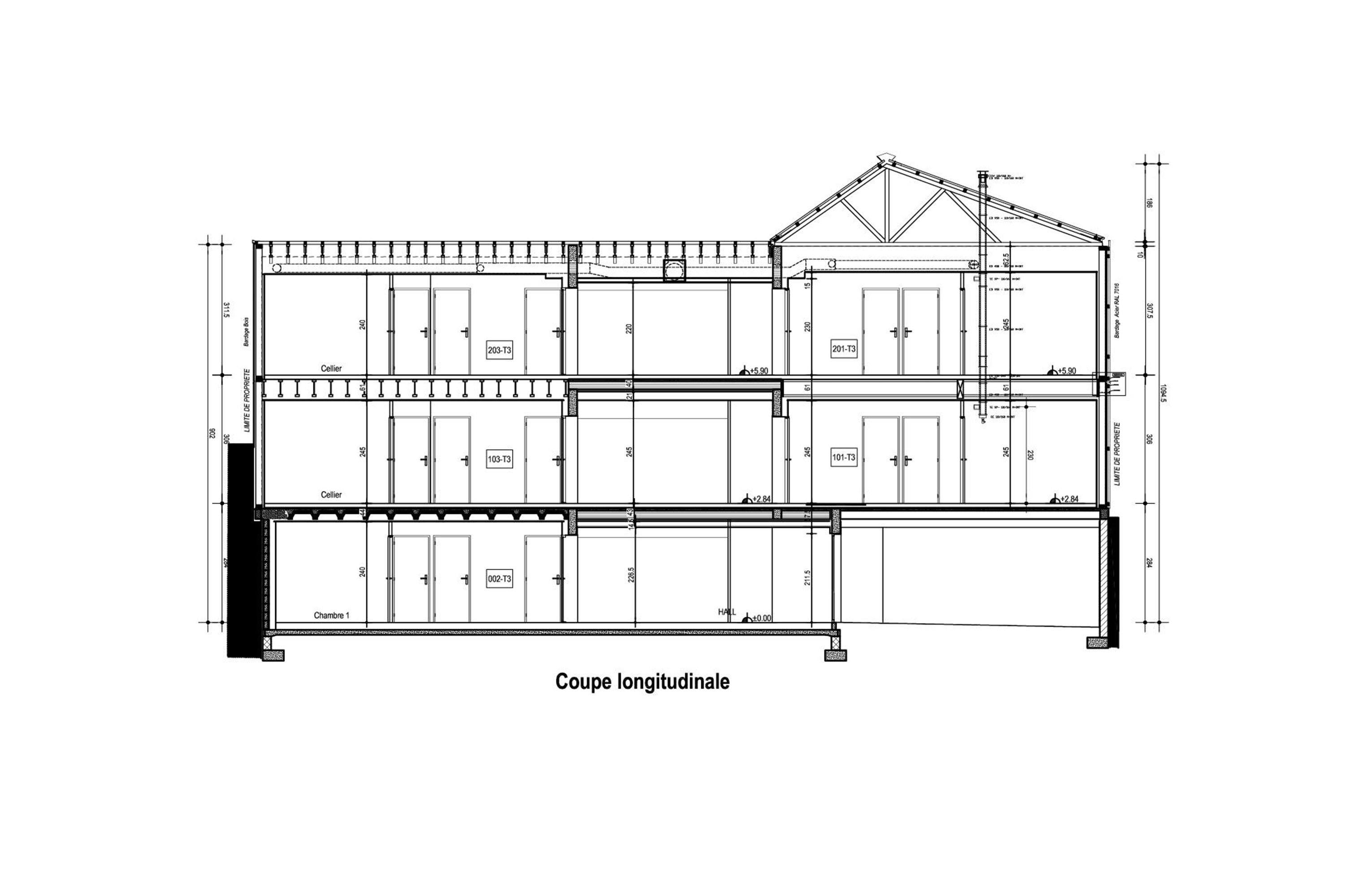 Descriptif technique : Le volume des logements collectifs reprend des éléments de l’architecture traditionnelle de la commune (toiture, matériaux, ouvertures ...) tout en proposant une image résolument contemporaine.