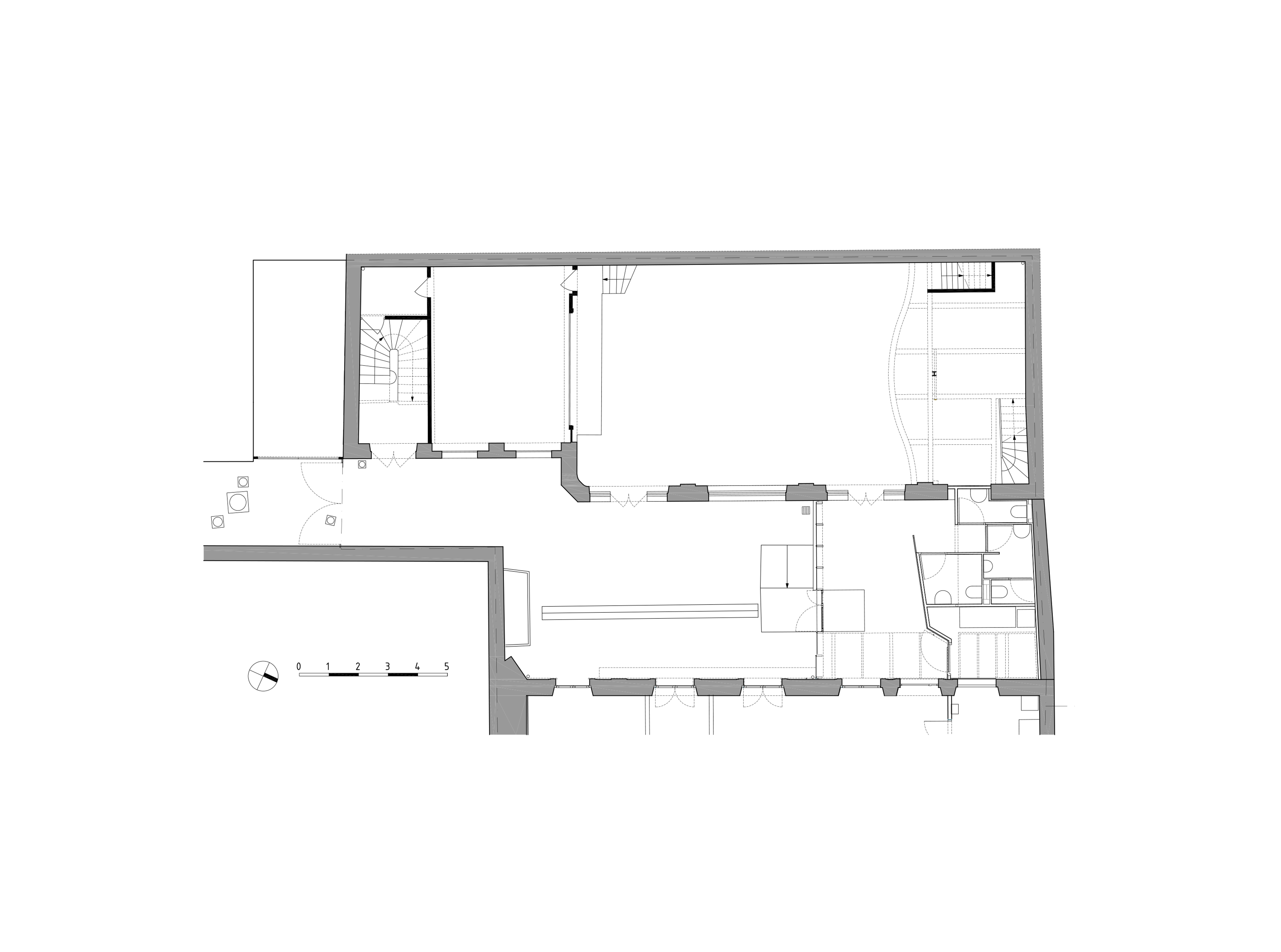 Descriptif technique : Si l’installation d’une ventilation double flux a permis d’améliorer le confort d’été et d’hiver, la restructuration d’un tel édifice implique prioritairement l’amélioration de son enveloppe. L’isolation intérieure a donc été entièrement revue (laine de roche pour les parois verticales et insufflation de ouate de cellulose en combles) tandis que les menuiseries extérieures existantes ont été remplacées. La mise en œuvre de matériaux de finition biosourcés - principalement du sapin et de l’épicéa - assure un confort d’usage notable pour les membres de l’association et le public accueilli.