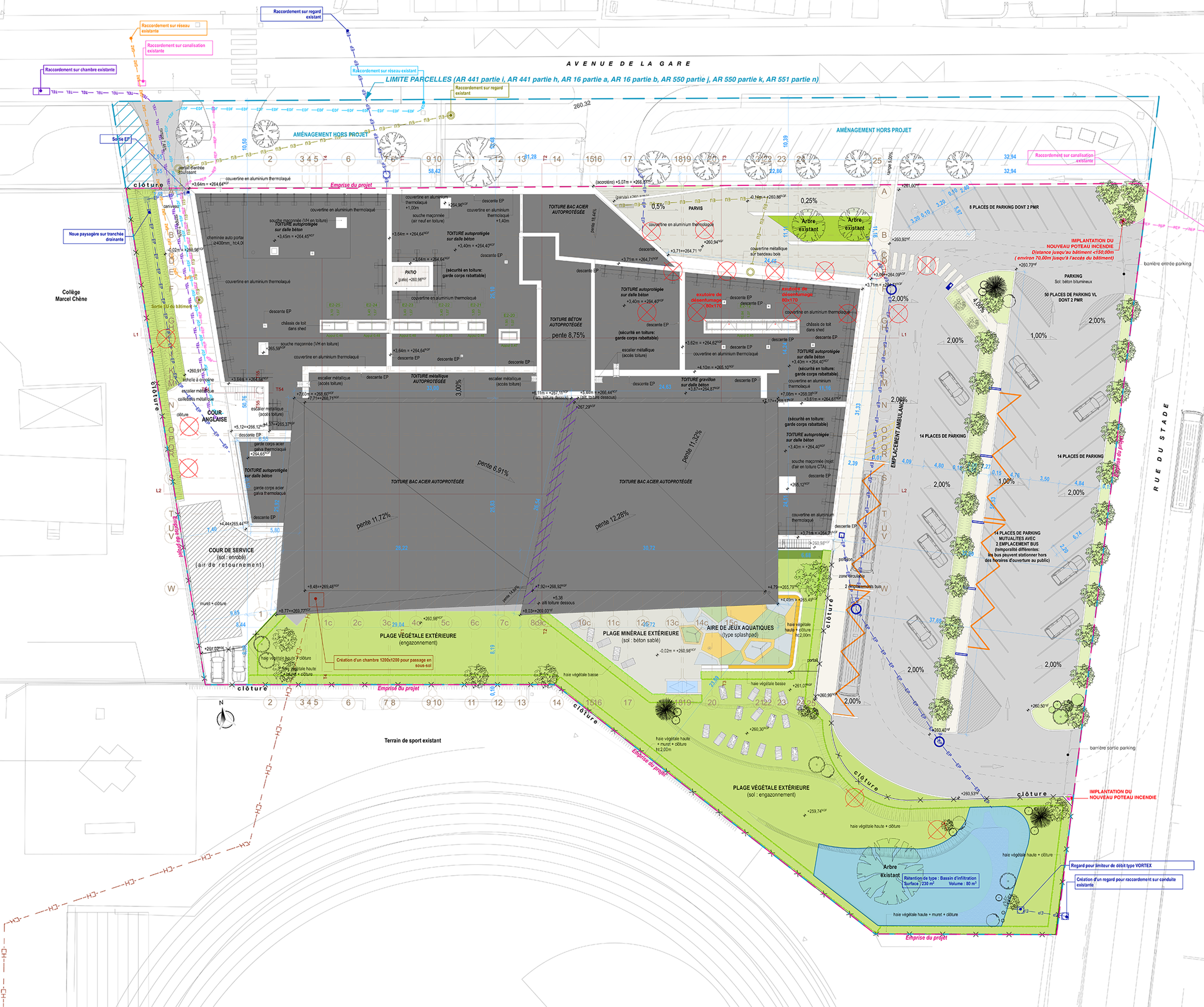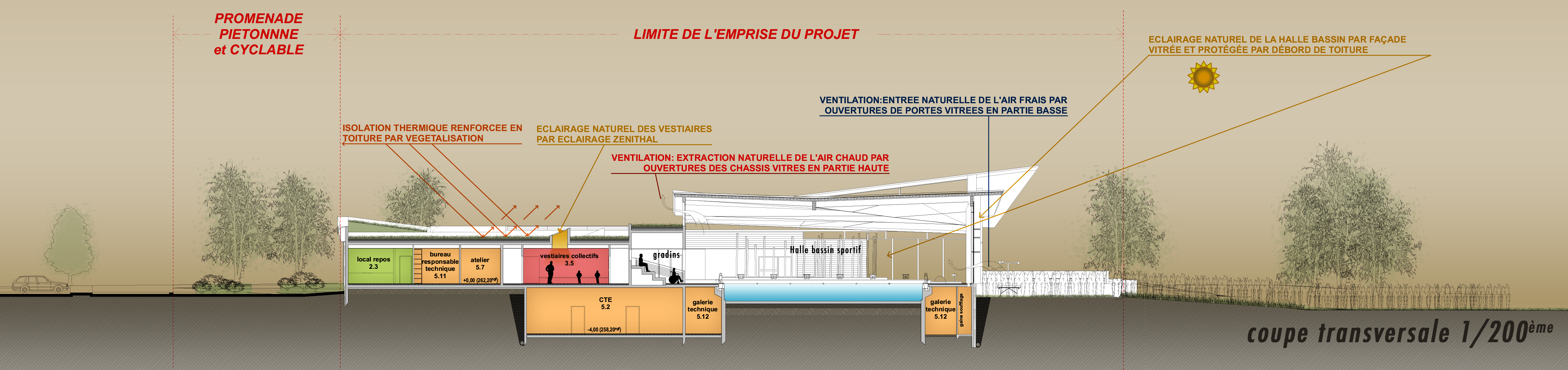 Approche environnementale : La co-conception architectes/ingénieurs s’inscrit dans une logique de DIMINUTION DES BESOINS, de gestion du CONFORT d’ETE et d’un RECOURS AUX ENERGIES RENOUVELABLES. Le projet s’inscrit dans la durée avec une approche en amont des sujétions d’EXPLOITATION & MAINTENANCE pour conserver la performance dans le temps. Bien que non soumis à la RT20212, l’enveloppe thermique, la gestion des ponts thermiques, l’étanchéité à l’air et les protections solaires ont été traités avec une très grande attention. Les besoins thermiques du bâtiment sont très faibles et le confort des usagers de haut niveau.