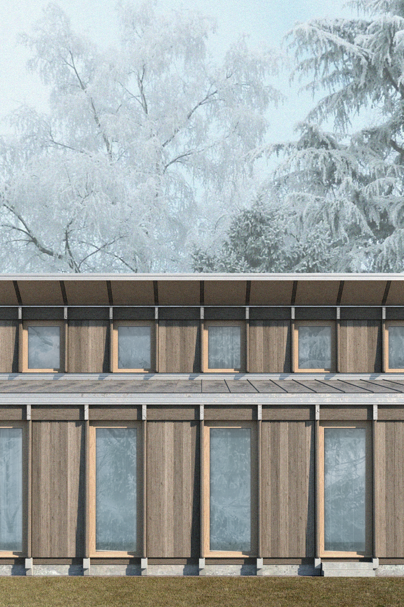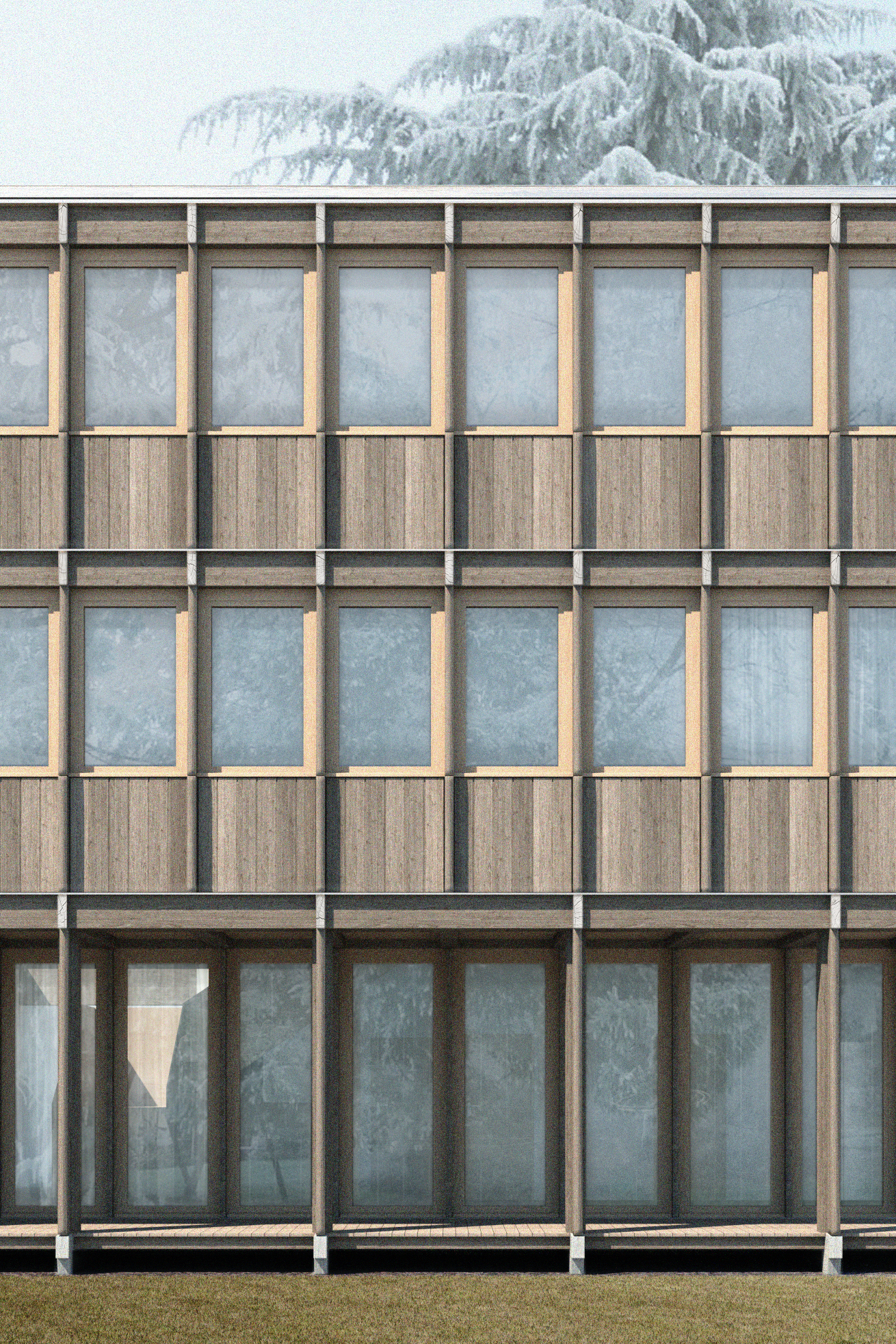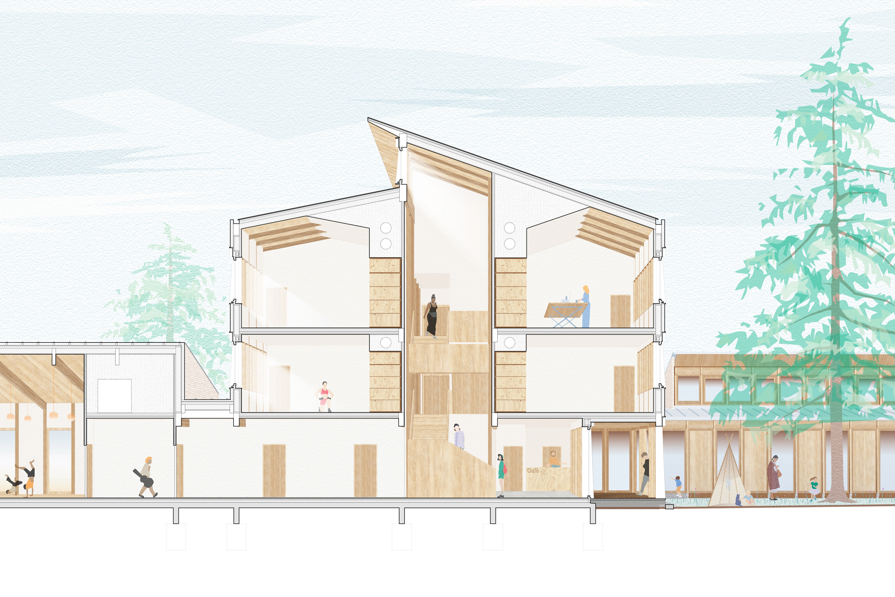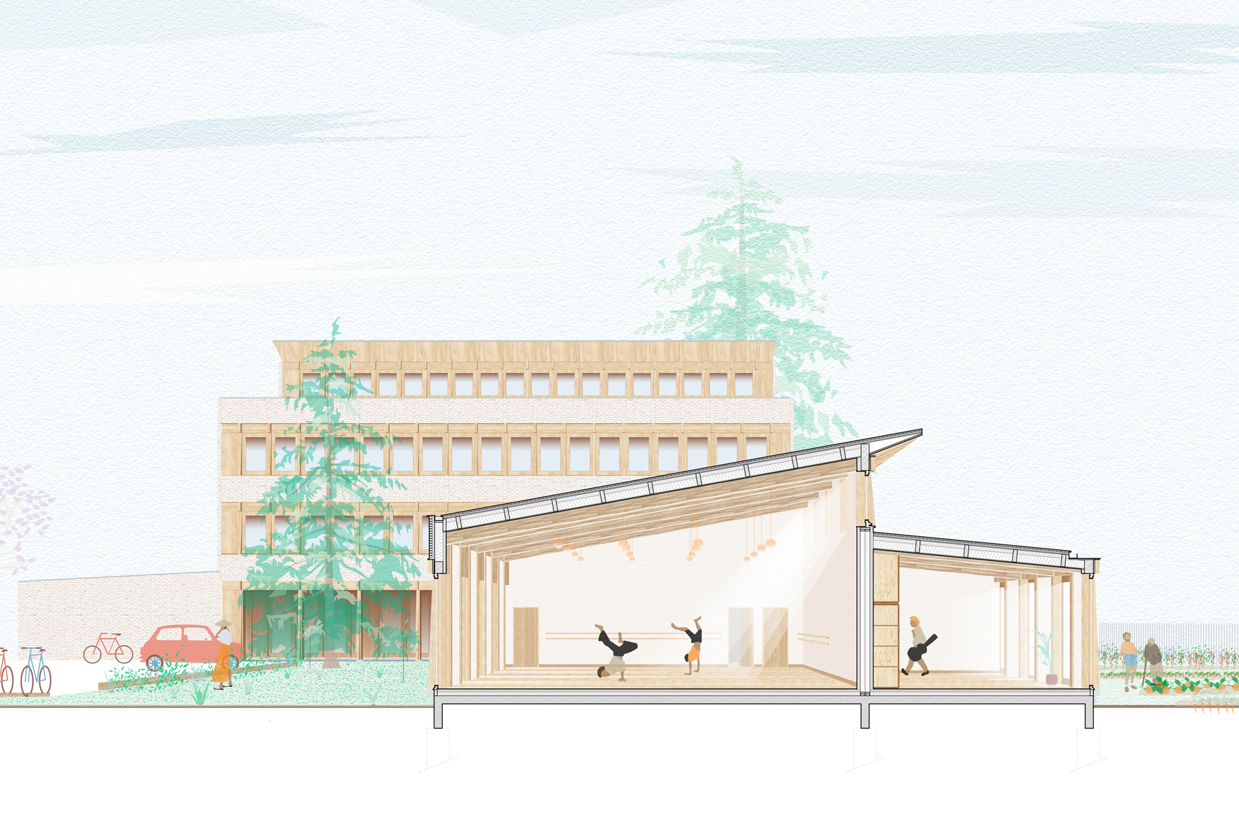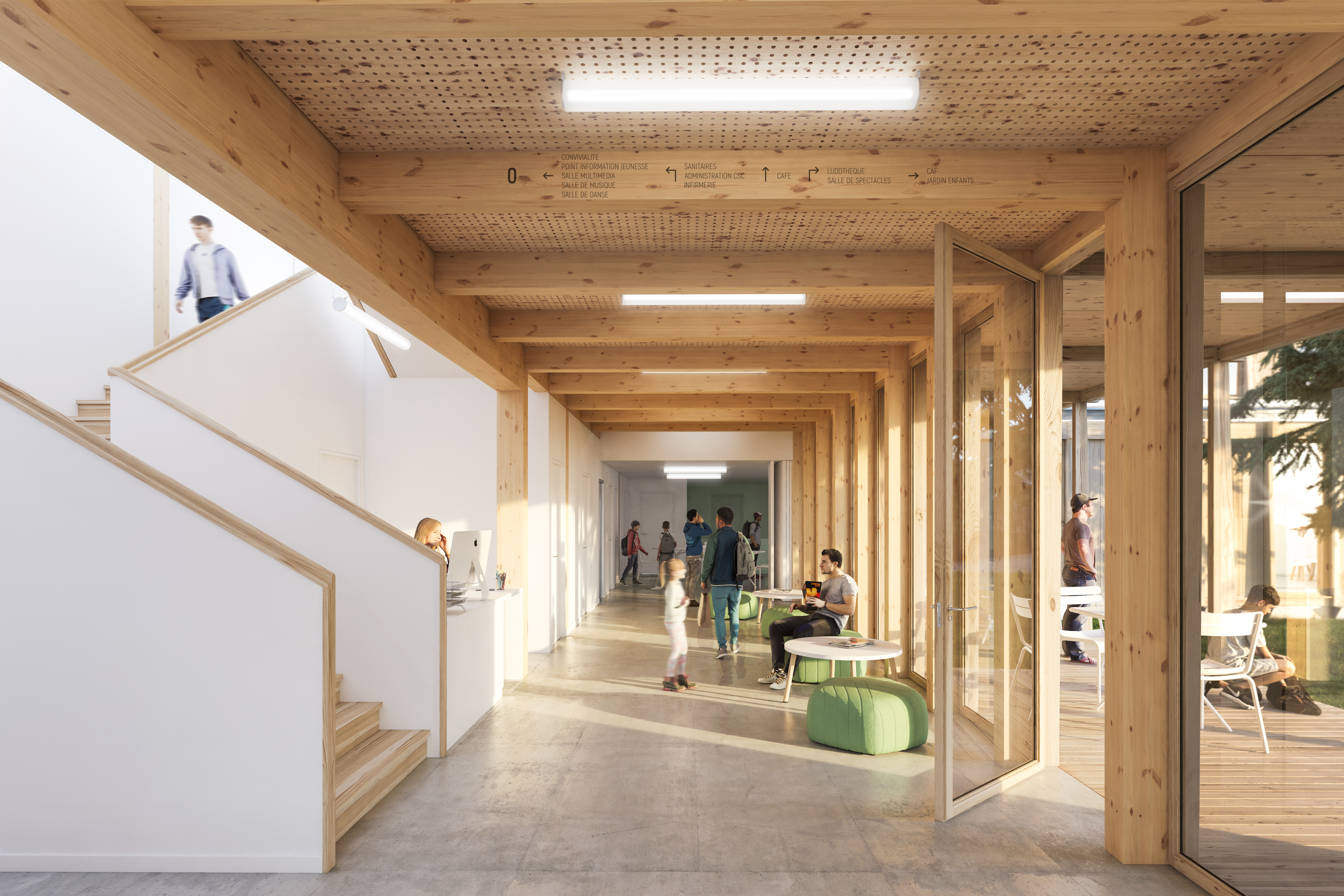 Descriptif technique : Le projet se compose d'un corps central en R+2 et de 2 ailes en simples RdC coiffés de zinc. Le corps central du projet est constitué d'une structure poteau-poutre lamellé-collé sur 3 niveaux. Les planchers intermédiaires mixtes bois-béton permettent d'assurer l'acoustique et le coupe-feu entre niveau, et participent au contreventement avec la cage d'escalier en CLT. La charpente est constituée d'arbalétriers en bois lamellé-collé supportant des caissons de toiture préfabriqués, tandis que les façades sont réalisées en mur à ossature bois habillées de briques ou de bois selon localisation.