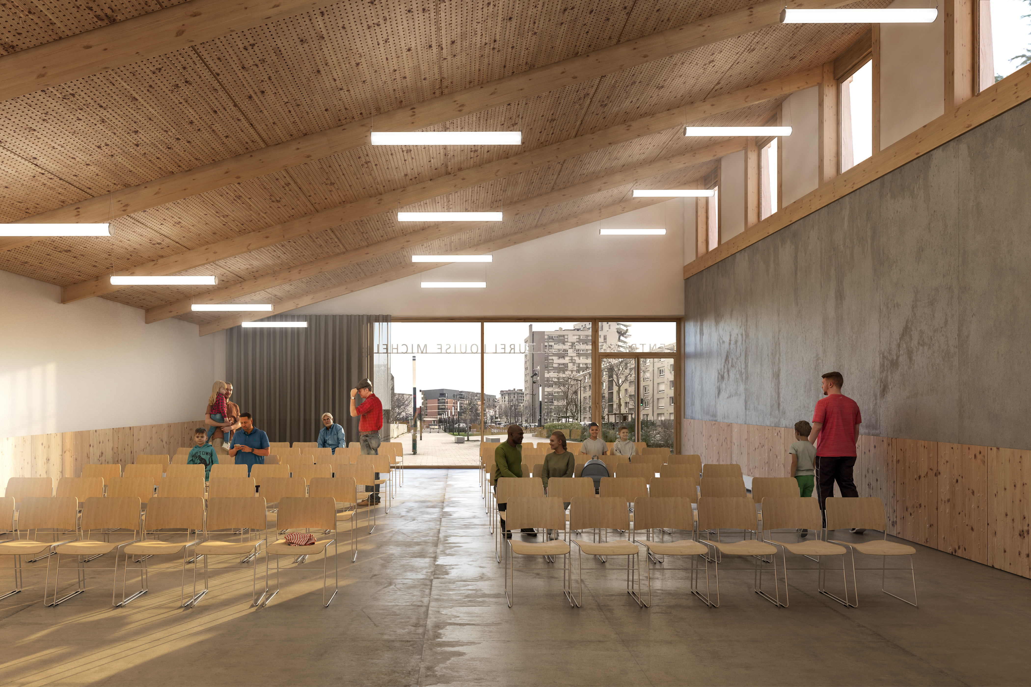 Approche environnementale : Dans une logique de ville durable qui conjugue culture, aménité et écologie, l’expression architecturale du bâtiment met en scène sa construction bois et les principes bioclimatiques qui ont présidé à sa conception. Toutes les fonctions sociales, culturelles et symboliques du quartier sont rassemblées dans une logique de mutualisation qui optimise les ressources - humaines, matérielles et énergétiques - et favorise leurs synergies. Outre le bois de la structure, les matériaux biosourcés y sont privilégiés ; sols linoleum, peintures à faible émissivité, parquets et revêtements muraux bois.