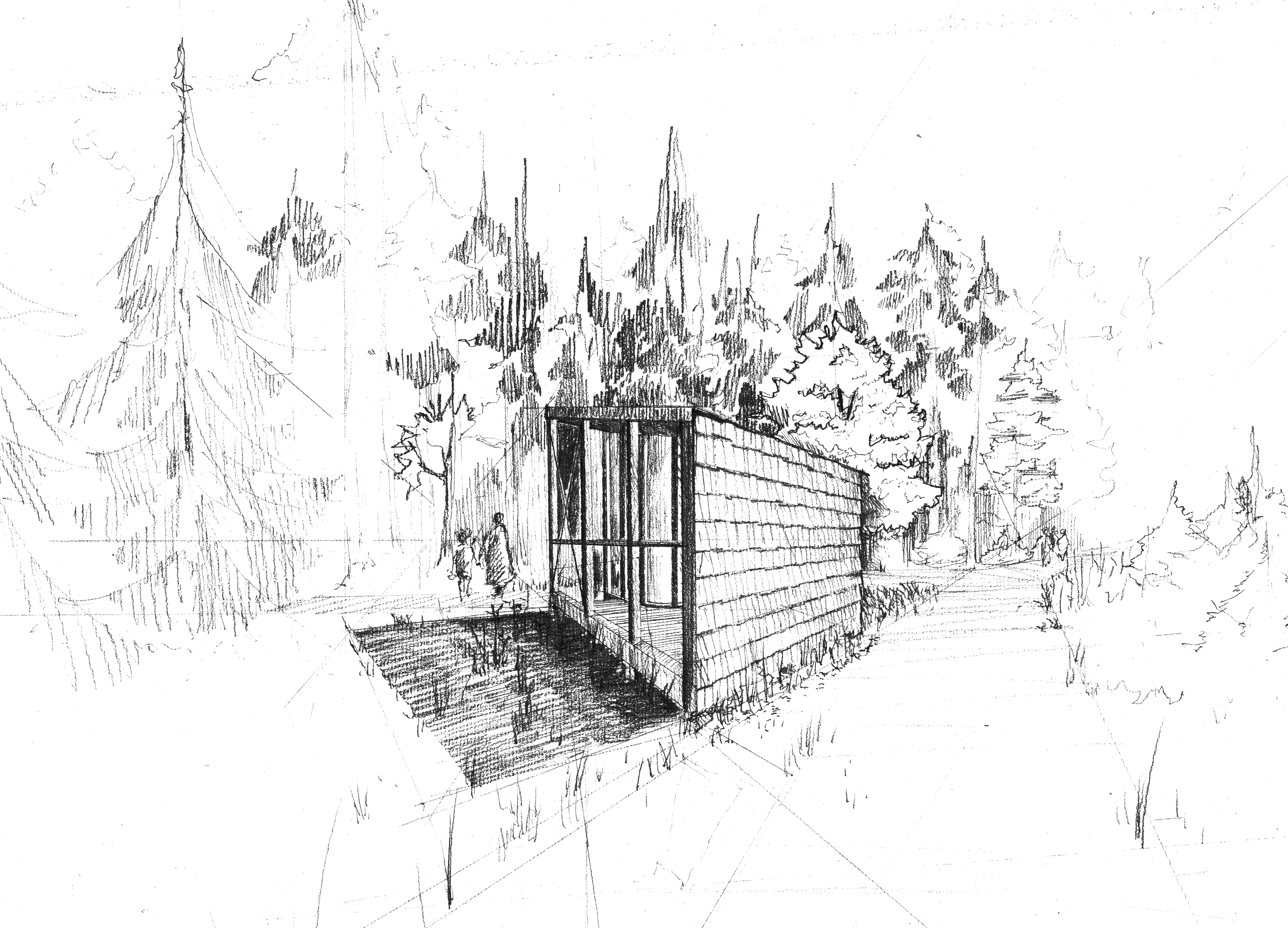 L'abri est un projet réalisé en hommage à Jean Maegey (1931-2017), ancien président de Fibois Alsace. Situé à la croisée de plusieurs sentiers, c'est un lieu de halte et de mémoire dont la vocation est aussi de montrer l'évolution des savoir-faire de la filière forêt-bois. Une vue est dégagée au sud vers les jeunes plantations tandis qu'une courbe met en valeur un hêtre remarquable du site. La toiture recouverte de tavaillons se prolonge en une paroi qui protège des vents du nord. A l'intérieur, une plaque commémorative ainsi qu'une large table invitent les promeneurs à s'arrêter un moment.