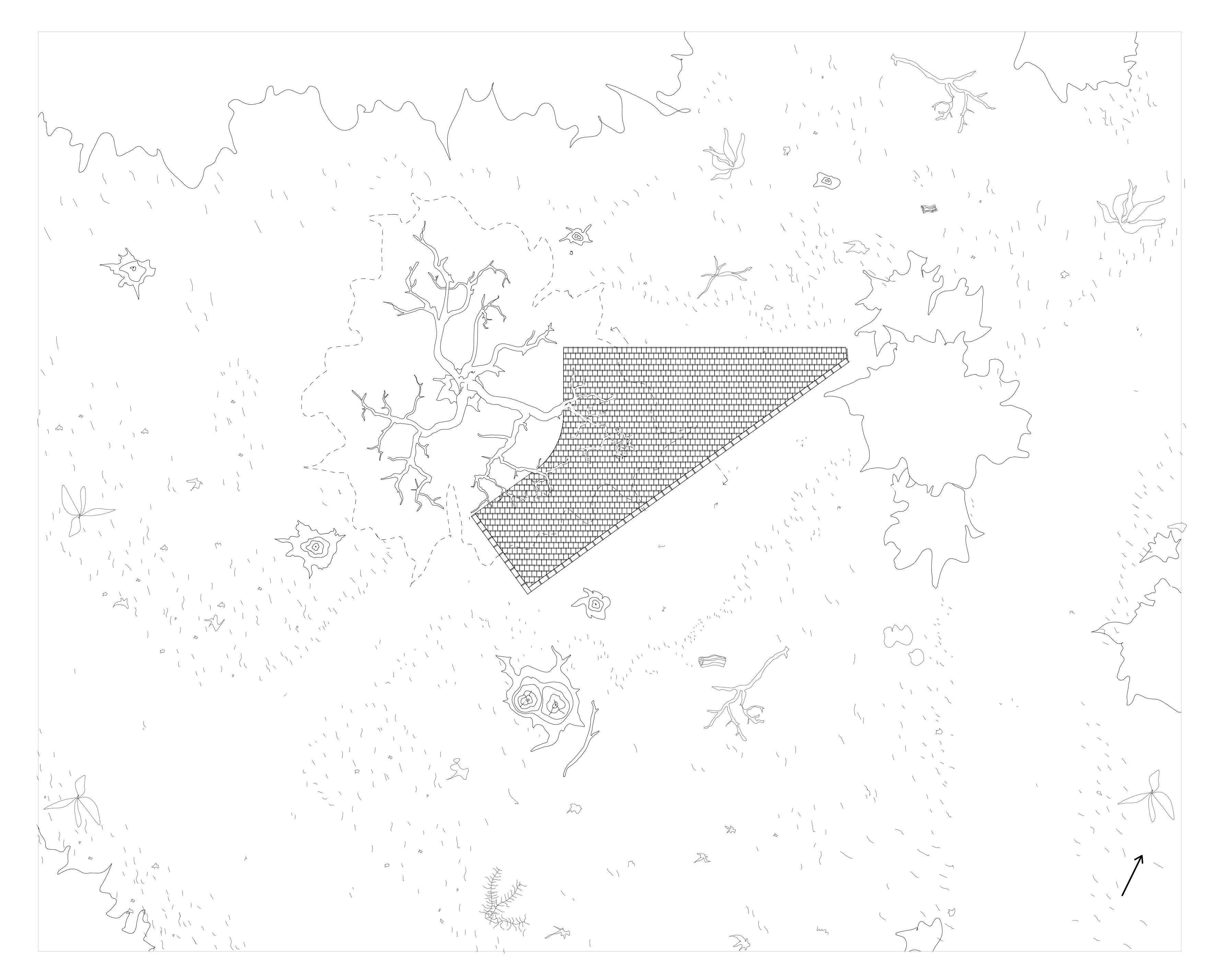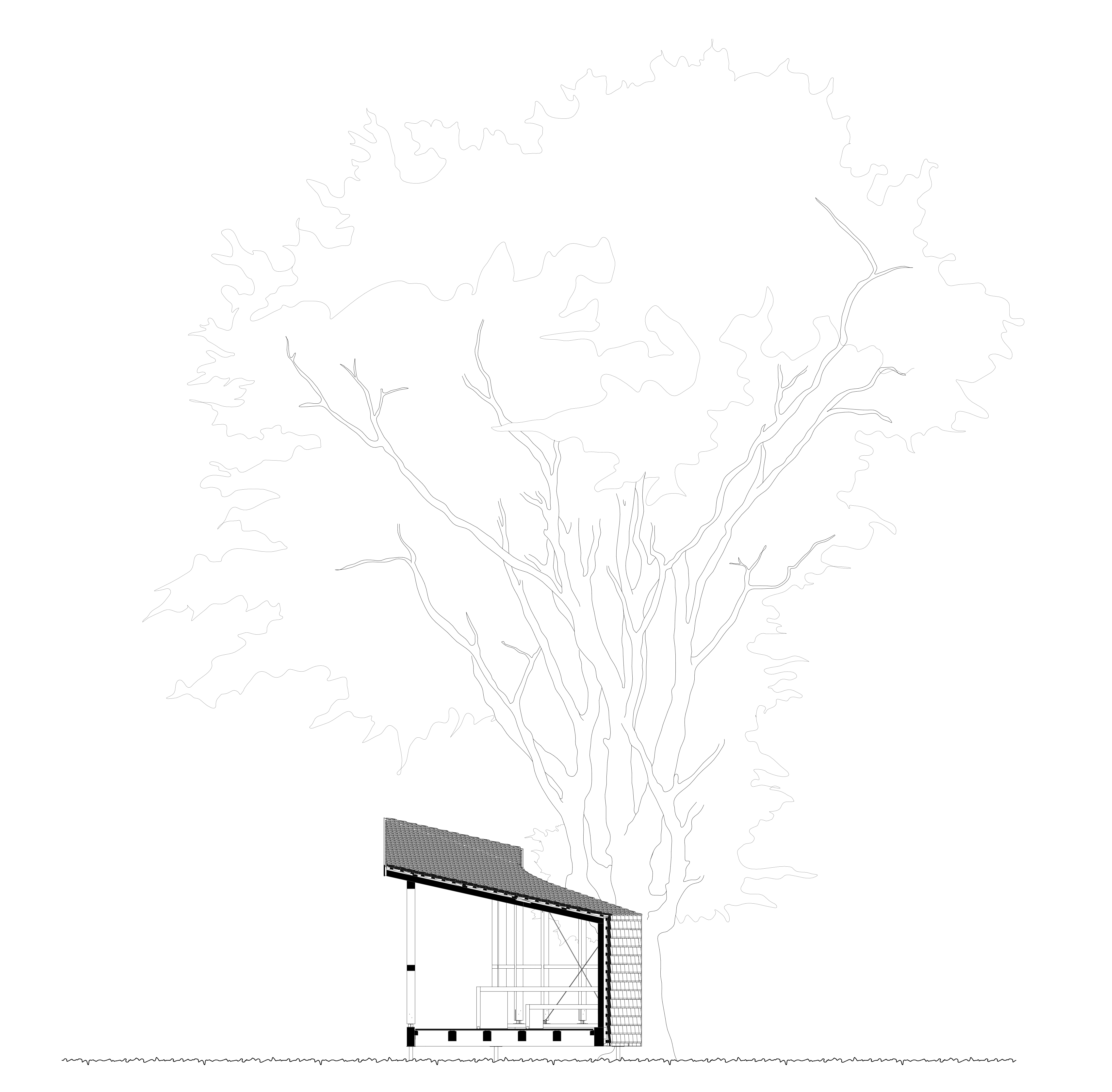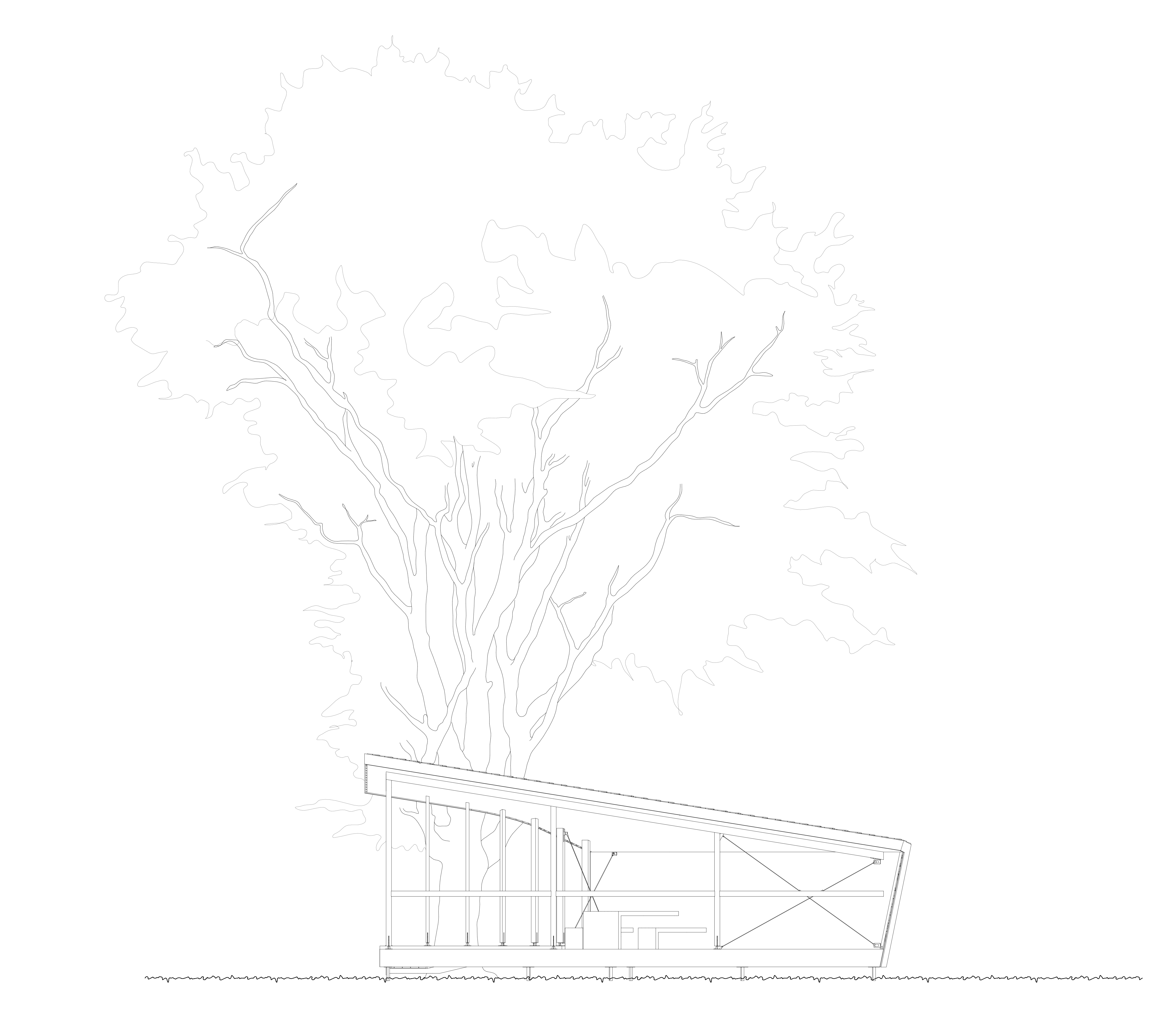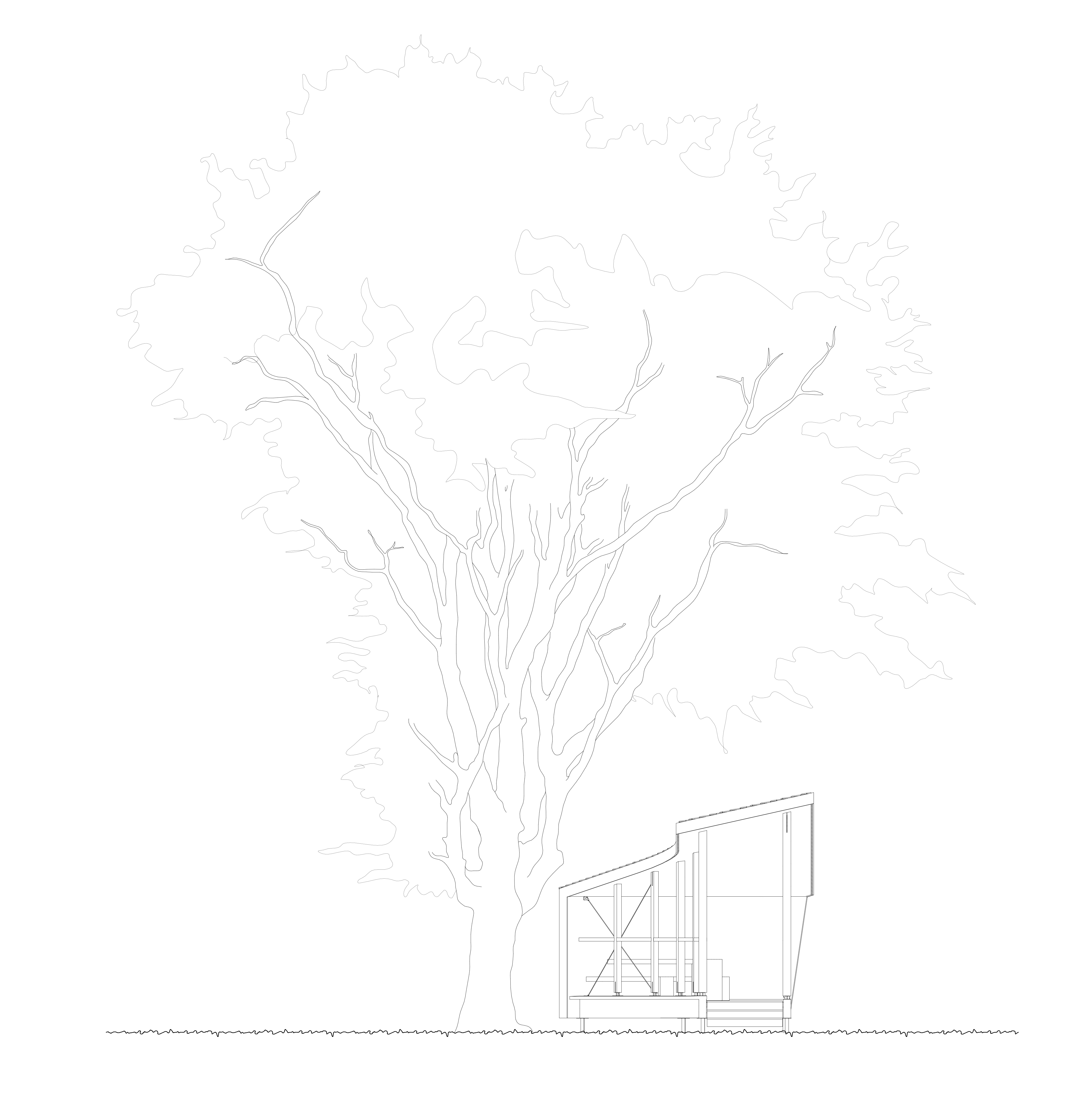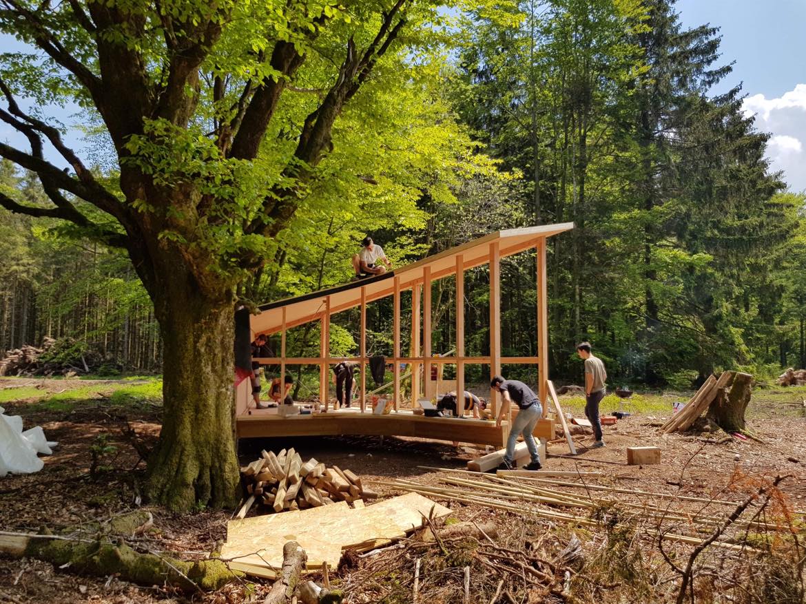 Trois sommiers en bois lamellé collés reposent sur des fondations micro-pieux en acier afin de limiter l'empreinte au sol du bâtiment et de séparer le bois du sol. Sur ces sommiers reposent une paroi en CLT ainsi que dix poteaux en bois massif Douglas qui supportent une grande toiture formée de plusieurs panneaux CLT assemblés. Le solivage supporte un platelage en châtaignier et un mobilier intérieur constitué des chutes des panneaux CLT. La couverture est constituée de tavaillons en châtaignier triple recouvrement, réalisé par une entreprise locale de réinsertion professionnelle.
