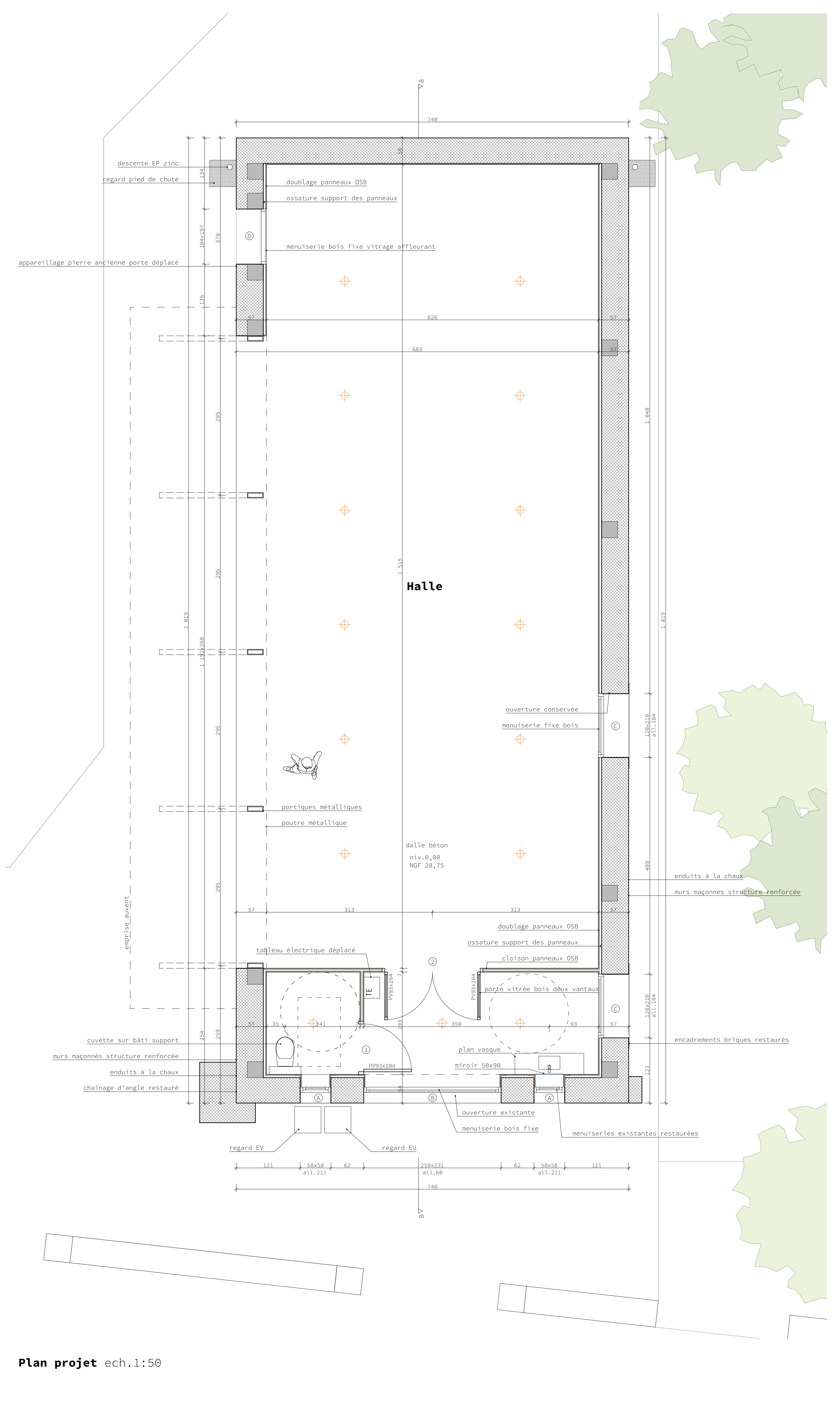 Approche environnementale : La couverture est remplacée. La charpente est renforcée par l’utilisation de pièces moisées. L’intérieur du volume est habillé de panneaux de bois OSB sur ossature bois pour permettre les jeux de balle et le mur pignon est enduit. Le jardin entourant la halle est aménagé en plusieurs espaces dont un fronton. Toutes les cloisons sont également réalisées en panneaux de bois OSB sur ossature bois. Les menuiseries sont reconstruites à l’identique des menuiseries existantes en bois.
