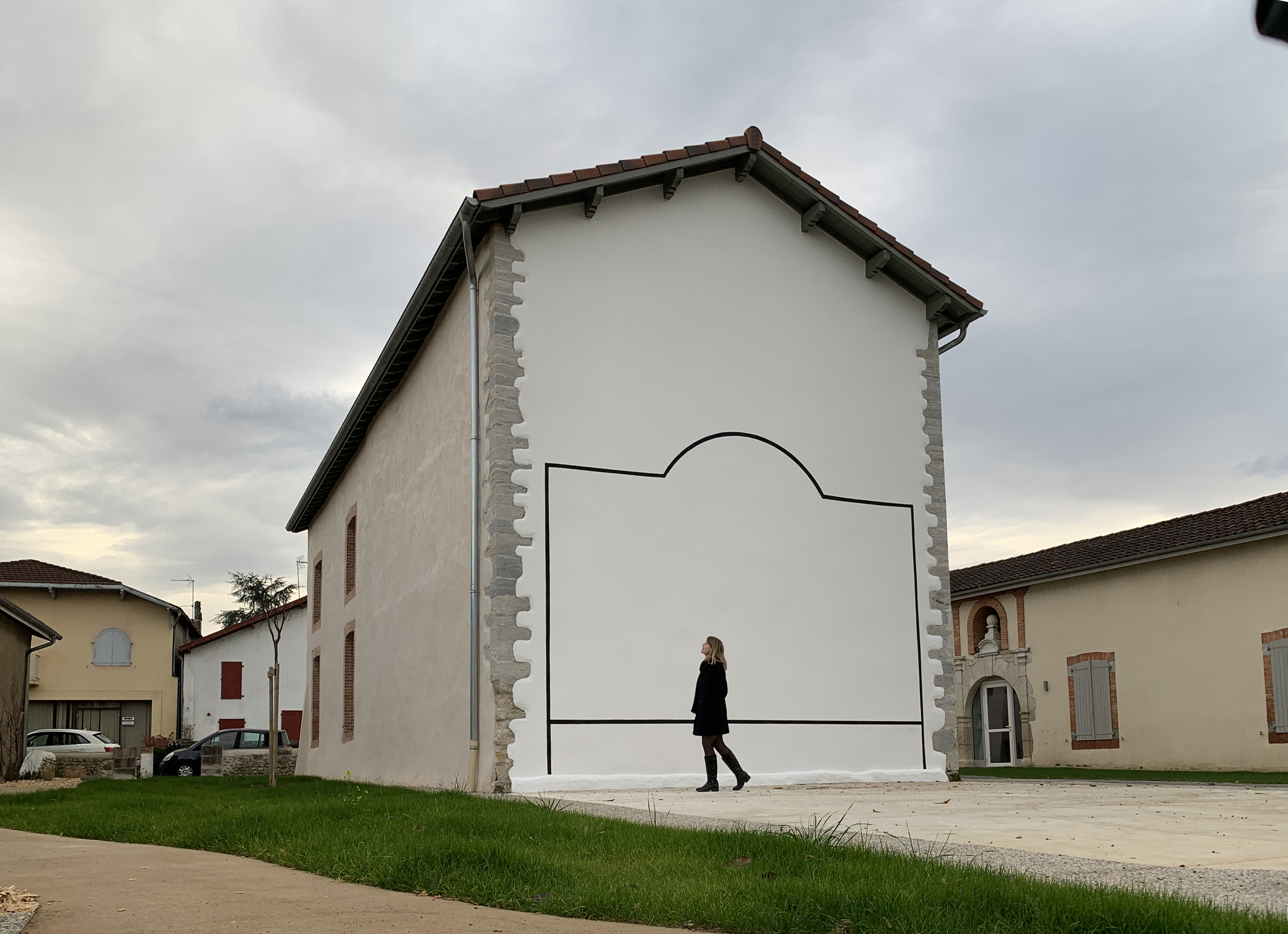 Le bâtiment de l’ancien cinéma est conservé, réhabilité et transformé en halle. Il s’agit d’un bâtiment du XVIIe siècle. La façade Ouest est largement ouverte afin de permettre l’accès et de créer une relation entre le bâtiment et l’extérieur. Un auvent en structure métallique, habillé de bois en sous-face et couvert de polycarbonate protège l’accès. Les ouvertures existantes sont conservées et réhabilitées. Les menuiseries sont remplacées. L’ornement de la porte existante de la façade Ouest est déplacé sur cette même façade et vient habiller une nouvelle menuiserie fixe.