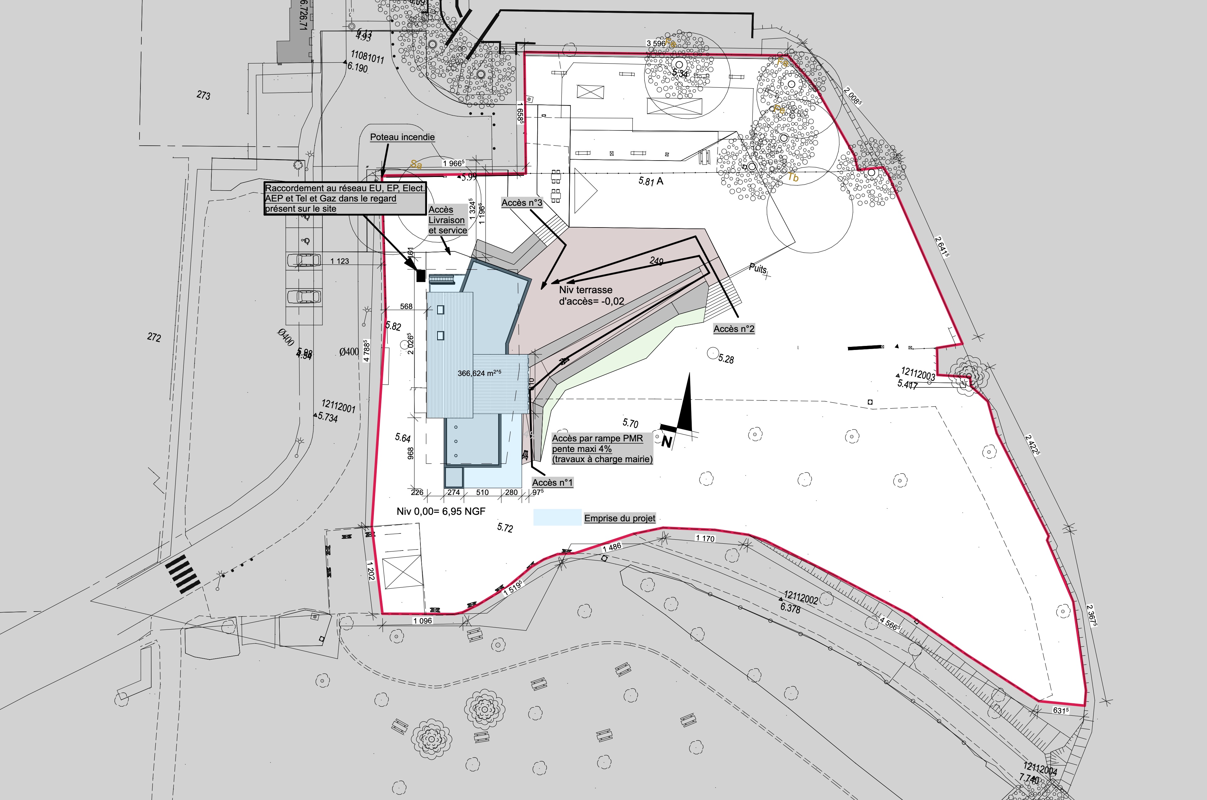 Approche environnementale : Le projet s'insère dans une démarche environnementale globale. Bâtiment proche passif, il emploi des matériaux biosourcés de qualité. Les bois ne sont pas traités et les isolants sont biosourcés (hors sol). Ils ont été choisis selon leur performance d'isolation et de confort d'été. Le bois, très présent à l'extérieur par le bardage, l'est également dans les aménagements intérieurs (claustras, palettes en plafond, mobilier). Le confort acoustique est traité avec des plaques de plâtre perforées sans laine et des plaques de fibre de bois. Des nichoirs à oiseaux ont été insérés dans les murs.