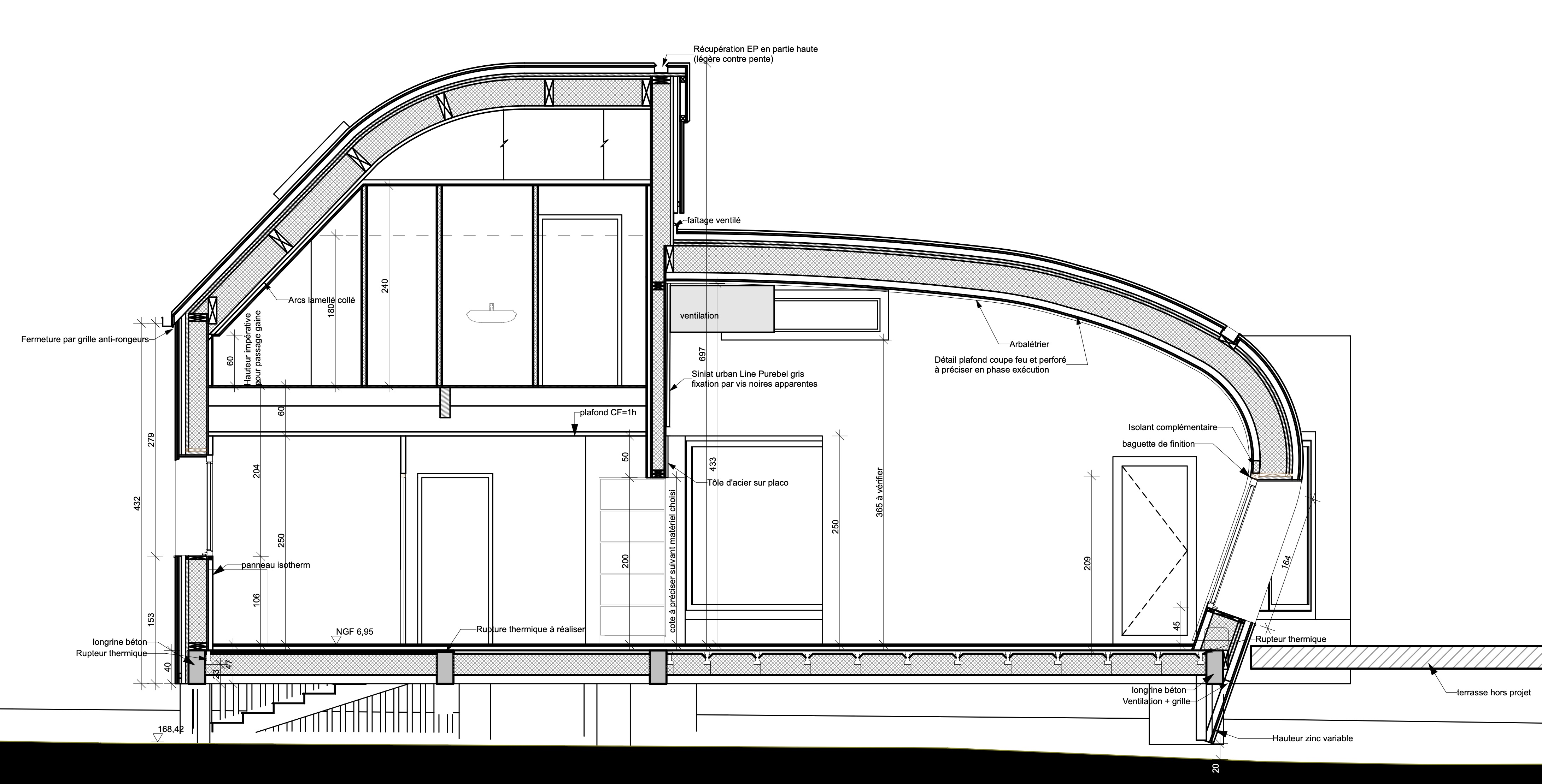 Descriptif technique : Le restaurant est construit sur pilotis pour respecter la cote d'inondabilité à Nort sur Erdre. Sur un plancher béton, le bâtiment est entièrement à ossature bois. Les caissons d'ossature sont fermés à l'extérieur par un panneau de fibre de bois et à l'intérieur par un panneau d'OSB E0 qui fait également l'étanchéité à l'air et sont remplis de ouate de cellulose. Les toitures terrasses, partiellement végétalisées, sont des toitures froides ventilées; ce qui permet de mettre en oeuvre des isolants biosourcés également en toiture. Les matériaux biosourcés représentent plus de 90kg par m2. PEFC (Gestion forestière durable) Marquage CE