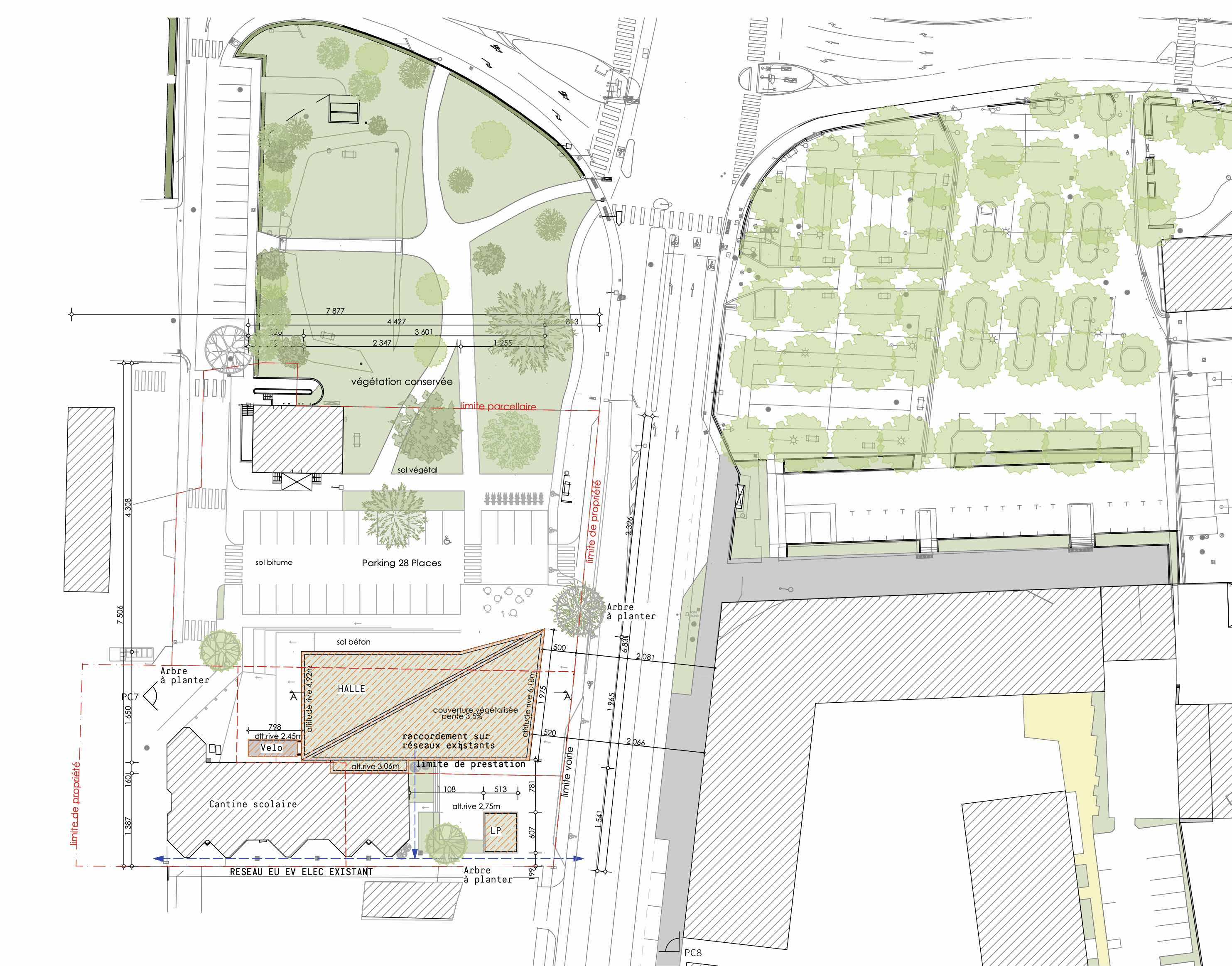 Descriptif technique : L'ossature est en sapin pectiné des Pyrénées-Atlantiques. Le bardage est en douglas de Nouvelle-Aquitaine. Les panneaux de bois muraux et les supports d'étanchéité OSB en sapin. La toiture et l'étanchéité sont végétalisés. PEFC (Gestion forestière durable) Marquage CE