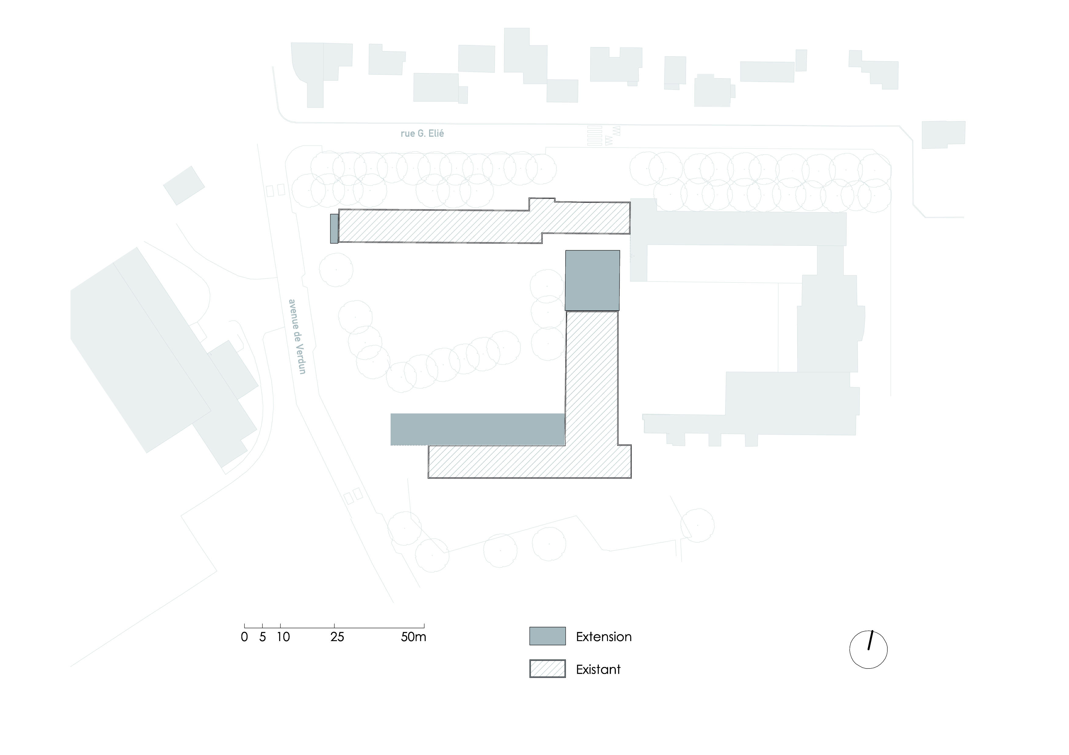 Approche environnementale : Les points environnementaux principaux sont : - Travail sur les EP par la création de noue pour retenir l'eau avant infiltration. Rétention en toiture existante, - végétalisation importante des cours pour lutter contre les îlots de chaleur, - réutilisation de matériaux de démolition pour des équipements de cours - Captation passive de CO2 par une forte utilisation de bois en structure et parure, - Eclairage en second jour des circulations - Ventilation naturelle - VMC double flux dans le bâtiment créé - Occultations des fenêtres orientées sud et ouest par brise-soleil fixes