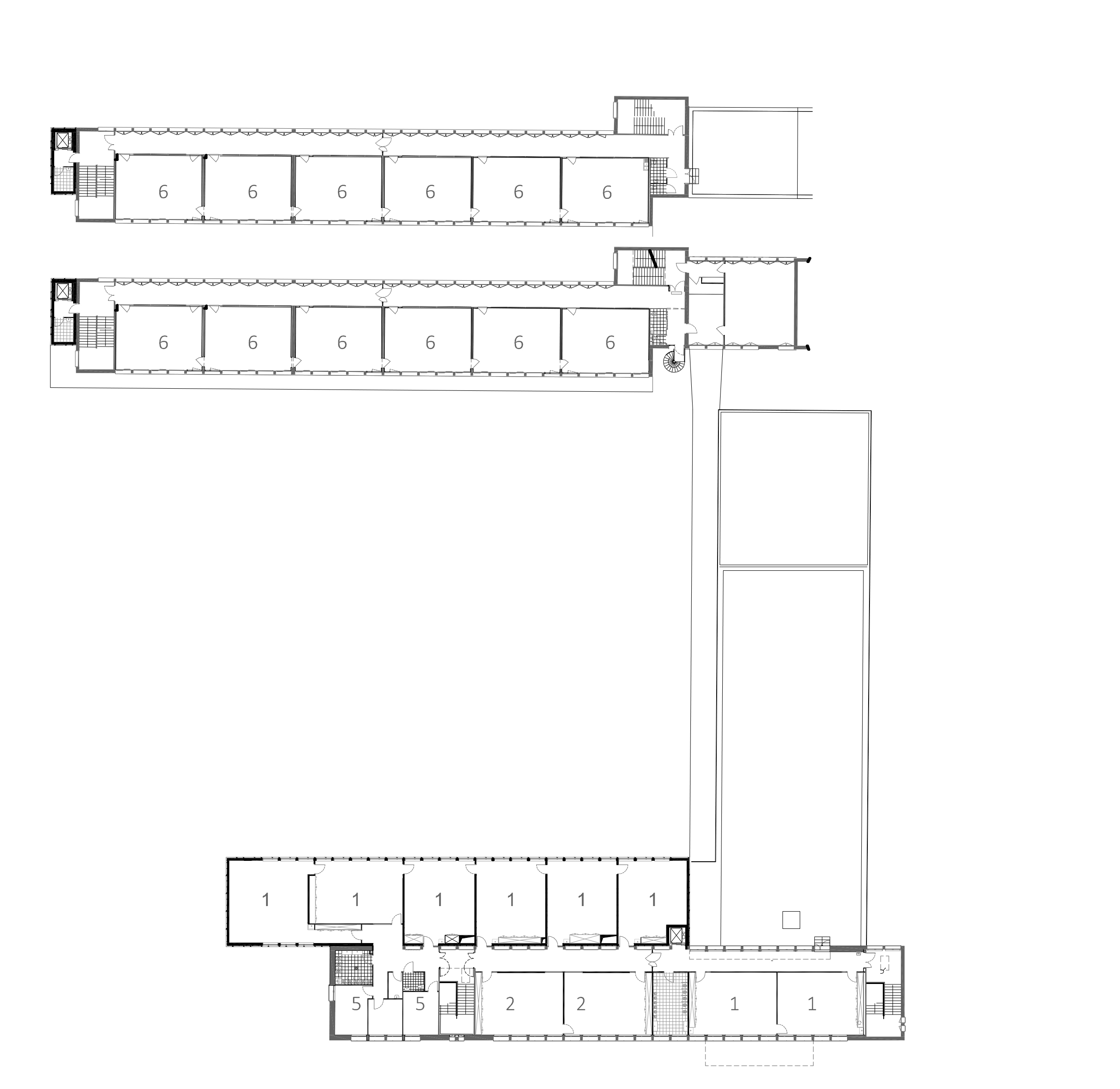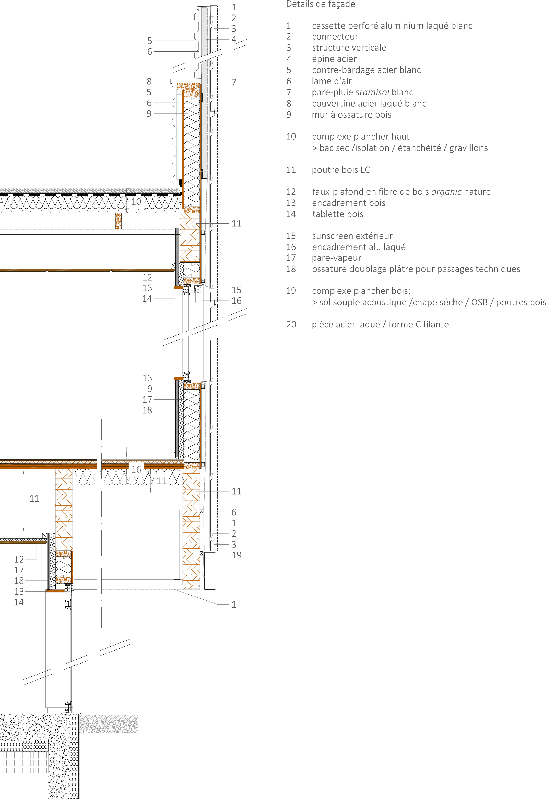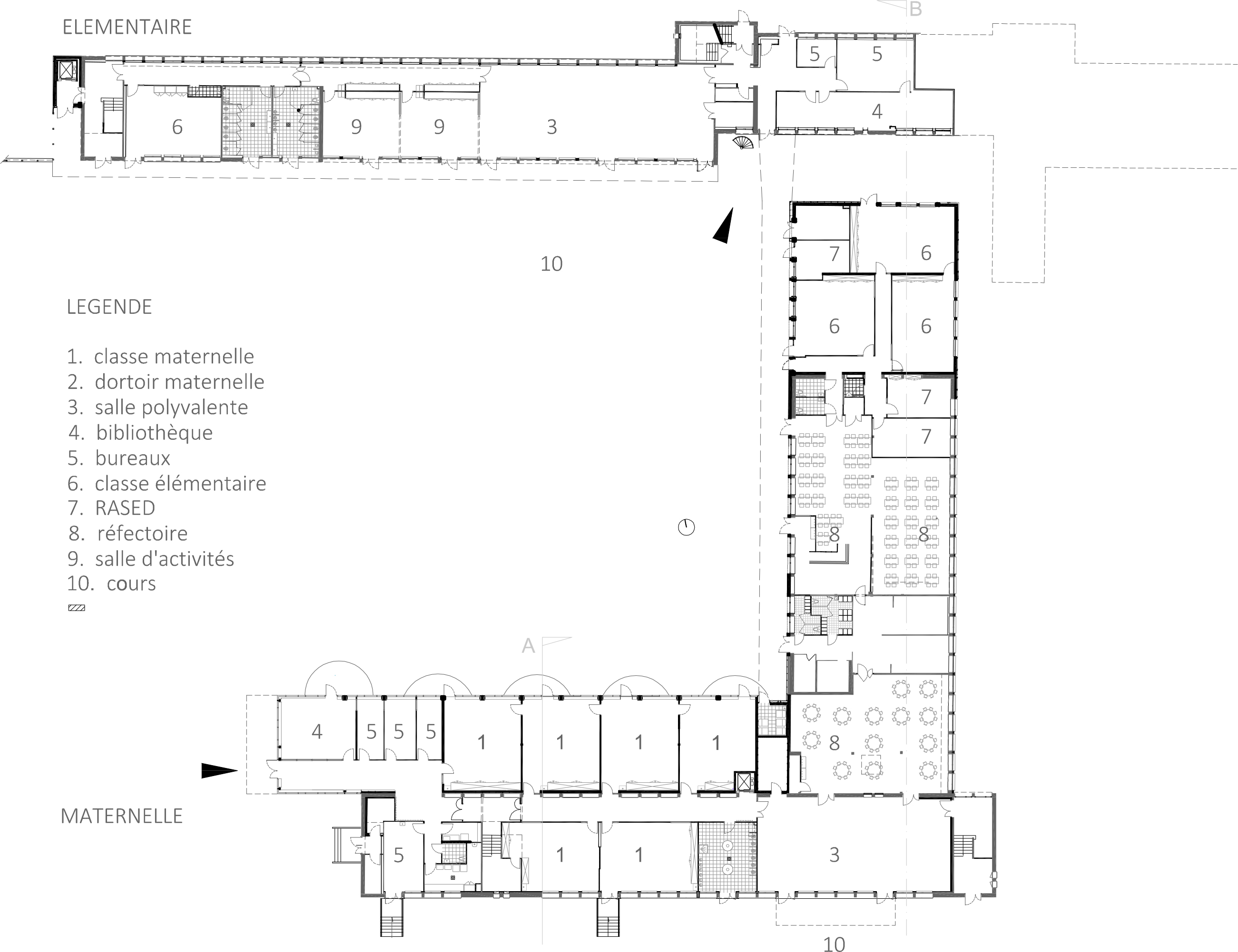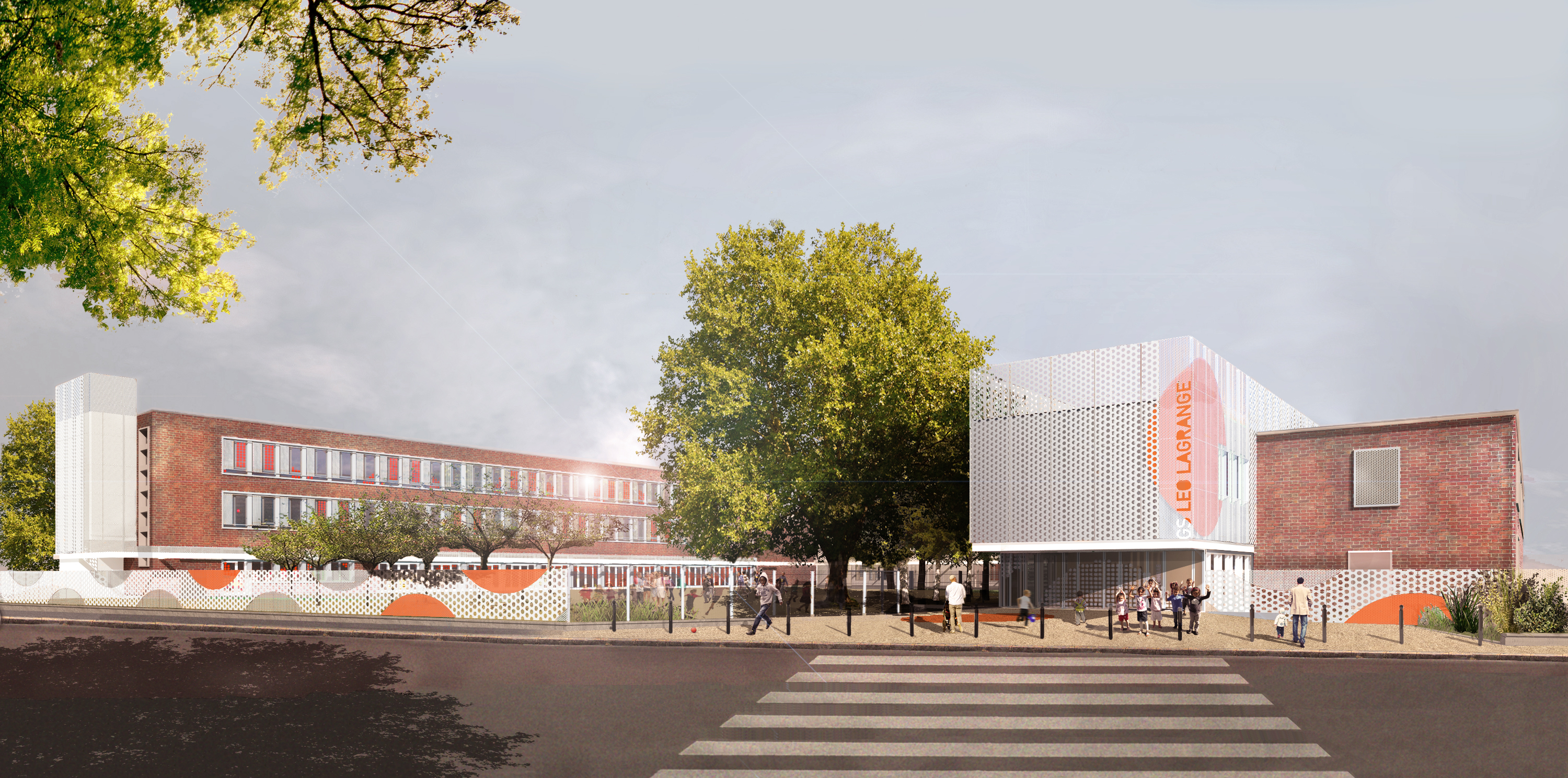 Le projet instaure un dialogue entre l’histoire du lieu et la nouvelle image de l’école. Il respecte le bâtiment d’origine en conservant la brique soulignée de modénatures de béton peint, caractéristique des architectures fonctionnalistes de l’après-guerre. Les extensions, réalisées en structure bois, sont vêtues de métal ajouré et contrastent avec l’existant. L’enveloppe en métal ajouré permet de mutualiser les fonctions de protection du bâtiment, de filtres solaires et de garde-corps. Programme: 17 classes élémentaires, 14 classes maternelles, salle polyvalentes, bibliothèque, réfectoire