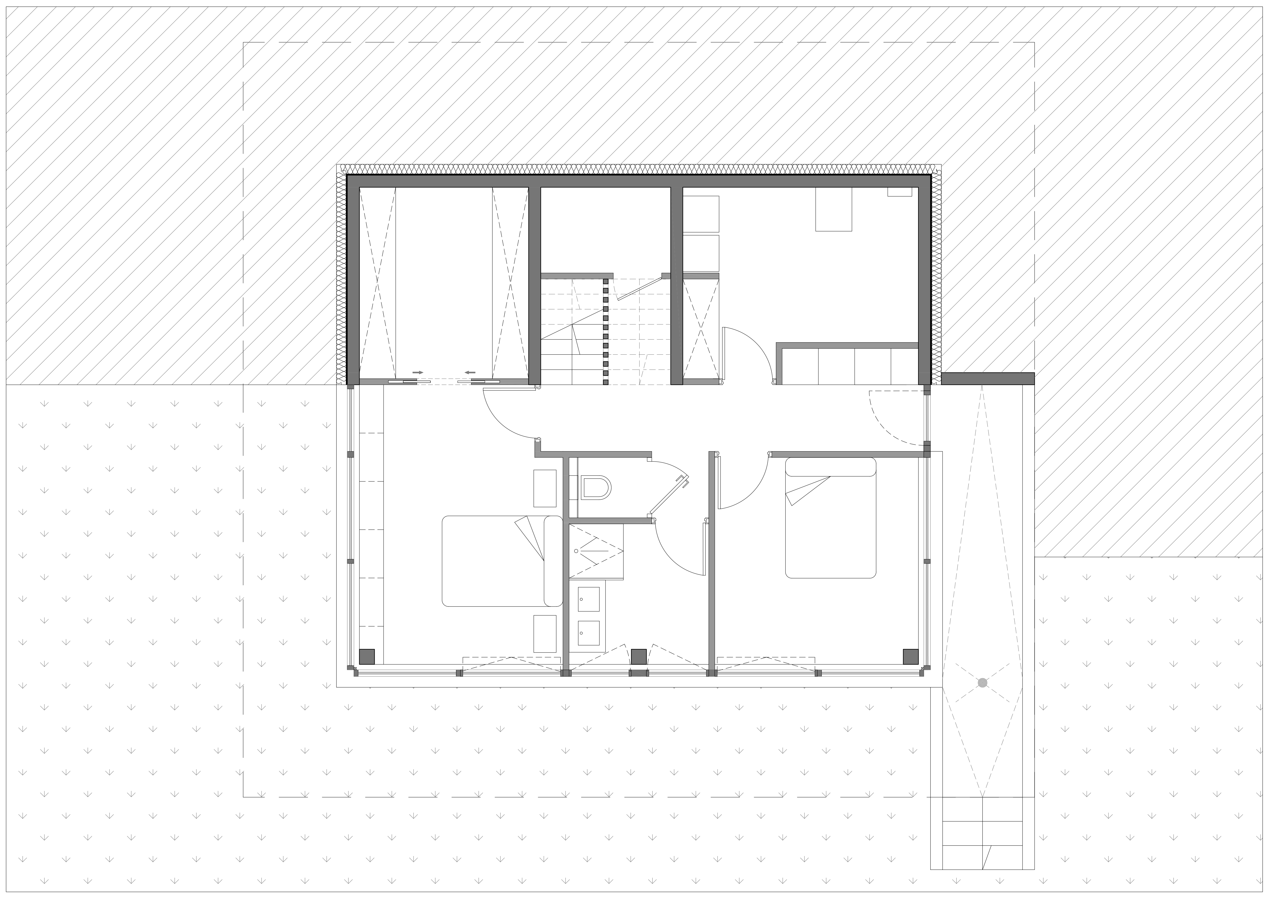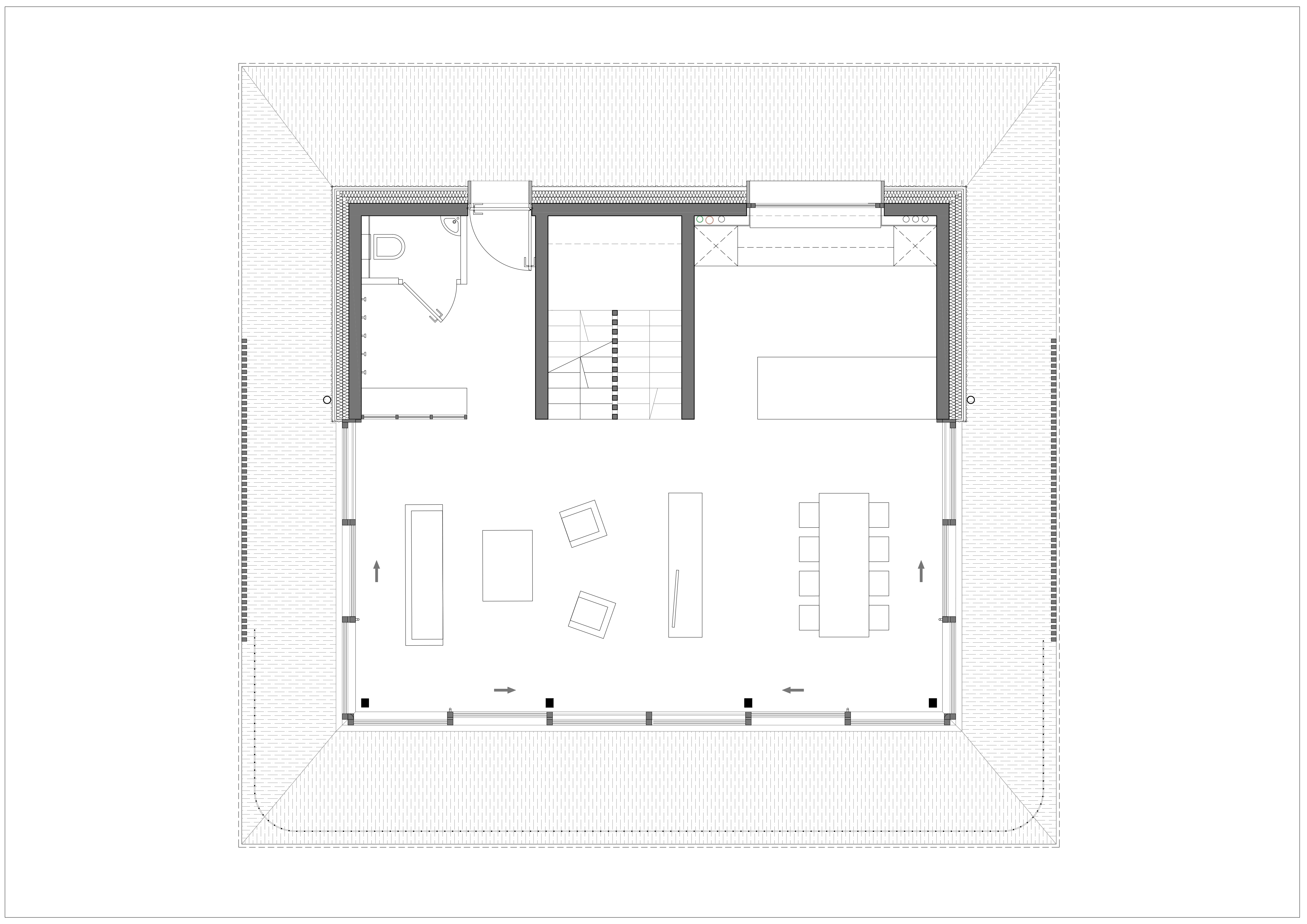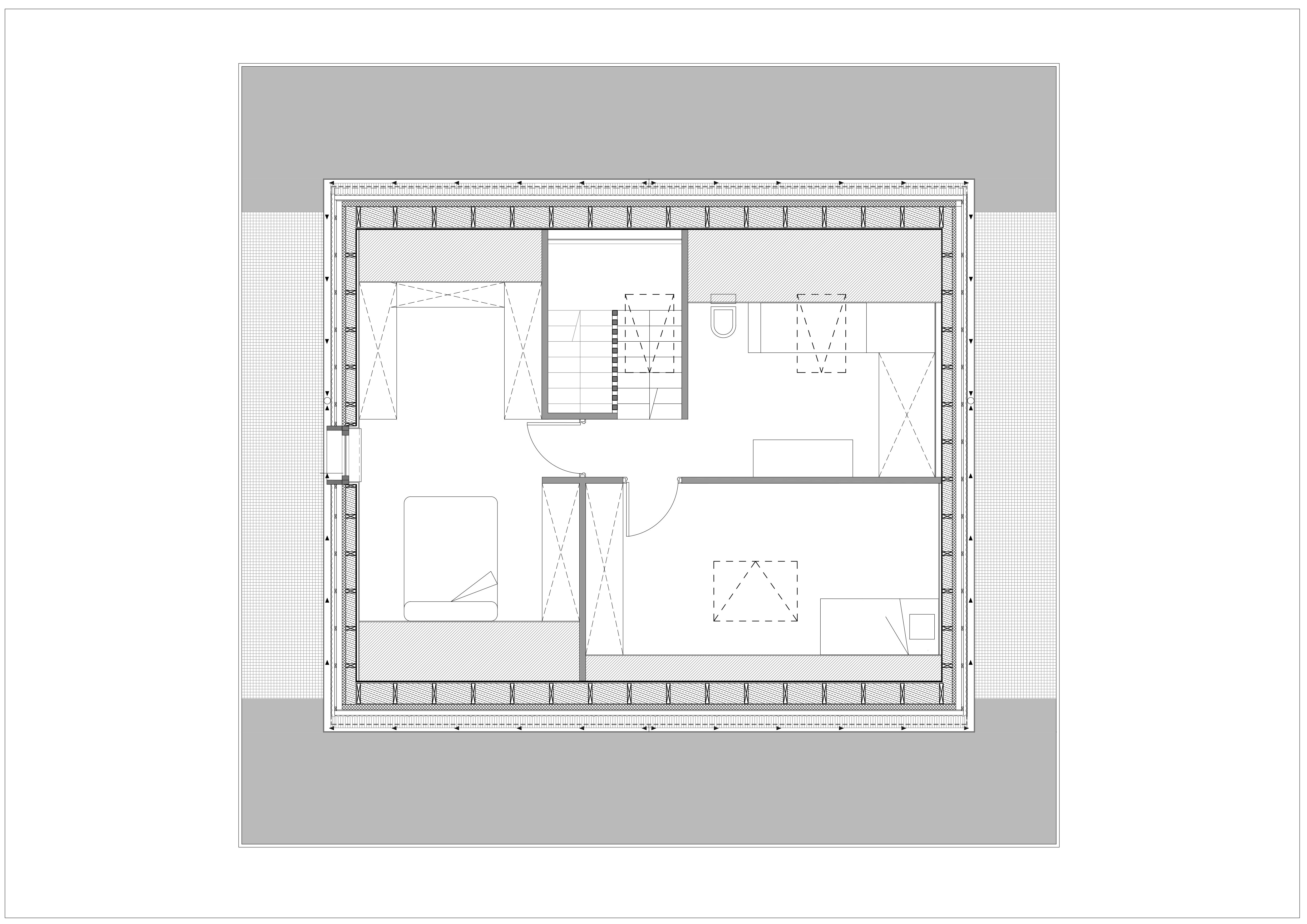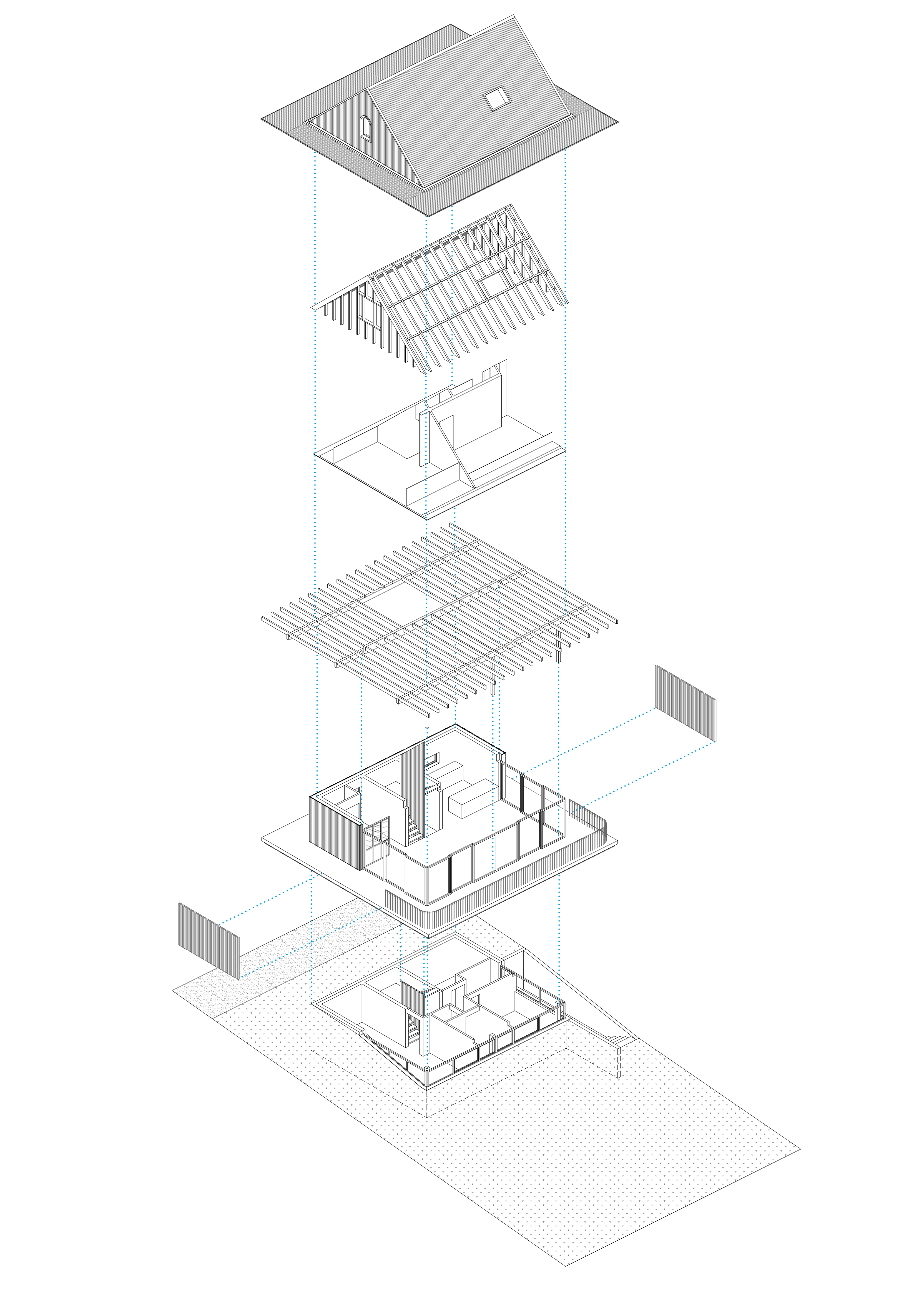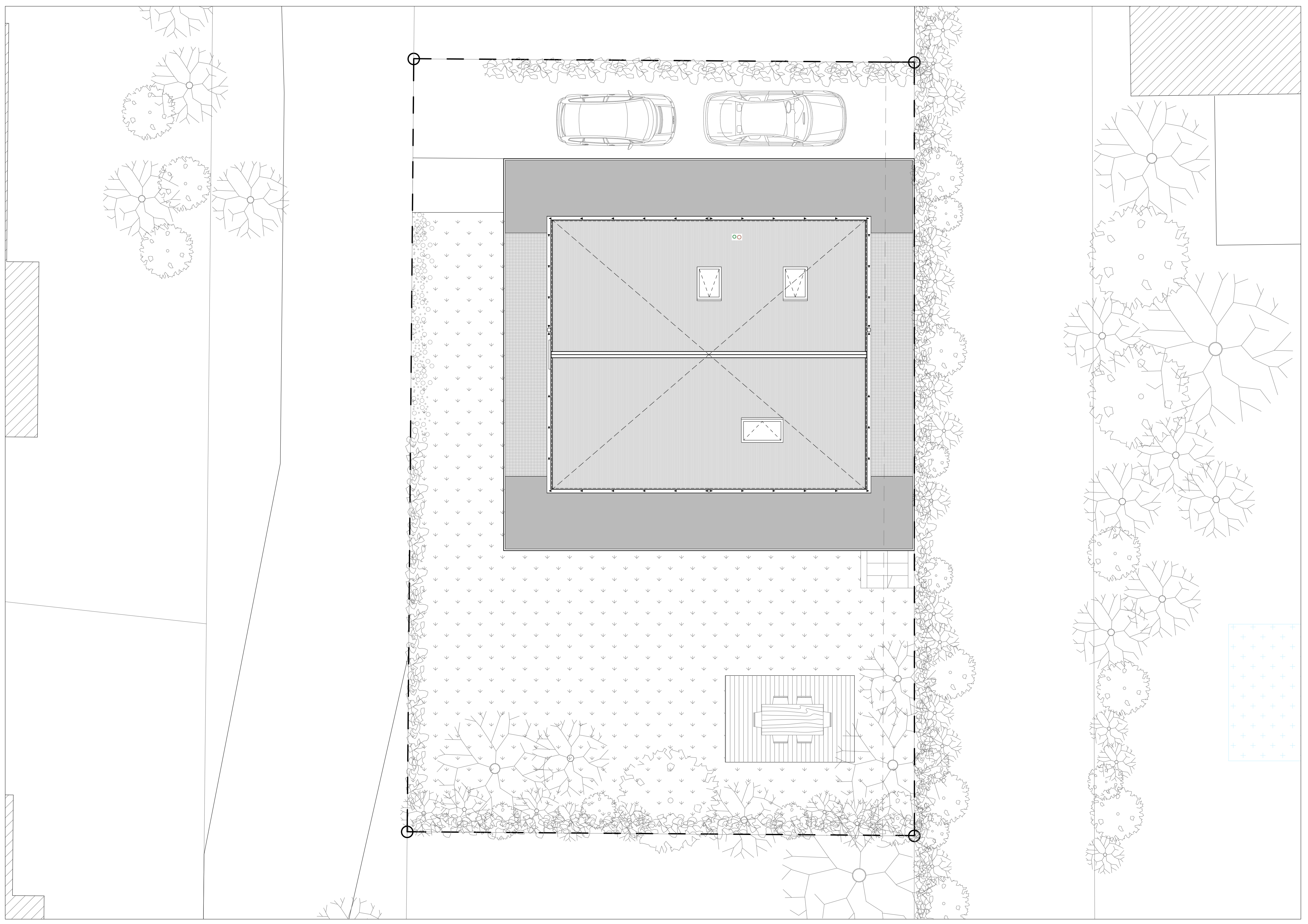 Du contexte pavillonnaire et réglementaire résulte la forme archétypale de la maison à double pans. Celle-ci est augmentée d’une terrasse périphérique abritée d’un débord de toiture formant alternativement couverture pleine et brise-soleils en caillebotis acier. La charpente apparente en mélèze vosgien forme une continuité intérieure/extérieure forte et donne un côté exotique et chaleureux à cette pagode pourtant bien alsacienne. La matérialité façade/toiture en bardage acier d’un vert/noir profond l’intègre dans le grand paysage arboré et rappelle les constructions agricoles environnantes.