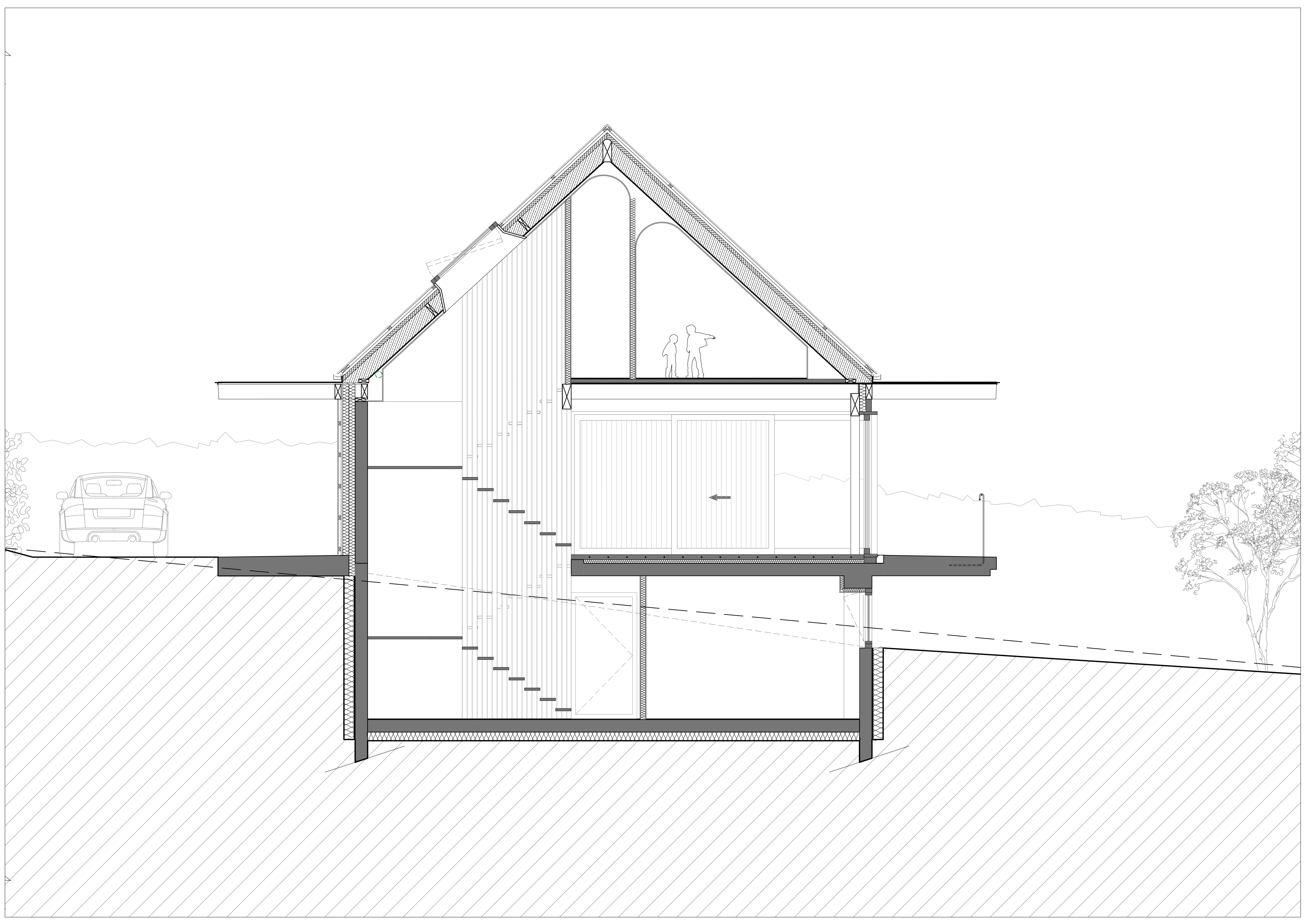 Approche environnementale : Encastrée dans la pente relativement forte (9 %) pour limiter son impact sur le paysage, la construction se développe sur un sous-sol en béton apparent vitré à hauteur de terrain. Au-dessus, l'ensemble du rez-de-chaussée et de l'étage sous combles est en construction bois (poteaux-poutres + murs ossatures bois pour les pignons). Toutes les structures apparentes (intérieures et extérieures) sont en mélèze vosgien, non traitées. Les isolants sont tous bio-sourcés (laine et fibres de bois). Le débord de toit forme une protection passive en été, et permet des apports généreux en hiver.